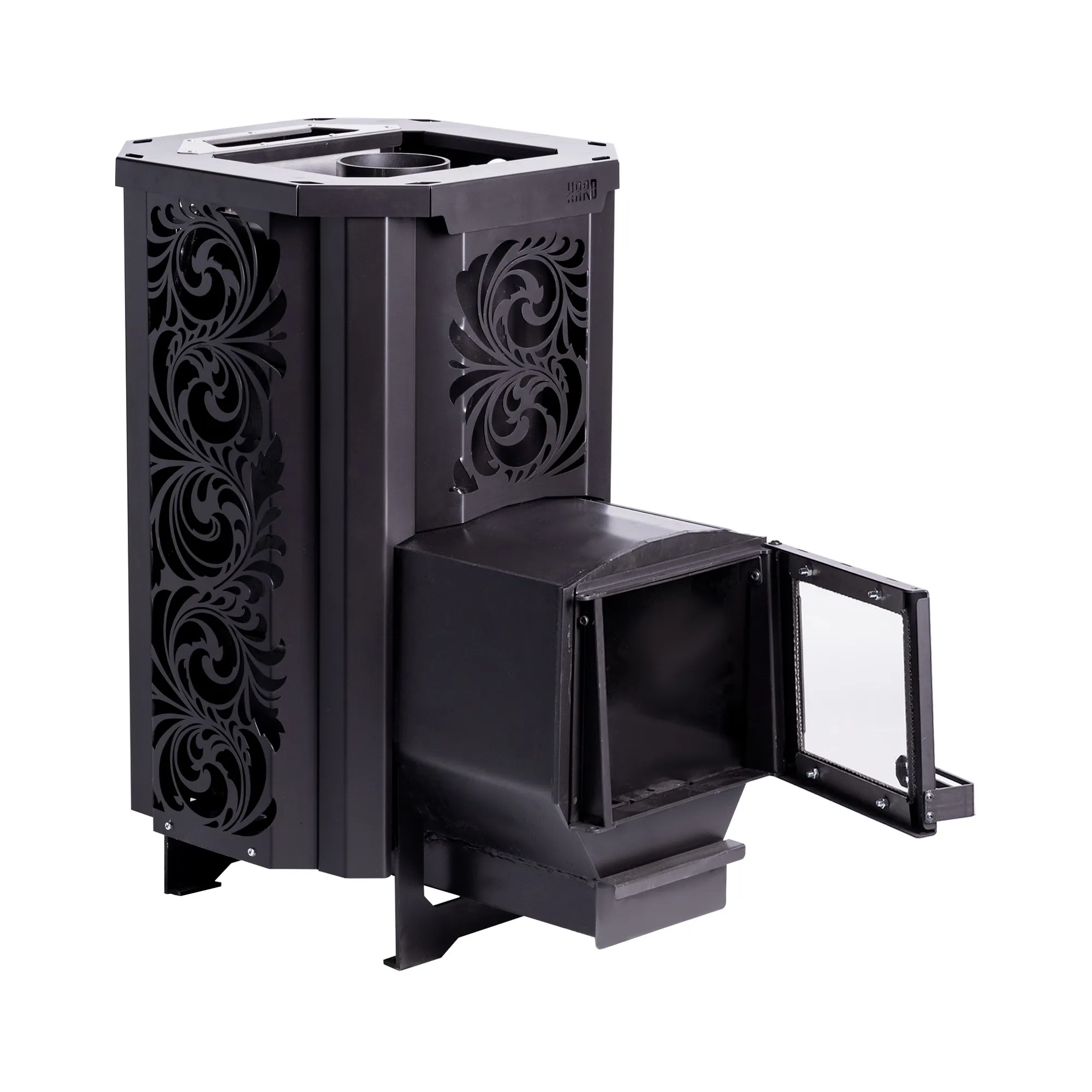 Печь из серии «HARD»® «Хохлома» 16М с выносом топки 180 см. Топка проходит через портал в стене бани. Дрова закладываются из смежного c парной помещения. Уникальный узор облицовки печи разработан мастерами из Хохломы и придаёт печи притягательный и изысканный облик. Топка изготовлена из конструкционной стали 09Г2С толщиной 6 мм. Печь «HARD»® Хохлома оснащена закрытой каменкой из нержавеющей стали AISI 201, толщиной 3 мм, а так же имеет увеличенную по высоте топку, что позволяет эффективнее прогревать камни в закрытой каменке и парильное помещение. Дверца приобретается отдельно.