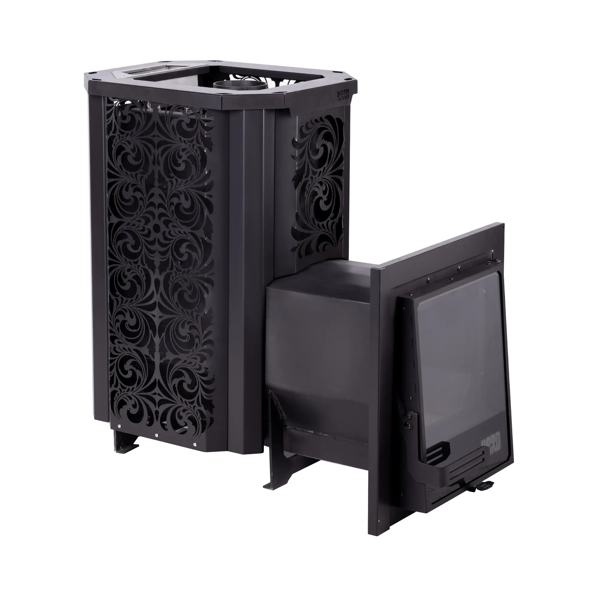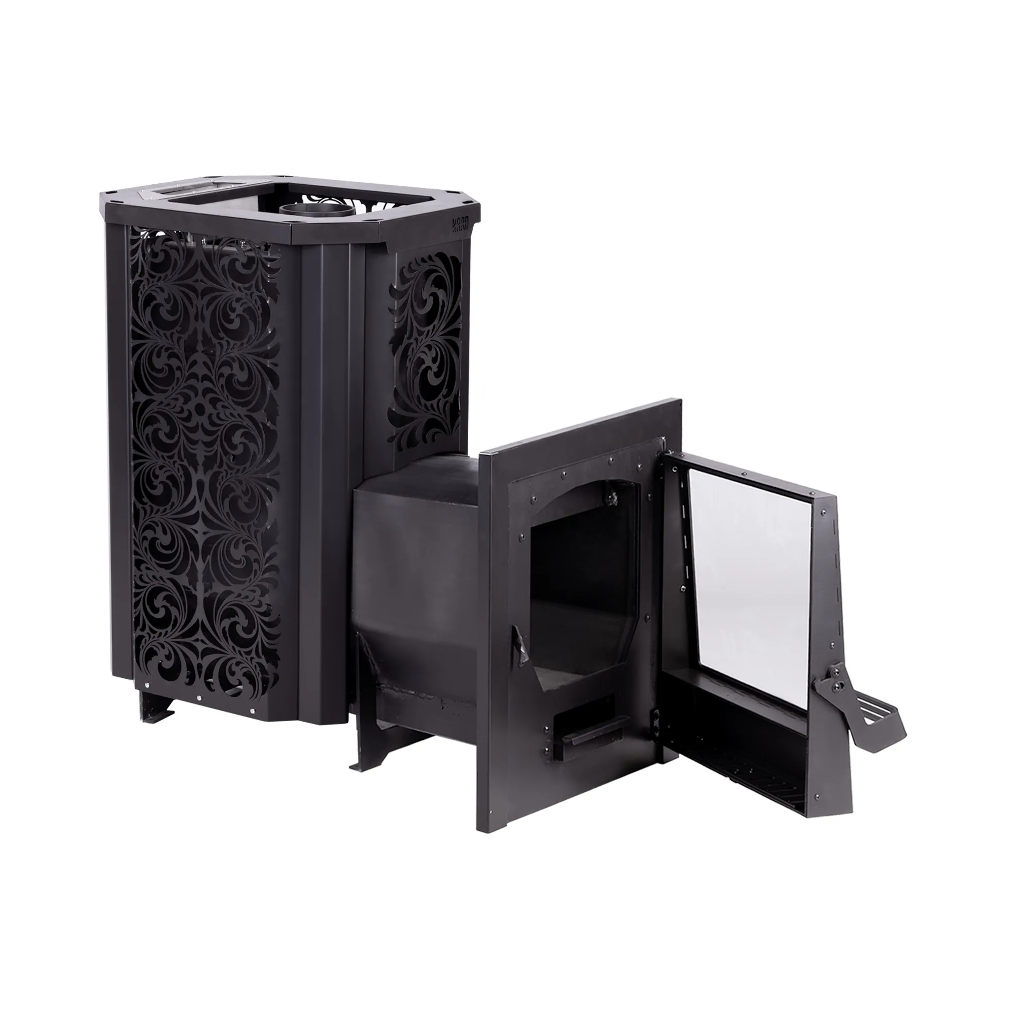 Печь из серии «HARD»® «Хохлома» 30L с выносом топки 280 см. Топка проходит через портал в стене бани. Дрова закладываются из смежного c парной помещения. Уникальный узор облицовки печи разработан мастерами из Хохломы и придаёт печи притягательный и изысканный облик. Топка изготовлена из конструкционной стали 09Г2С толщиной 6 мм. Печь «HARD»® Хохлома оснащена закрытой каменкой из нержавеющей стали AISI 201, толщиной 3 мм, а так же имеет увеличенную по высоте топку, что позволяет эффективнее прогревать камни в закрытой каменке и парильное помещение. Печь оборудована дверцей с панорамным стеклом. Такая дверца создает визуальную иллюзию камина, что придаёт интерьеру особую атмосферу. Помимо эстетической составляющей, стекло в дверце при работе печи аккумулирует тепло и способствует обогреву помещения.