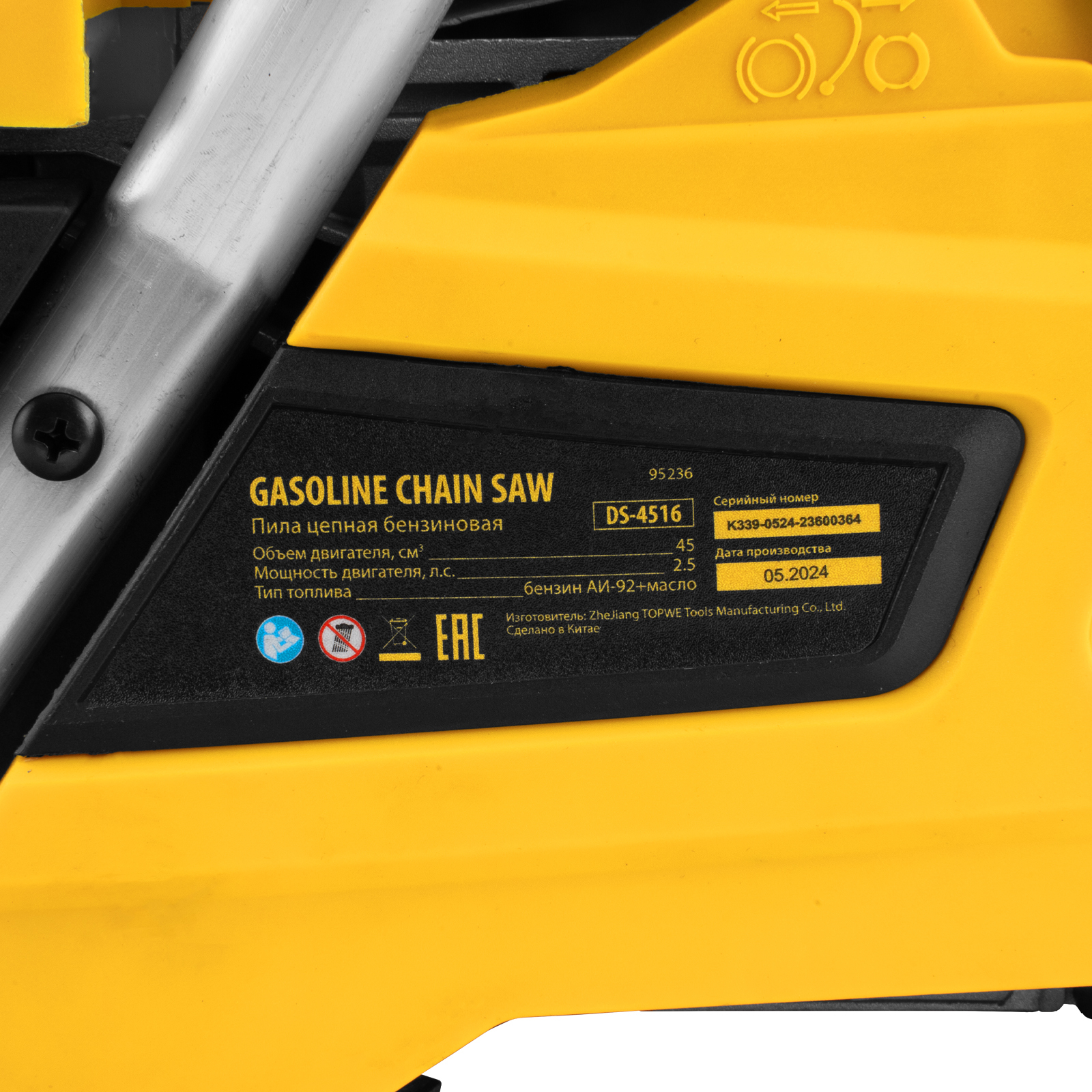 - Полный комплект поставки — инструменты для обслуживания, свечной ключ и емкость для приготовления топливной смеси прилагаются к пиле.