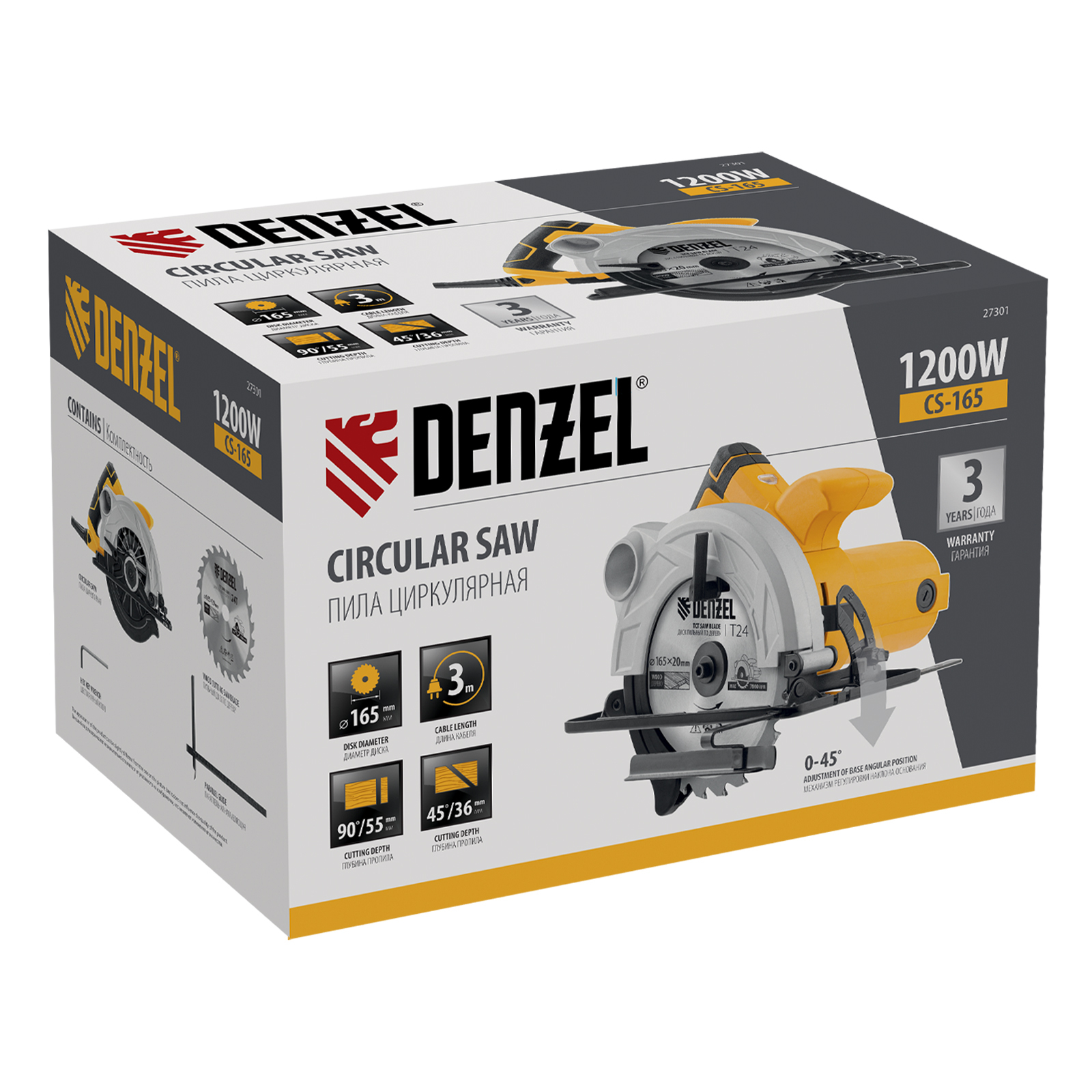 Циркулярная пила Denzel CS-165 мощностью 1200 Вт с пильным диском диаметром 165 мм предназначена для реза листового пиломатериала, ДСП, ДВП, а также для раскроя фанеры. Самая компактная из линейки Denzel CS, она весит всего 3,6 кг — это значительно снижает нагрузку на руки мастера и позволяет управлять инструментом одной рукой.,Двигатель мощностью 1,2 кВт обеспечивает частоту вращения пильного диска 5500 об/мин. Специальный рычаг-фиксатор позволяет легко регулировать глубину пропила от 0 до 55 мм.