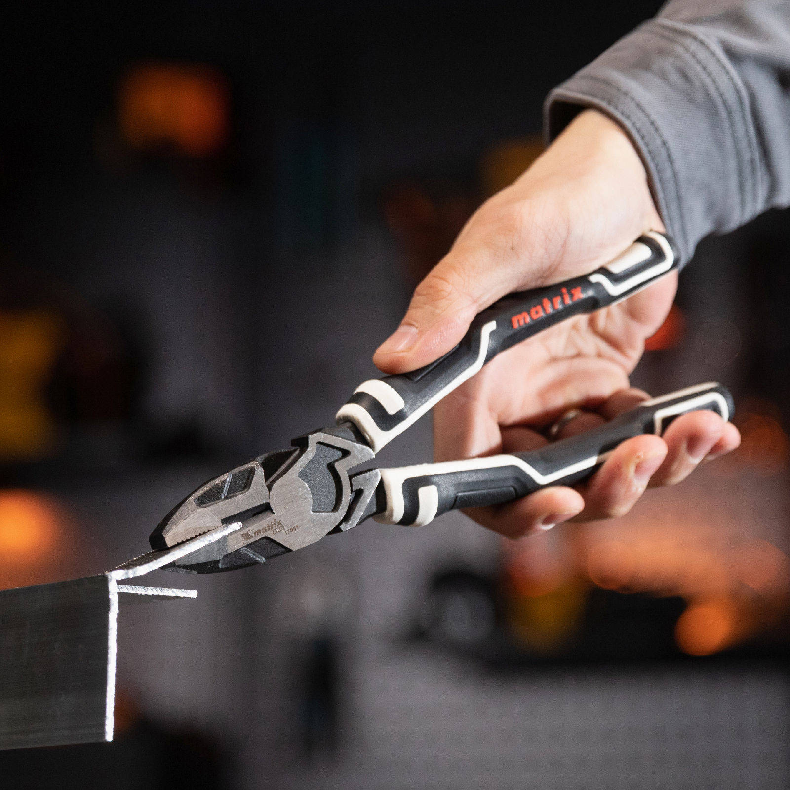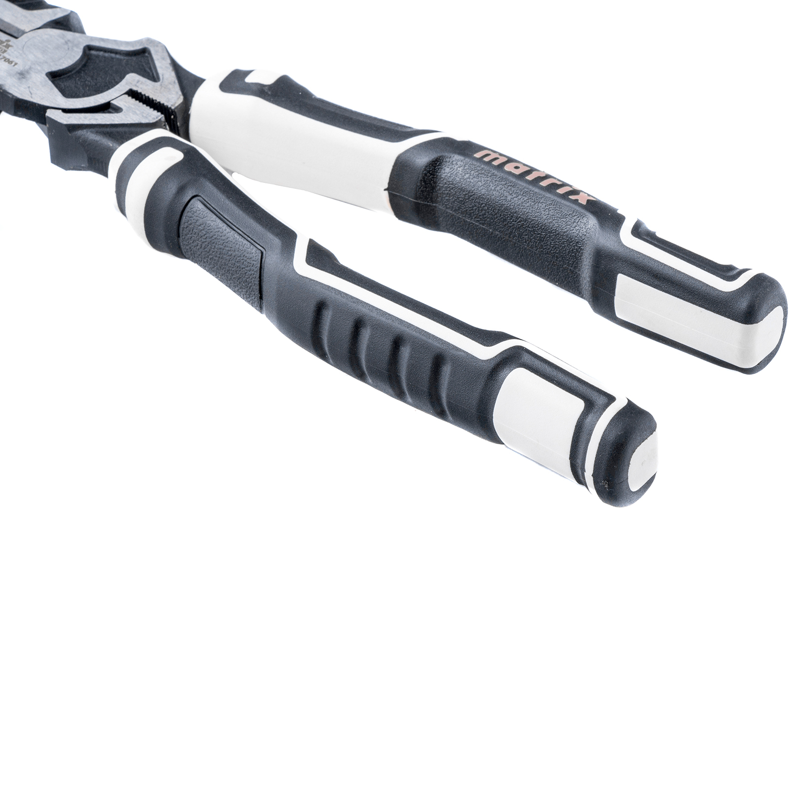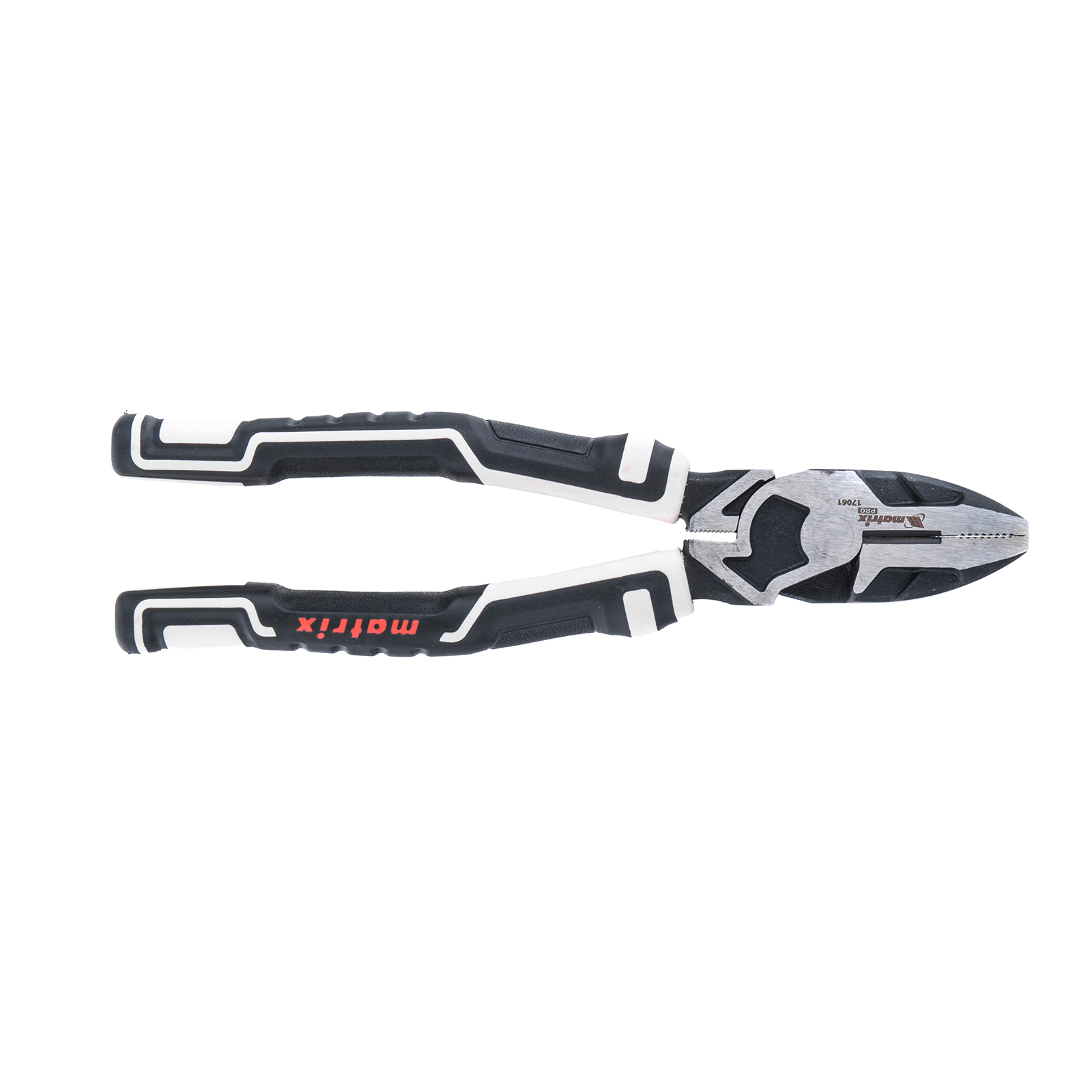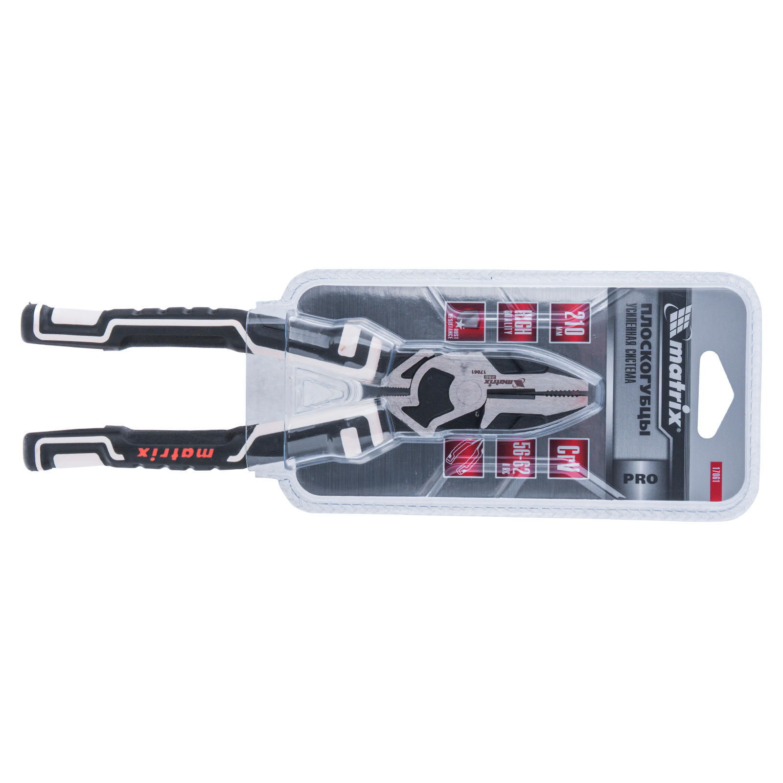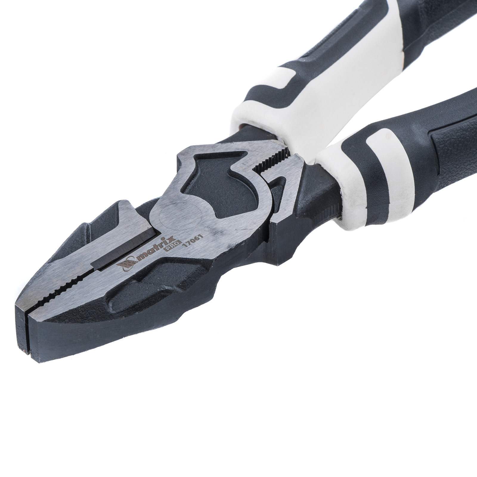 Комбинированные плоскогубцы Matrix PRO 17061 длиной 210 мм, с усиленной системой, используются для фиксации и удерживания плоских деталей, а также разрезания проволоки или проводов. Шарнир смещен к режущим кромкам, что позволяет передавать большее усилие и увеличивает эффективность реза. Плоскогубцы предназначены для профессионального применения в сфере строительства и ремонта.