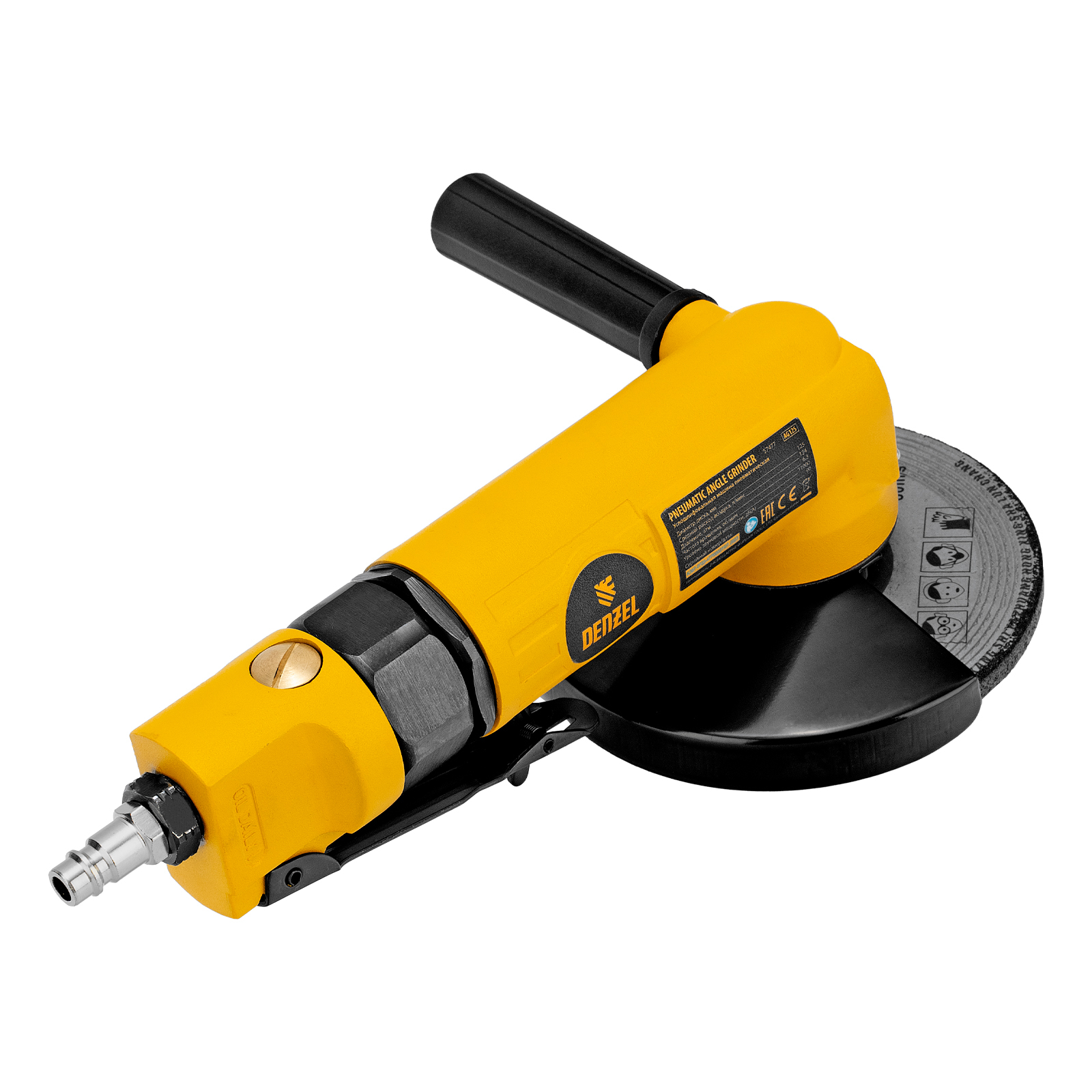Пневматическая углошлифовальная машина Denzel AG125 57477 используется с дисками до 125 мм для шлифования, зачистки, резки деревянных, металлических, пластмассовых и других материалов. Это универсальный инструмент, востребованный в строительстве, ремонте, незаменимый для домашних мастерских и решения бытовых задач. Частота вращения диска 11000 об/мин при среднем расходе воздуха 186 л/мин обеспечивает высокую производительность и скорость работы. Оптимальная скорость редуктора позволяет быстро и качественно обрабатывать поверхности.,УШМ предназначена для работы при давлении 6,3 бар, расход воздуха в среднем не превышает 200 л/мин. Во время работы не забывайте использовать специальное масло ISO 46, которое можно добавлять как напрямую в инструмент, так и с помощью блока подготовки воздуха Denzel 57469, включающего в себя лубрикатор для автоматической подачи масла.