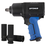 Пневматический ударный гайковерт OPTIMUS OPT-PW2050L с набором тонкостенных шестигранных ударных головок: 17, 19, 21 мм. Предназначен для проведения монтажных и демонтажных работ с крепежом, работает от источника сжатого воздуха. Используется на СТО, производственных предприятиях, в сборочных цехах. Надежный и долговечный ударный механизм Twin Hammer обеспечивает мгновенный сбалансированный удар и минимальную вибрацию. Модель OPT-PW2050L оснащена пятью режимами работы: 4 на закручивание и 1 максимальный на откручивание. Благодаря кнопочному переключателю можно управлять направлением вращения и работать одной рукой. Легкий и прочный композитный корпус защищает внутреннее устройство от механических воздействий. Подходит для работы как с мягкими, так и с жесткими соединениями.