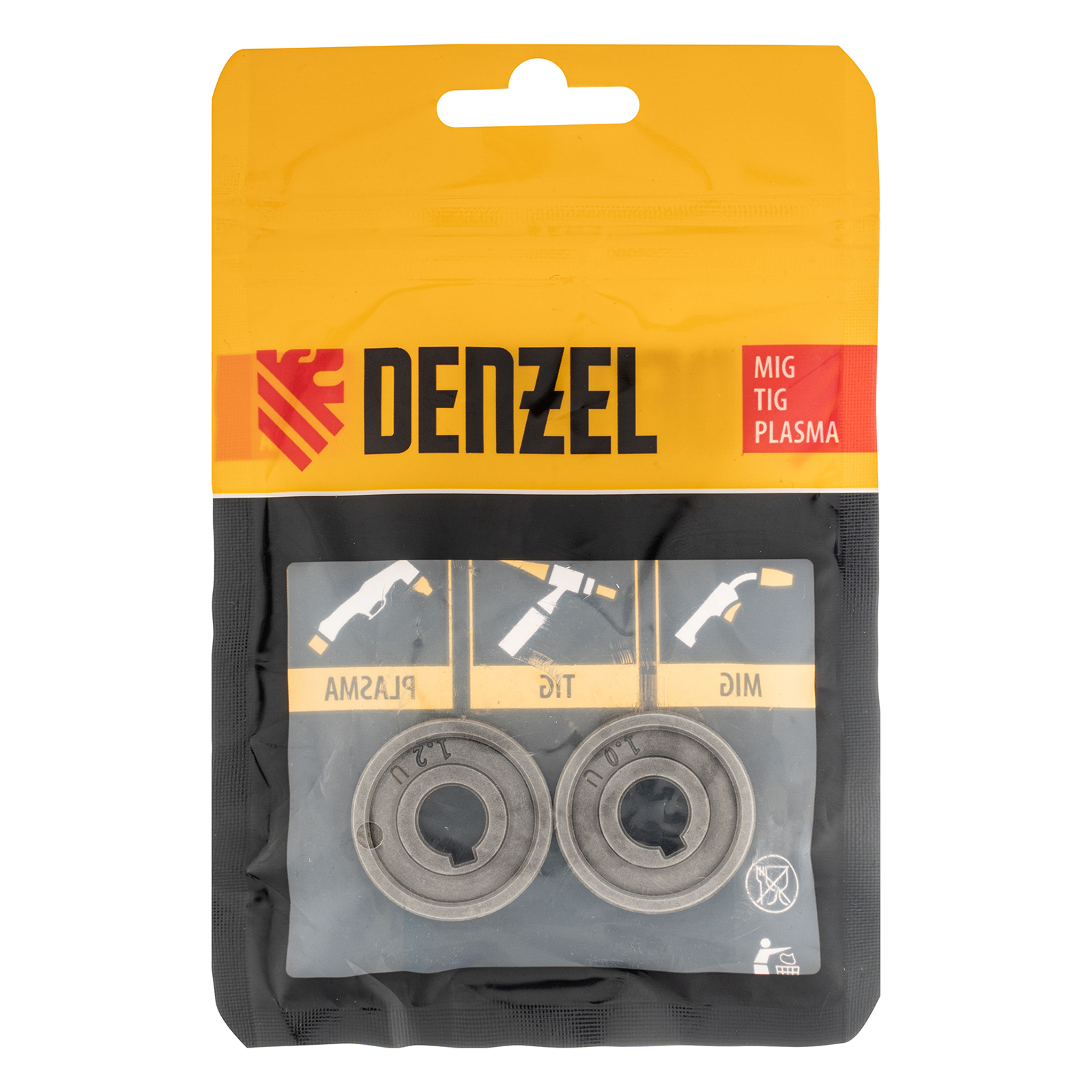 Подающий ролик Denzel 93654 с U-профилем, 2 шт. в упаковке, — элемент конструкции сварочного аппарата, предназначенный для протягивания алюминиевой проволоки диаметром 1,0-1,2 мм. Совместим с моделями Denzel 94313, 94314, 94361, а также со сварочными полуавтоматами других торговых марок.