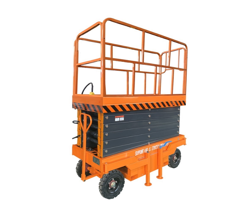 Модель оснащена аккумулятором, подъем площадки осуществляется за счет работы электромотора, передвижение за счет внешнего усилия.
