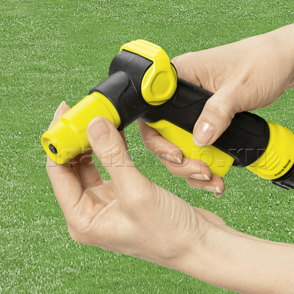 Плавная регулировка формы струи (от точечной до конической). Удобная регулировка расхода воды одной рукой (мин. - макс.) Простая фиксация рычага для непрерывного полива.