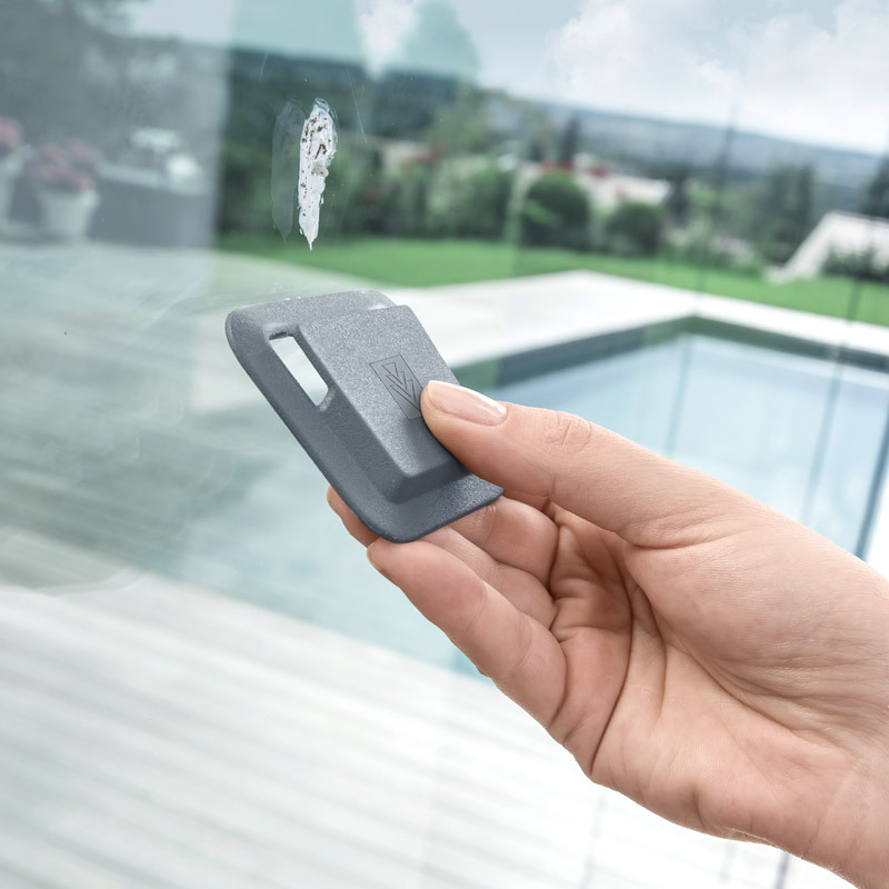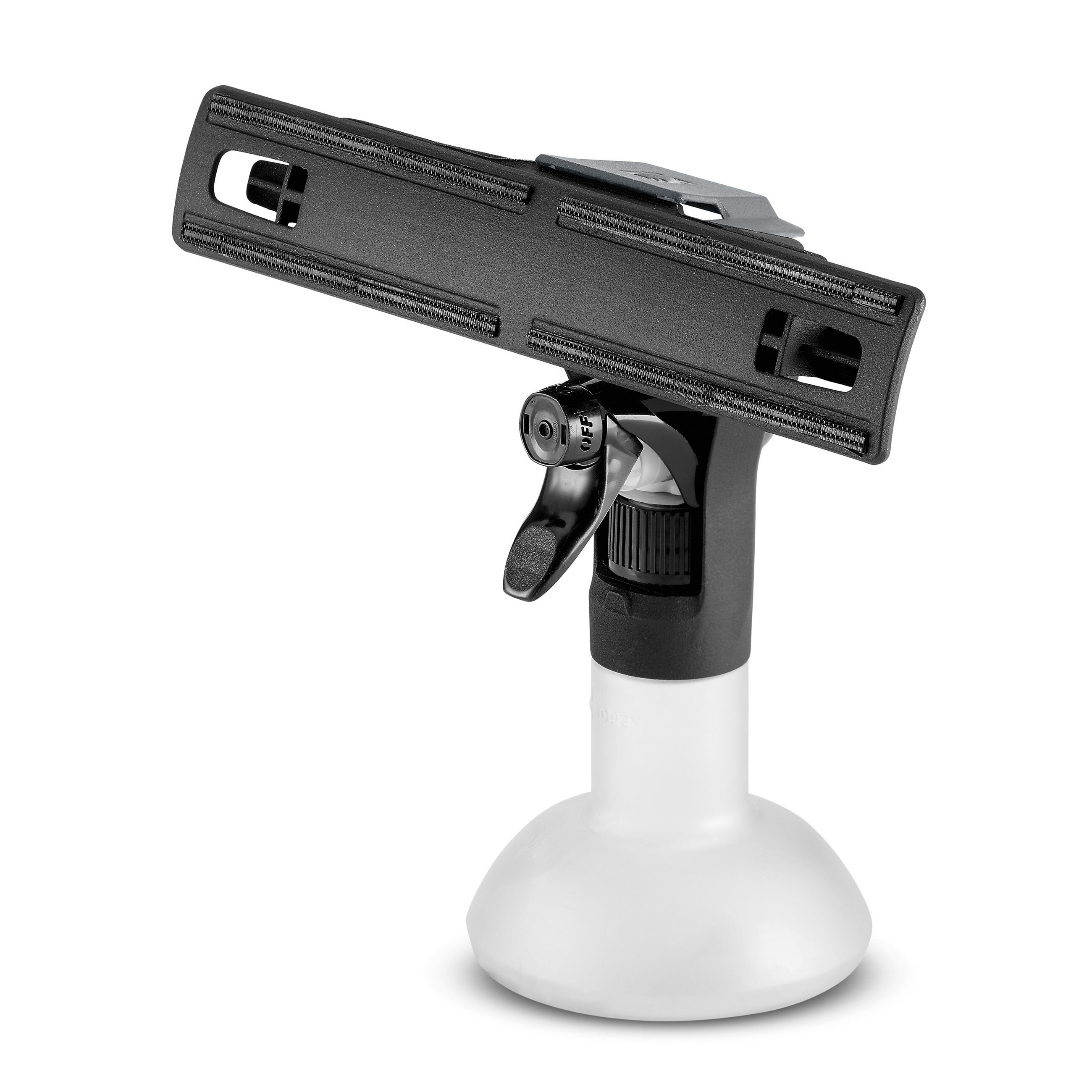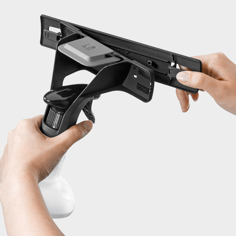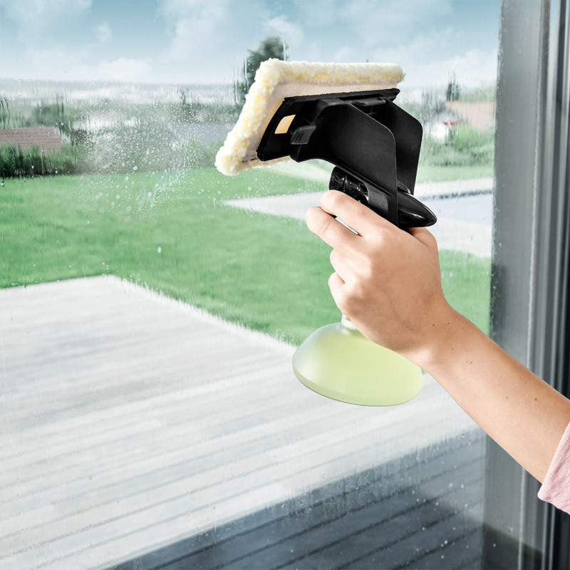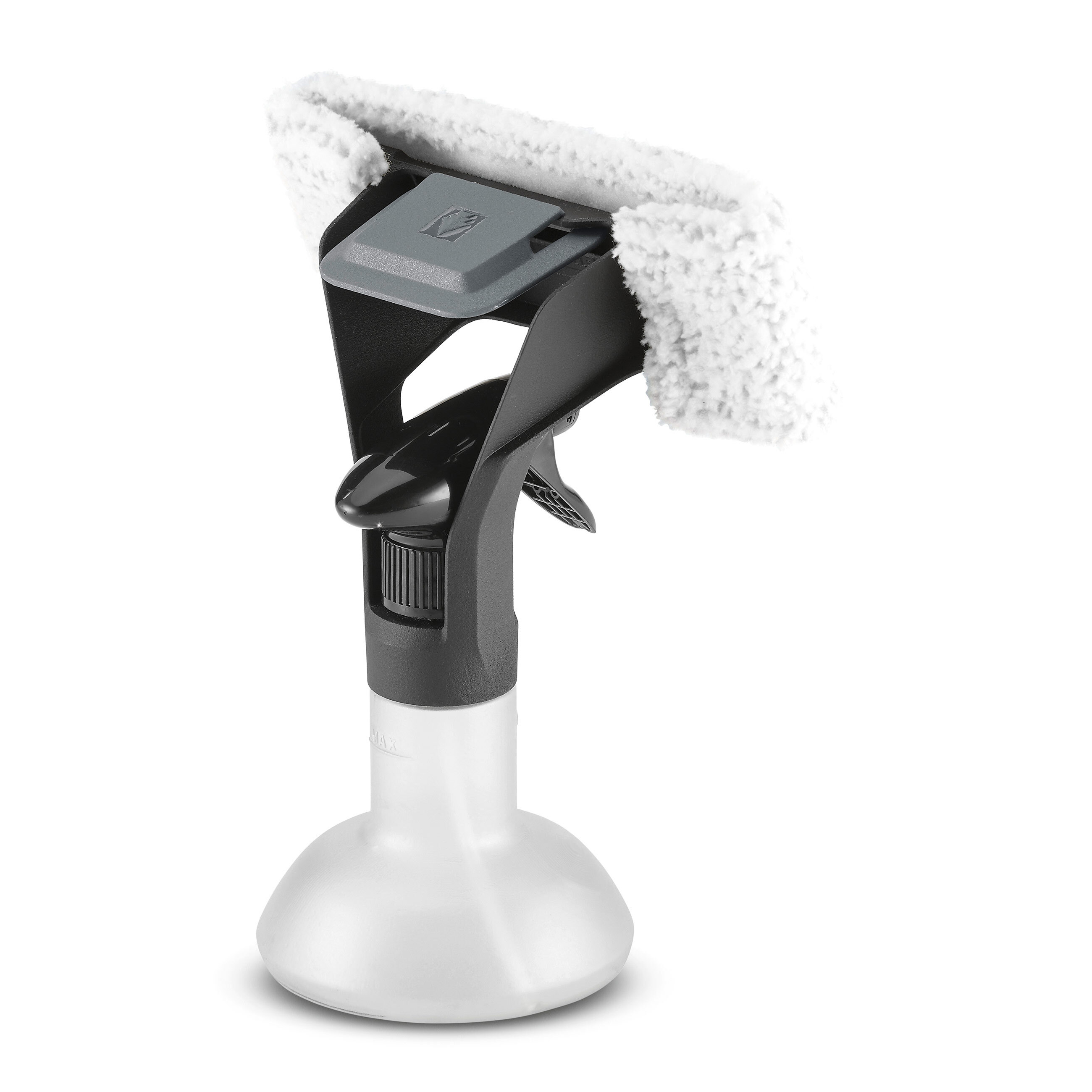 Комплект для мойки гладких поверхностей с использованием аккумуляторного стеклоочистителя Karcher WV включает пульверизатор с насадкой регулируемой рабочей ширины для протирания, обтяжку из микроволокна с застёжкой-липучкой, скребок для удаления стойких загрязнений и концентрат средства для мойки окон (20 мл).