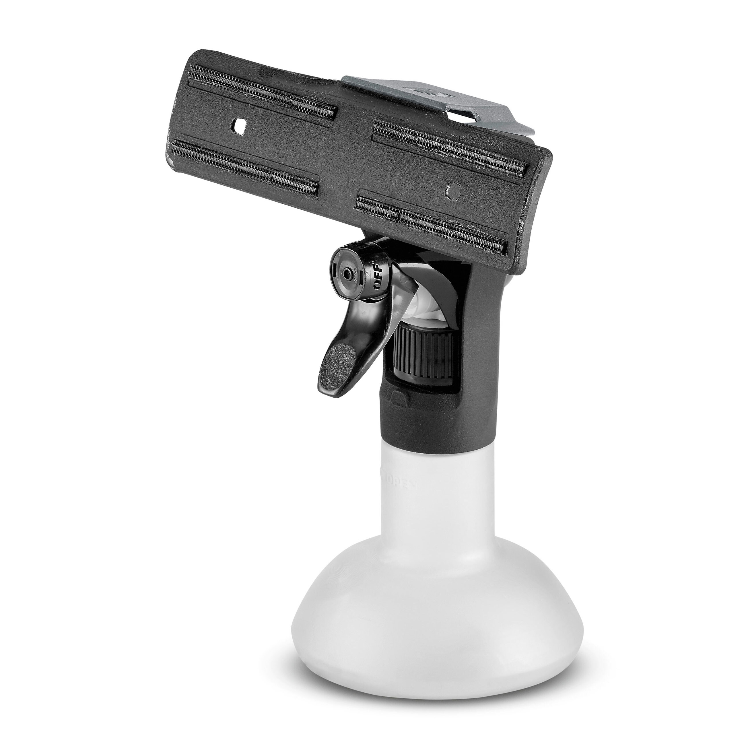 На флакон с моющим раствором накручивается насадка-держатель. Для очистки узких участков широкую насадку можно снять. Следом накручивается распылитель.