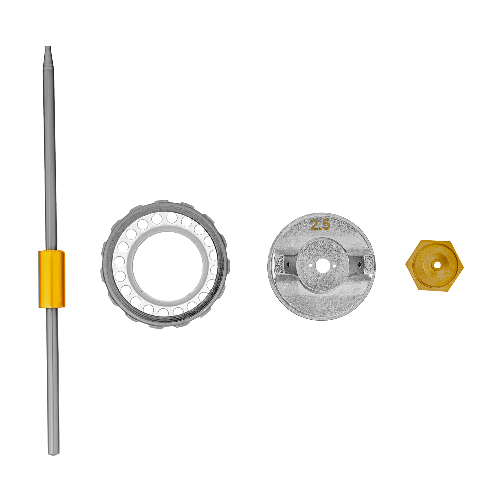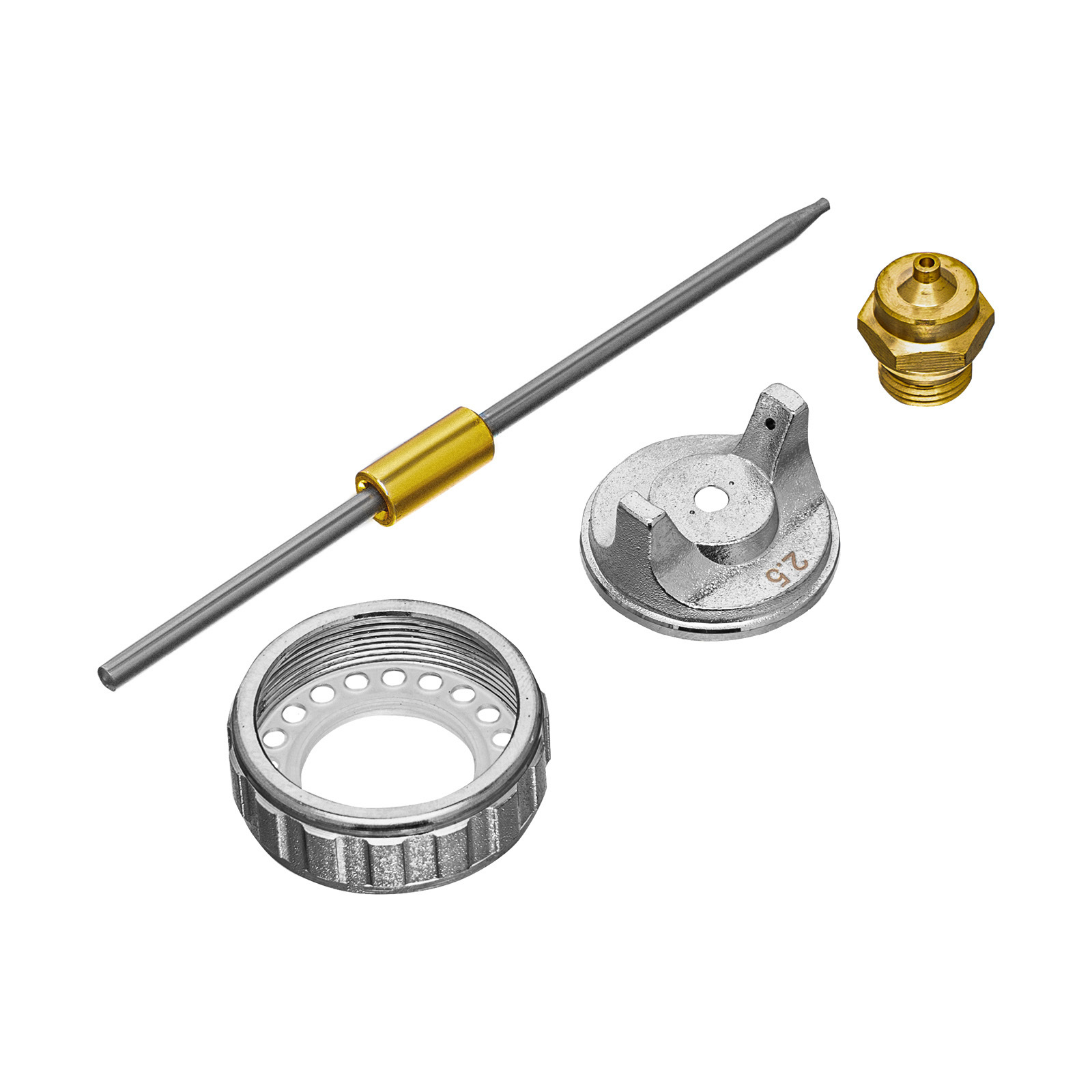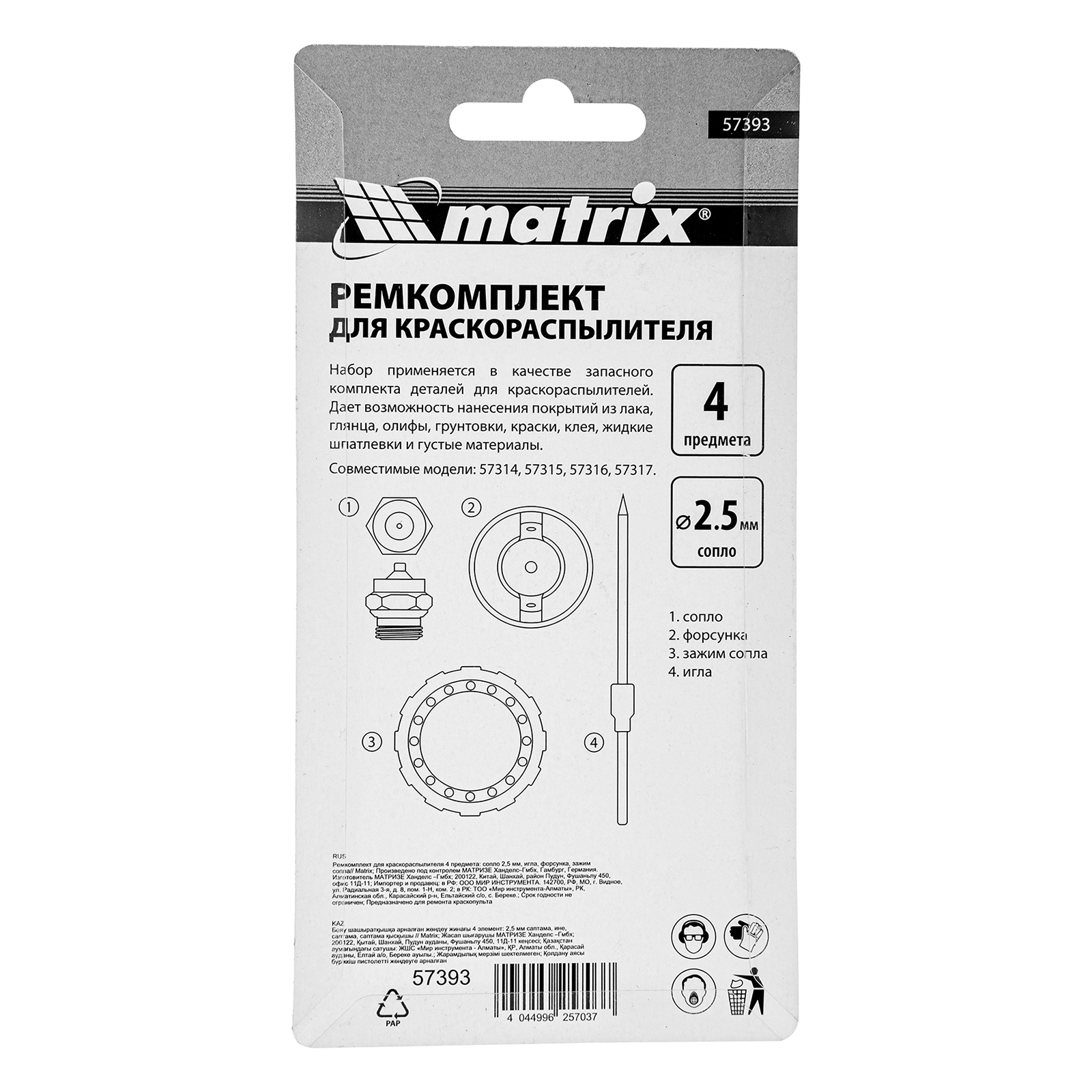 Ремкомплект для краскораспылителя Matrix 57393 состоит из 4 предметов: сопла диаметром 2,5 мм, иглы, форсунки и зажима сопла. Набор можно использовать для восстановления работоспособности краскопульта или расширения возможностей его использования. Совместимые краскопульты Matrix 57314, 57315, 57316, 57317.