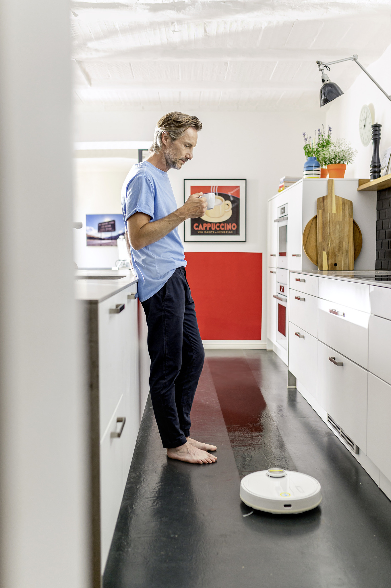 RCV 3 берет на себя всю заботу об уборке полов. После включения он самостоятельно систематически очищает как твердые напольные покрытия, так и ковры с коротким ворсом. Сухой мусор, сметаемый вращающейся щеткой и боковой щеткой для уборки по краям помещения, всасывается аппаратом и направляется во встроенный мусоросборник.