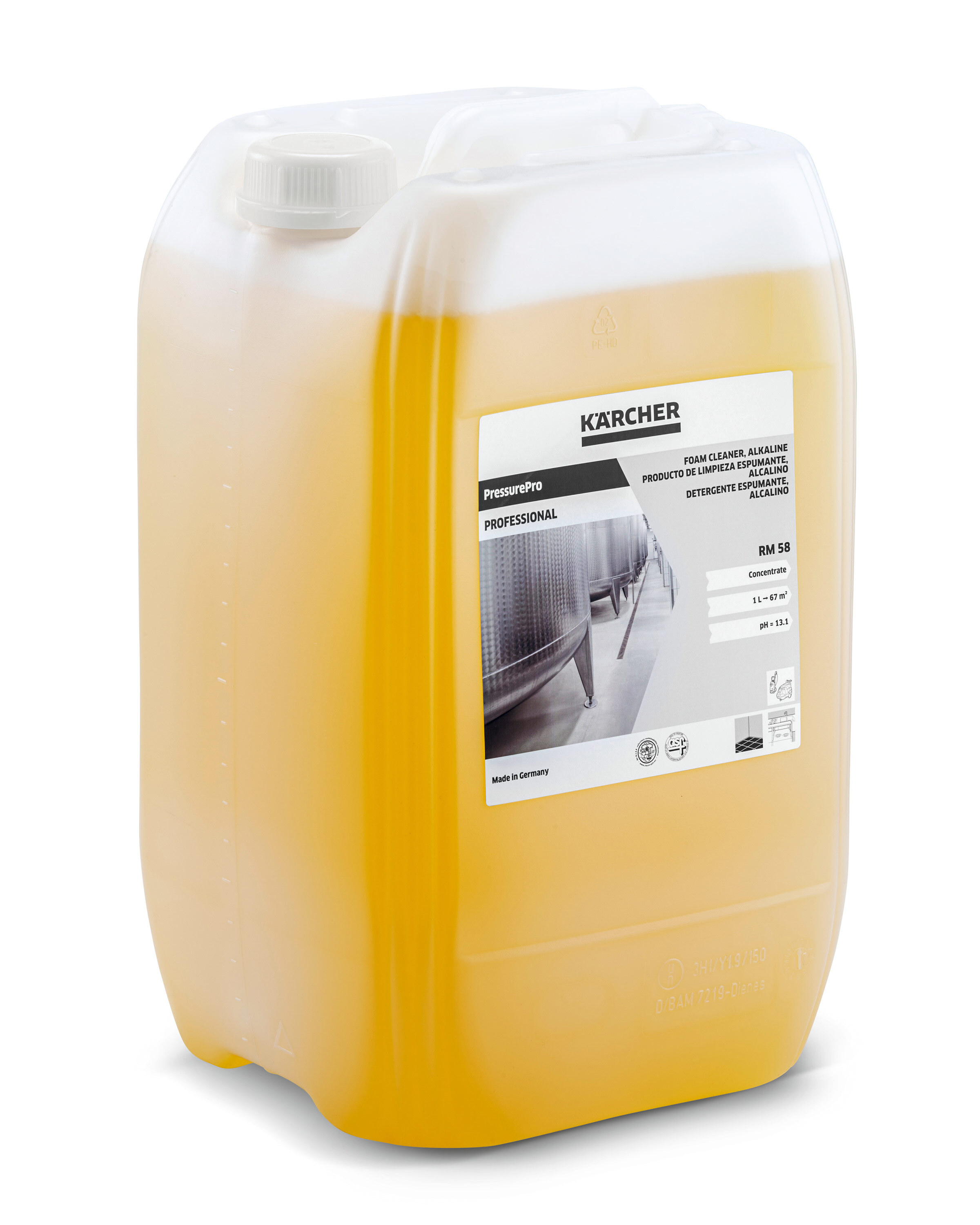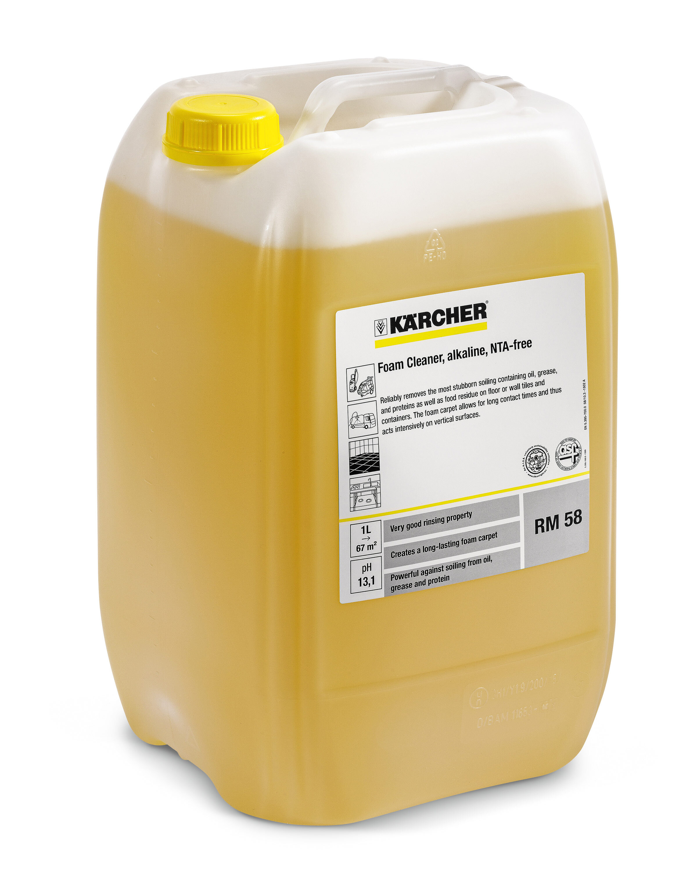 Karcher RM 58 ASF — щелочное средство для пенной чистки. Предназначено для удаления стойких масляных, жировых и белковых загрязнений, а также остатков пищевых продуктов с твердых поверхностей. Образует густой слой очищающей пены. Применяется на автомойках и промышленных предприятиях.