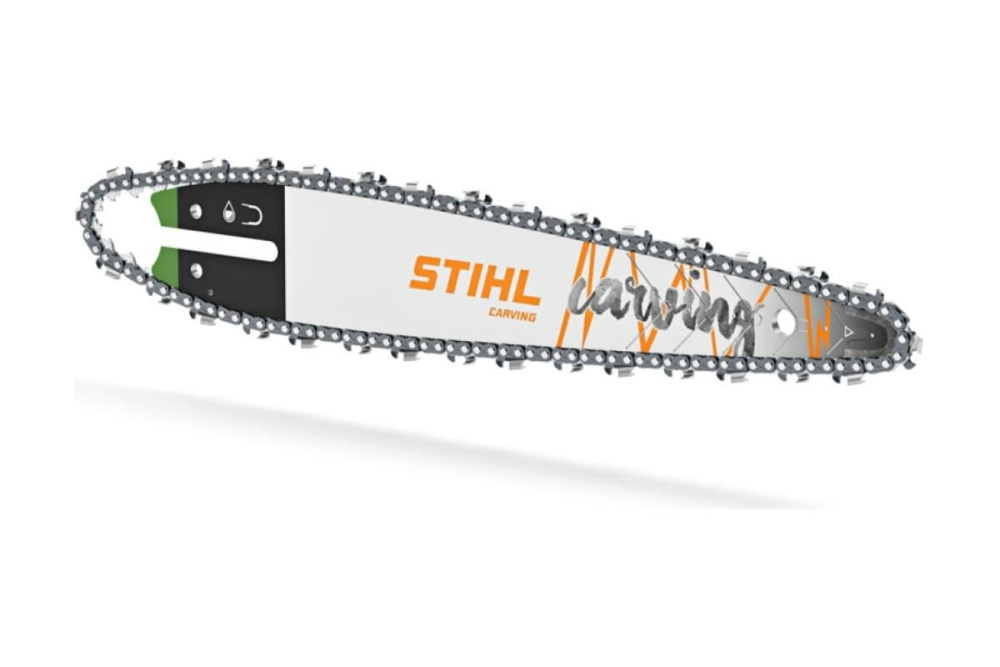 Шина Carving из трех частей с массивной стеллитовой вершиной и рабочей длиной 30 см. Для резчиков по дереву и профессиональных арбористов, для резания в очень узких местах с помощью вершины шины. Очень лёгкая и долговечная, с чрезвычайно низкой отдачей. Отметки на направляющей шине позволяют точно определять положение вершины шины в резе.
