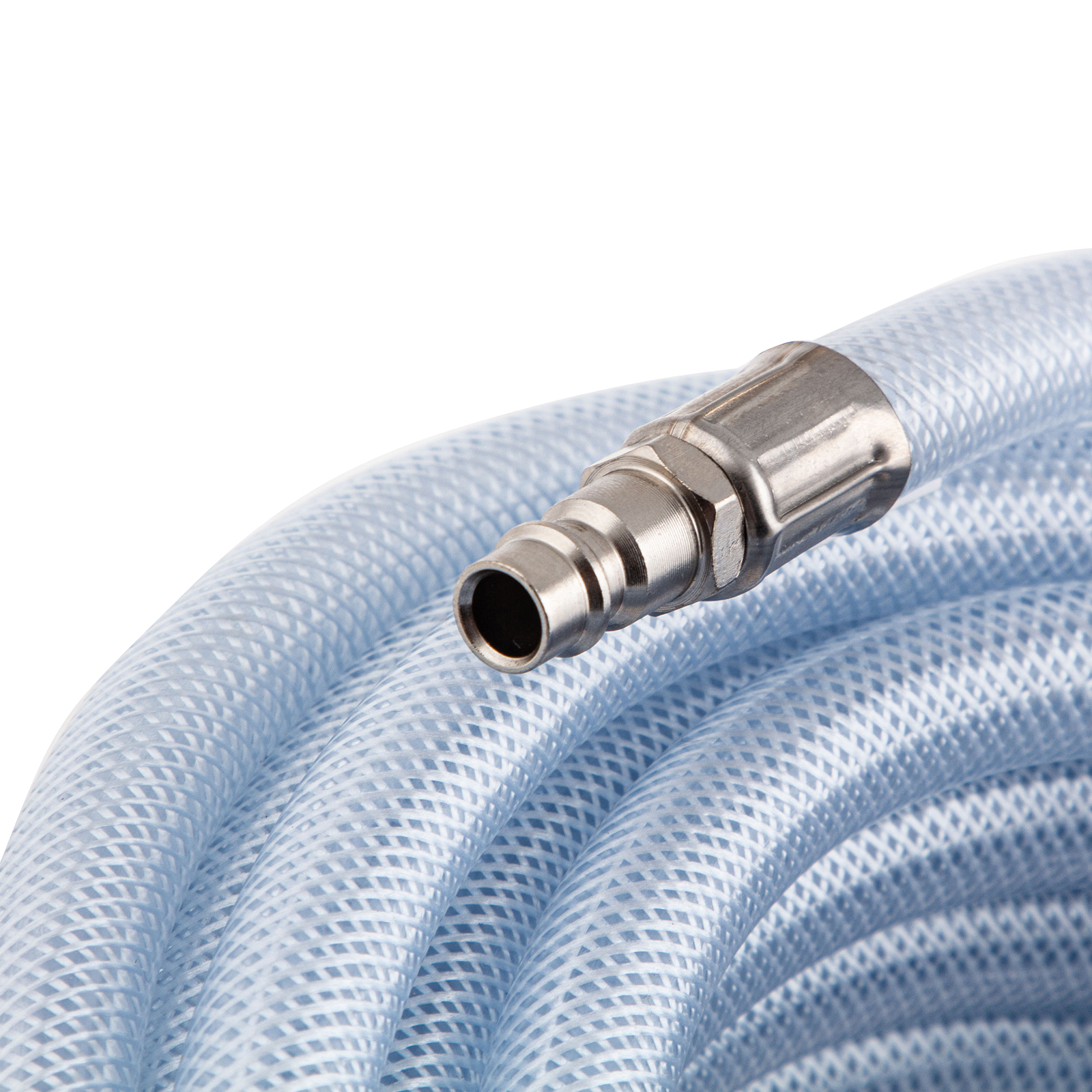Армированный прозрачный пневматический шланг Stels 57025 из ПВХ, 10 х 16 мм, длиной 15 м, с быстросъемами, выдерживает давление до 18 бар и предназначен для соединения между собой мощных компрессоров и инструментов с пневматическим приводом, а также прокладки магистральной пневмолинии. Изготовлен из ПВХ и имеет армирующий слой из полиамида, поэтому характеризуется высокой прочностью и устойчивостью к падениям и пережатиям, а также невосприимчивостью к химическим воздействиям. Шланг подойдет для использования на производственном предприятии, строительной площадке или в автосервисе.
