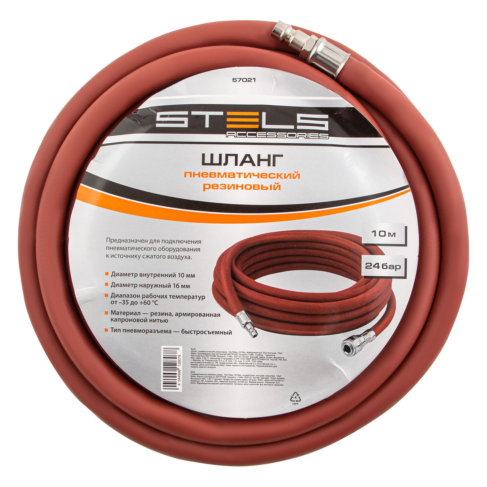 Пневматический армированный резиновый шланг Stels 57021, 10 х 16 мм, длиной 10 м, с быстросъемами, служит для подключения пневматического оборудования к компрессору и выдерживает давление до 24 бар. Изготовлен из резины и армирован капроновой нитью, что обеспечивает высокую устойчивость к механическому воздействию и пережатию, а также к перепадам температур. Может использоваться для прокладки воздушной магистрали. Шланг пригодится на производстве, строительной площадке и в автосервисе.