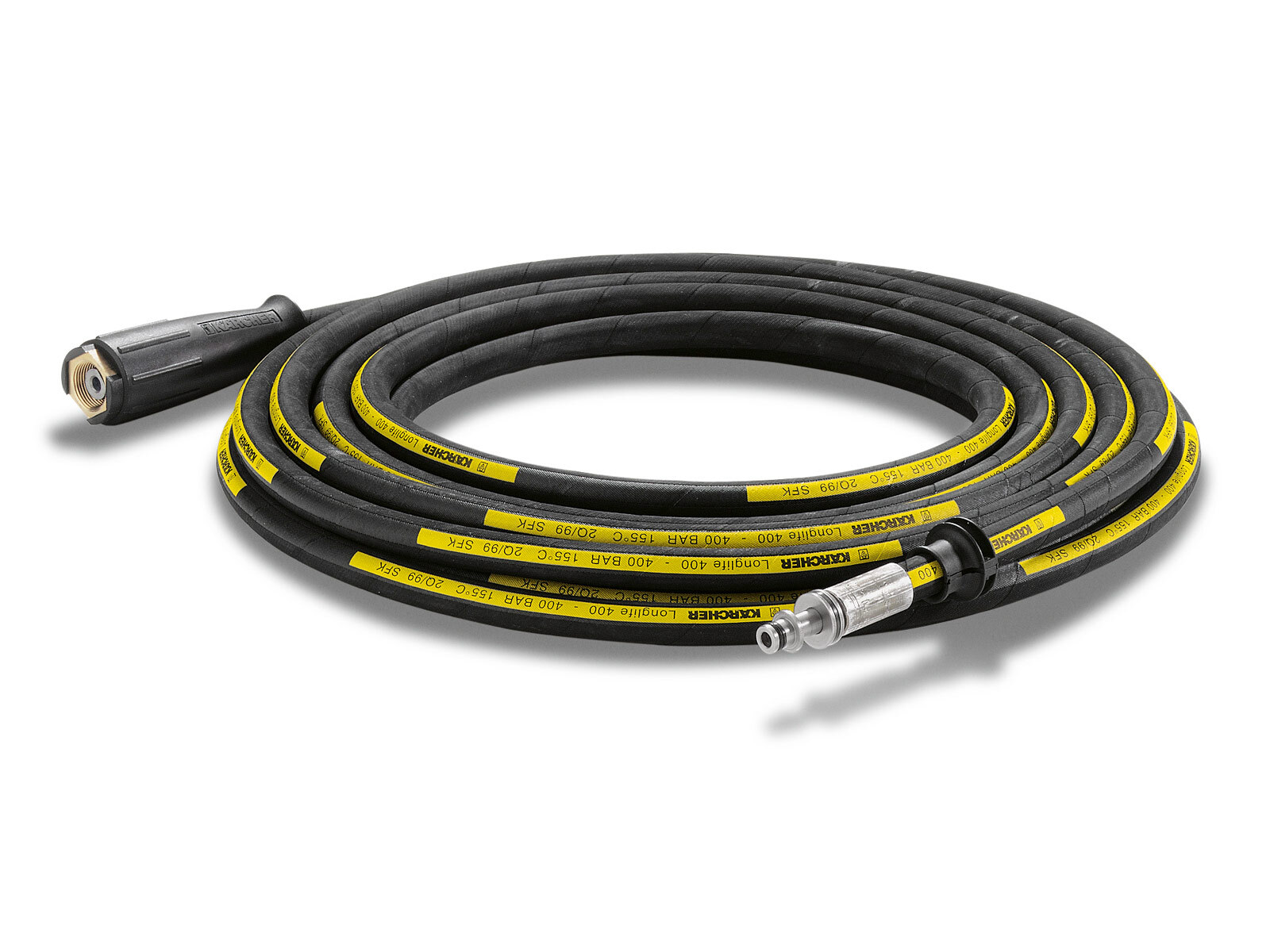 Предлагаемые Karcher долговечные шланги Longlife 400 с прочной резиновой оболочкой и двойным стальным армированием способны выдерживать давление до 400 бар. Они надежны, удовлетворяют высоким требованиям промышленной эксплуатации, имеют длительный срок службы.
