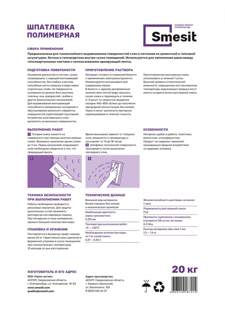 Шпаклевка полимерная Smesit белоснежная 20 кг, 56 шт/поддон купить в Екатеринбурге по оптовой цене в магазине NOVA Prom Group . Шпатлёвка Smesit полимерная предназначена для тонкослойного выравнивания стен и потолков из цементной и гипсовой штукатурки, бетона и гипсокартона в сухих помещениях. Продукт также используется для заполнения швов между гипсокартонными плитами с применением армирующей ленты.