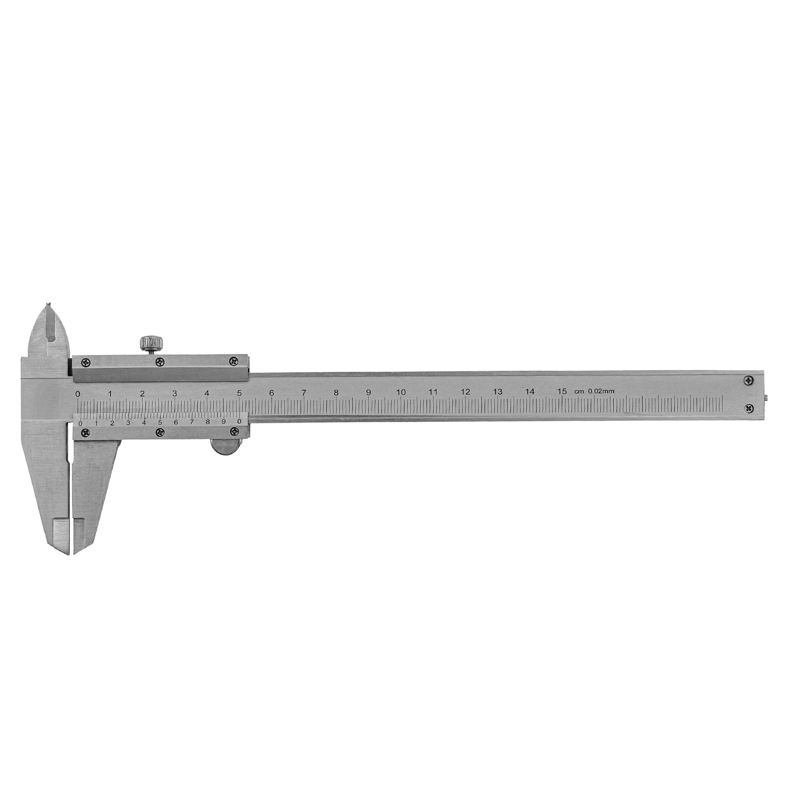 Металлический штангенциркуль с глубиномером Matrix 316315, 150 мм, со значением отсчета по нониусу 0,02 мм, используется для быстрого определения размеров внутри и снаружи деталей, а также глубин отверстий и канавок — для этого предусмотрен глубиномер. Погрешность составляет ±0,02 мм при измерении размеров до 100 мм, и ±0,03 мм — свыше 100 мм. Измерительный инструмент используется в токарном, слесарном деле, будет полезен на производственном предприятии, а также дома или в гараже.
