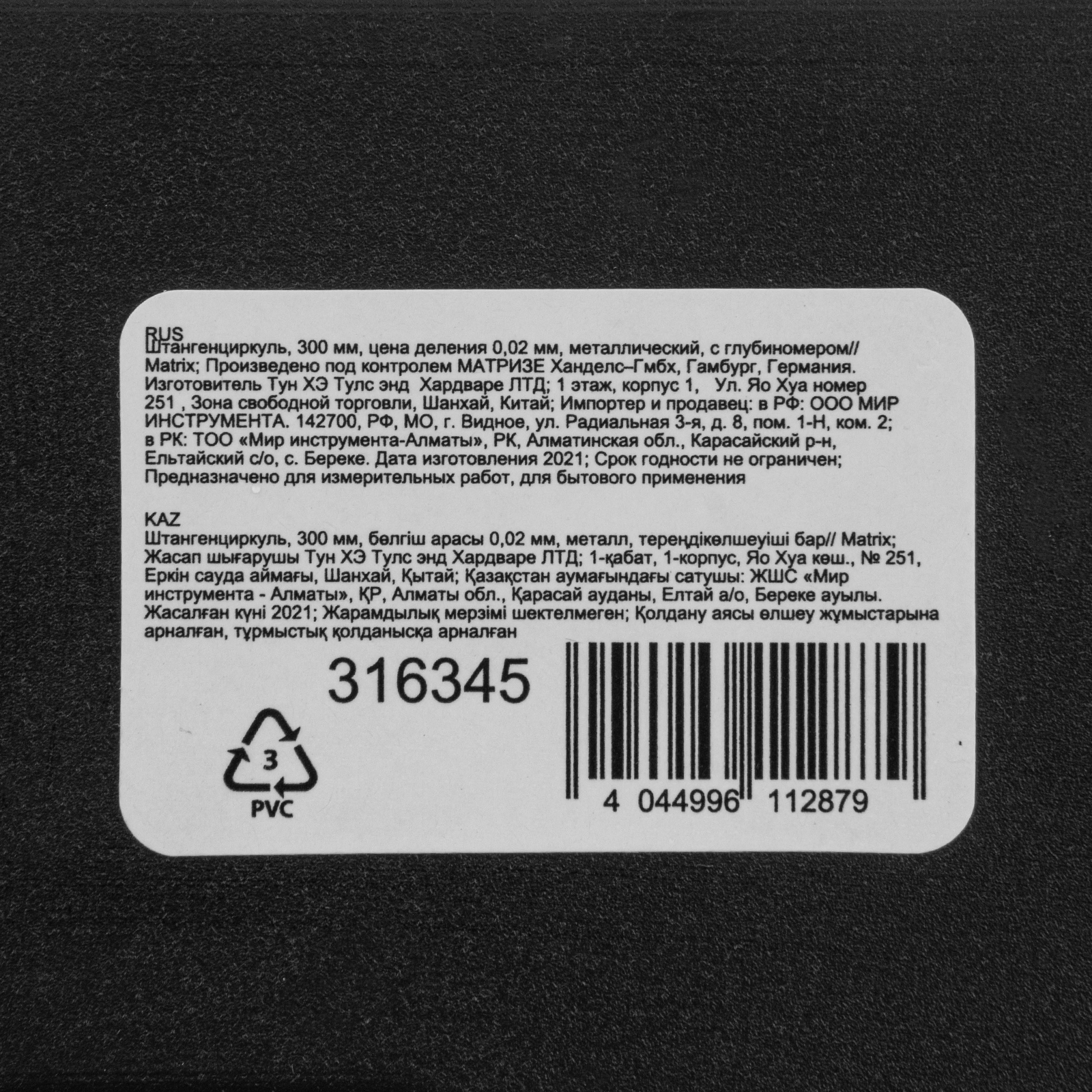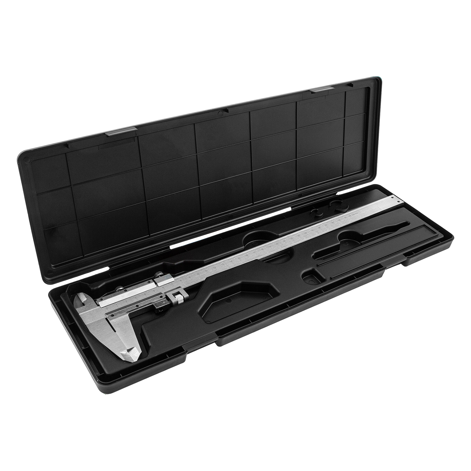Металлический штангенциркуль с глубиномером Matrix 316345, 300 мм, со значением отсчета по нониусу 0,02 мм, используется для быстрого определения размеров внутри и снаружи деталей, а также глубин отверстий и канавок — для этого предусмотрен глубиномер. Погрешность составляет ±0,02 мм при измерении размеров до 100 мм, и ±0,03 мм — свыше 100 мм. Измерительный инструмент используется в токарном, слесарном деле, будет полезен на производственном предприятии, а также дома или в гараже.