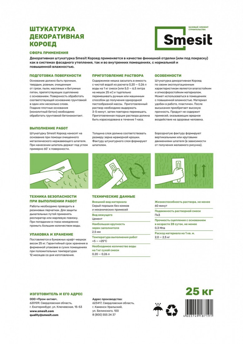 Штукатурка декоративная Smesit Короед, зерно 2,5 мм, 25 кг, 48 шт/ поддон купить в Екатеринбурге по оптовой цене в магазине NOVA Prom Group . Декоративная штукатурка "Короед" от Smesit предназначена для создания рельефных покрытий с характерным узором. Этот материал подходит для отделки стен и потолков внутри помещений, придавая поверхностям оригинальный и индивидуальный вид.