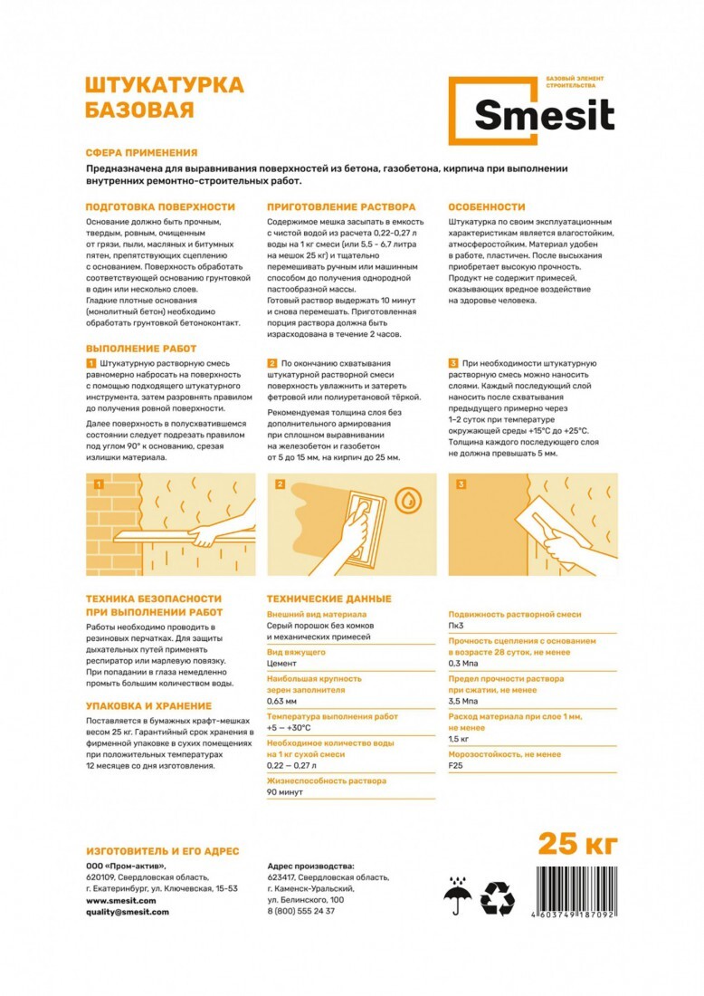 Штукатурка цементная Smesit базовая 25 кг, 48 шт/поддон купить в Екатеринбурге по оптовой цене в магазине NOVA Prom Group . Штукатурка базовая Smesit – это цементная выравнивающая смесь, предназначенная для ручного нанесения на стены из бетона, газобетона и кирпича. Продукт подходит для внутренних и наружных ремонтно-строительных работ, обеспечивая ровное и прочное покрытие.