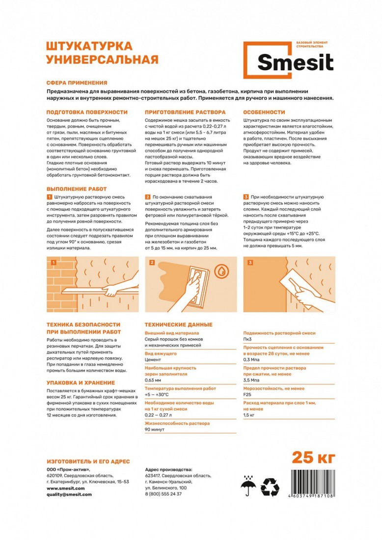 Штукатурка цементная Smesit универсальная 25 кг, шт купить в Екатеринбурге по оптовой цене в магазине NOVA Prom Group . Цементная штукатурка универсальная Smesit – это надежная смесь для выравнивания стен из бетона, газобетона и кирпича. Подходит для внутренних и наружных работ, может наноситься вручную или с использованием штукатурных станций.