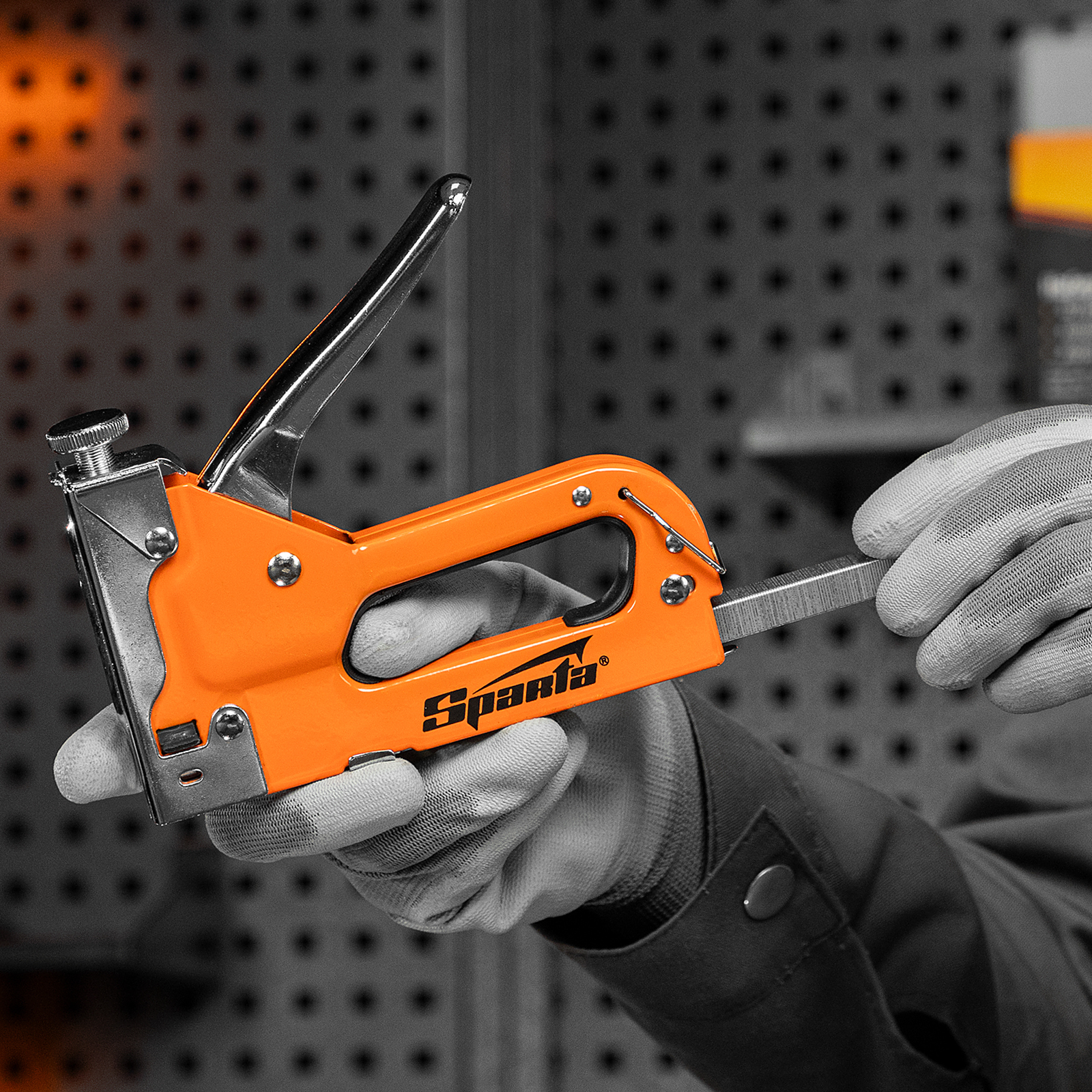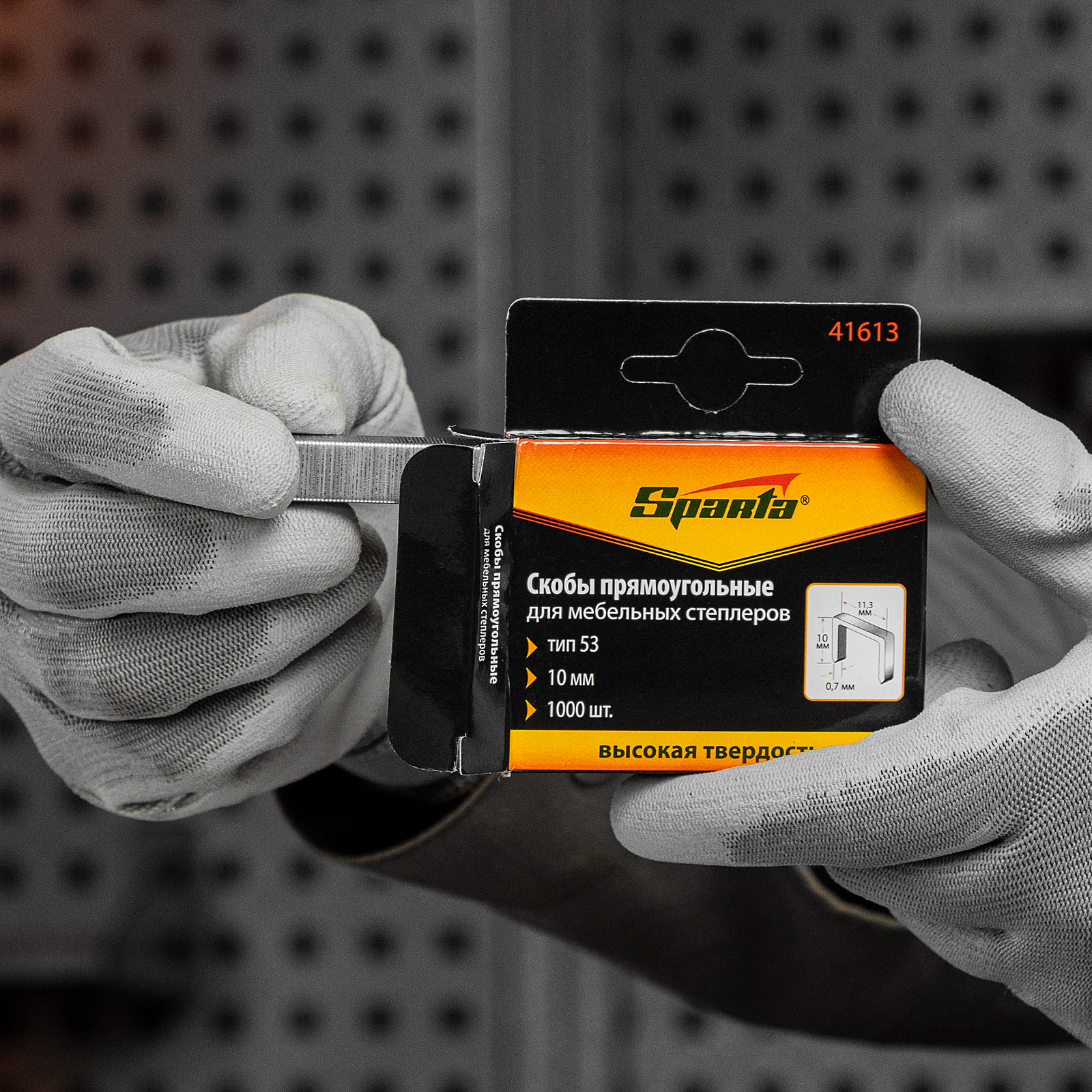 П-образные скобы Sparta 41613 типа 53, размером 10 х 11,3 х 0,7 мм, 1000 шт. в упаковке, заправляются в мебельные степлеры. Подходят для закрепления древесины, фанеры, ДСП, оргалита, картона, и других материалов. Пригодятся для проведения ремонтных и облицовочных работ, а также обивки мебели.