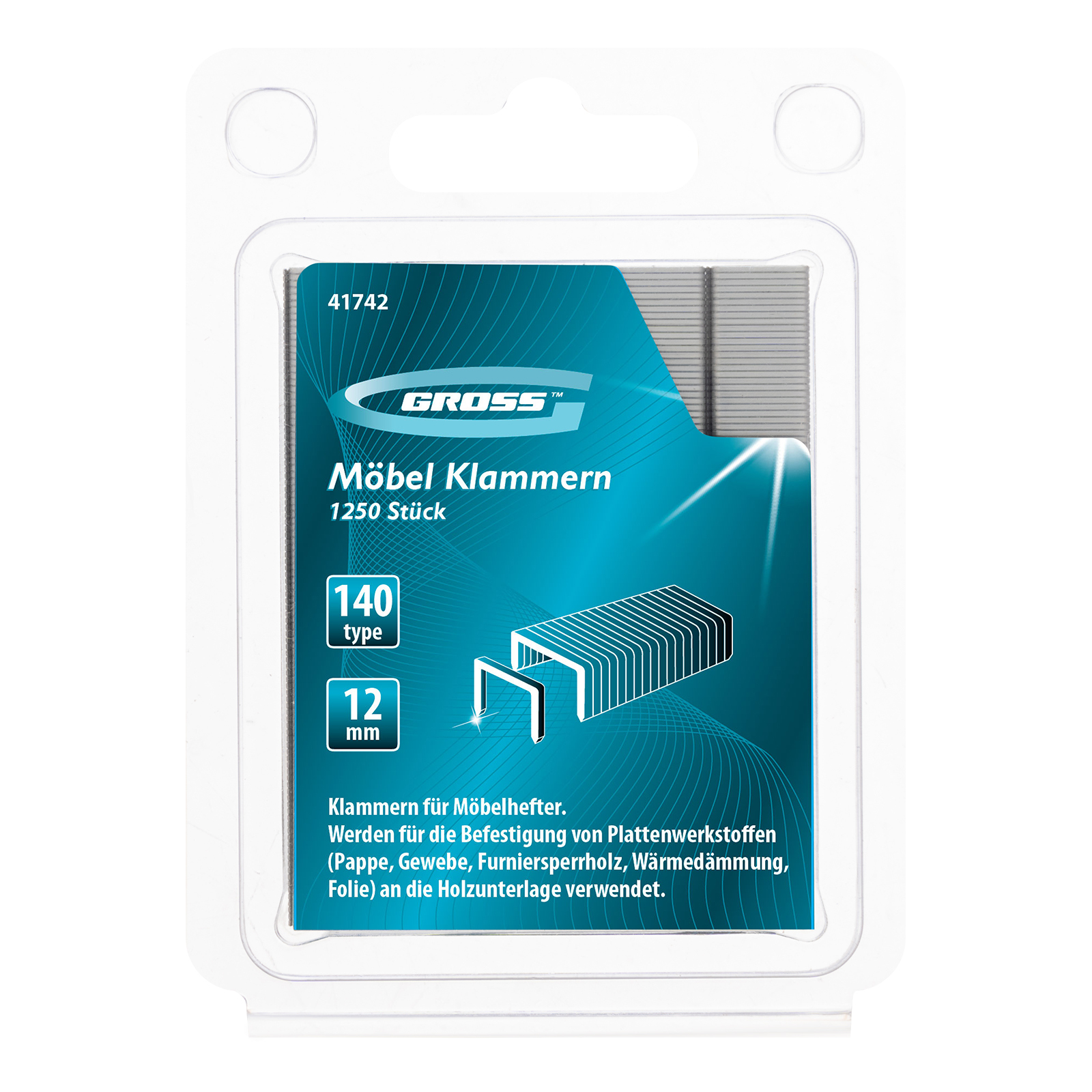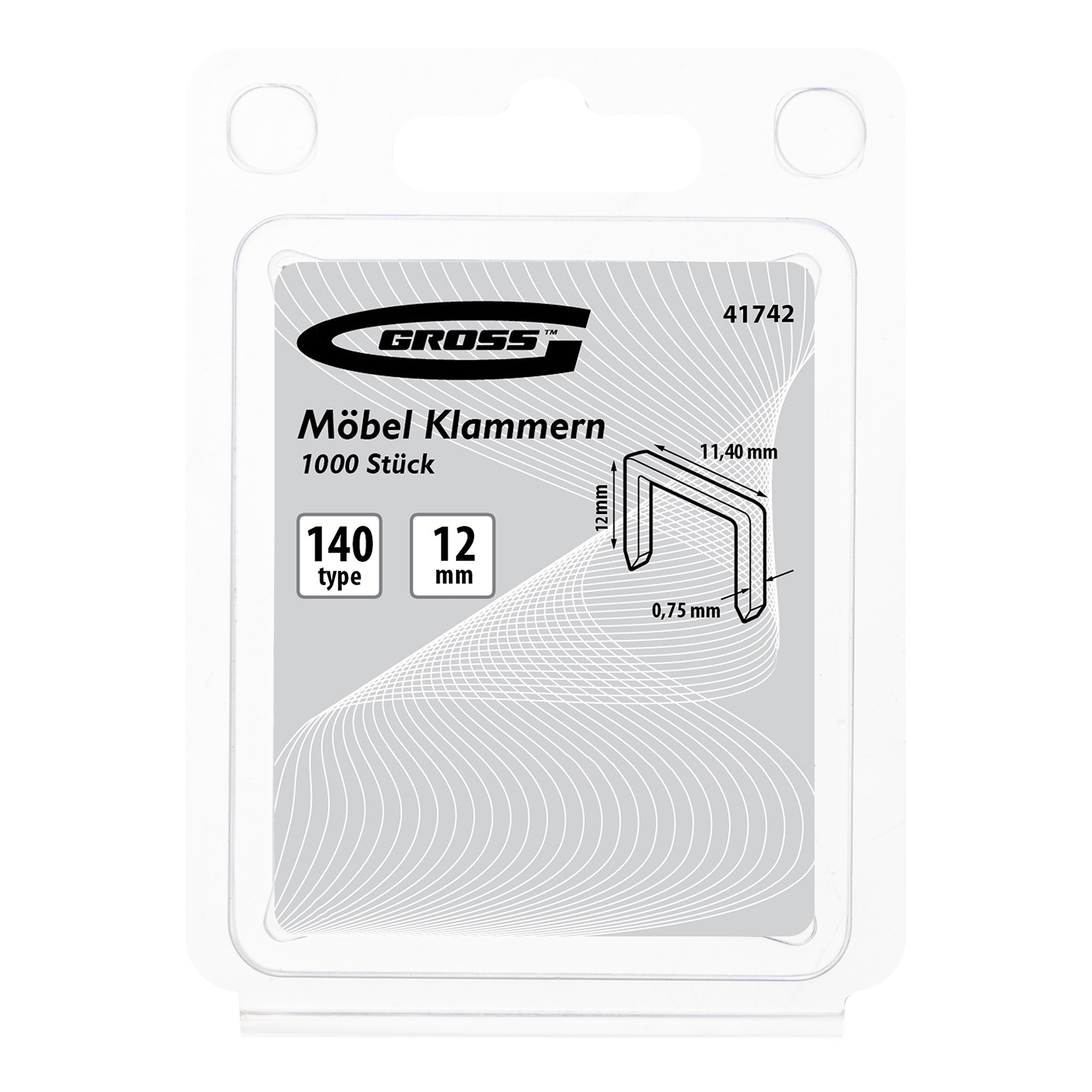 Усиленные скобы Gross 41742 размером 12 х 10,5 х 1,2 мм, тип 140, 1250 шт. в упаковке, предназначены для скрепления листовых материалов с помощью мебельного степлера. Позволяют зафиксировать картон, фанеру, ткань в ходе проведения облицовочных или ремонтных работ.