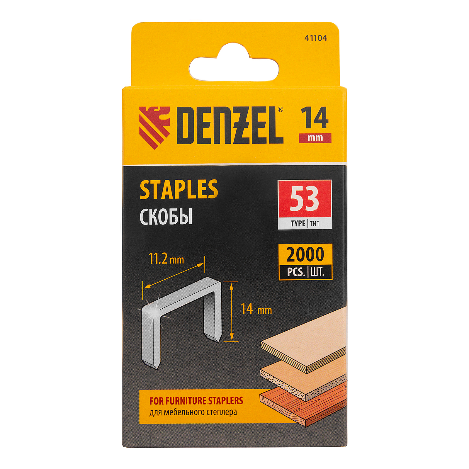 Скобы Denzel 41104 типа 53, высотой 14 мм, 2000 шт. в упаковке, — расходные материалы для мебельного степлера. Универсальные П-образные скобы подходят для фиксации картона, фанеры, ткани, пленки ПВХ, утеплителя и других материалов. Пригодятся для обшивки мебели, укладки утеплителя и выполнения других работ.