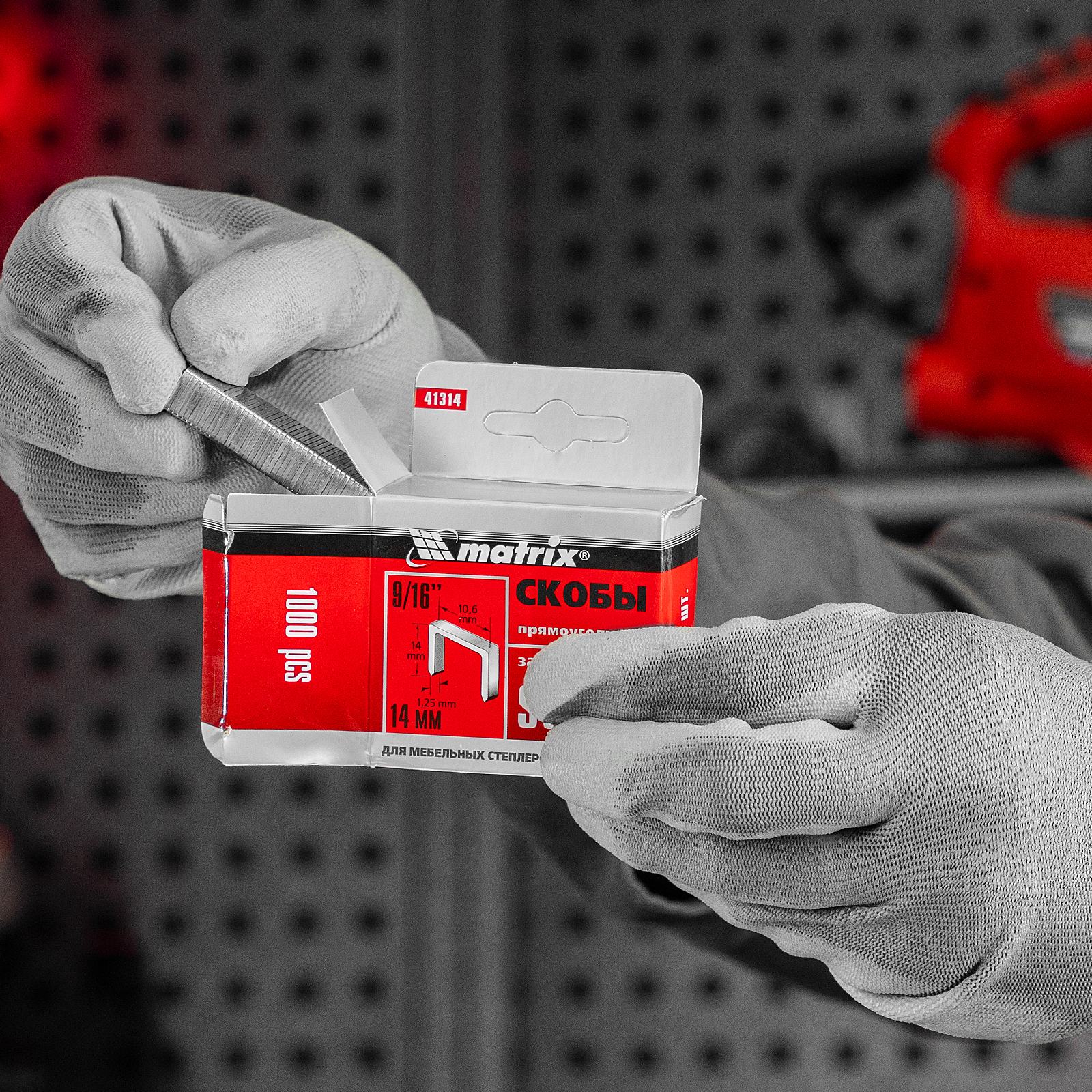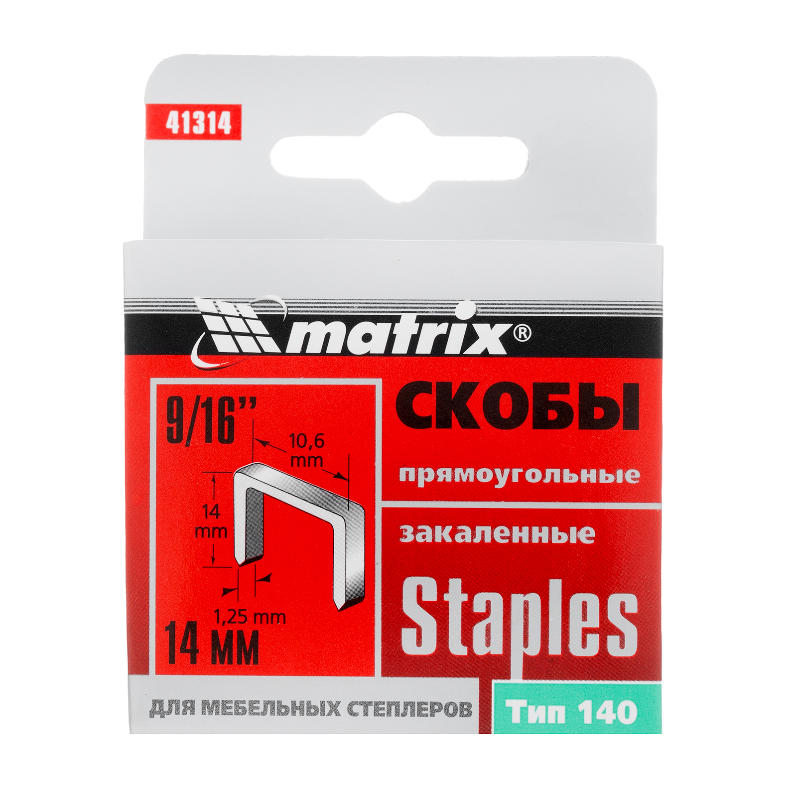 Закаленные скобы Matrix 41314 для мебельного степлера, тип 140, размером 14 х 10,6 х 1,25 мм, 1000 шт. в коробке, помогут обить мебель, зафиксировать утеплитель, а также выполнить другие отделочные и ремонтные работы. Скобы крепко соединяют различные материалы: древесину, фанеру, картон, ДСП.
