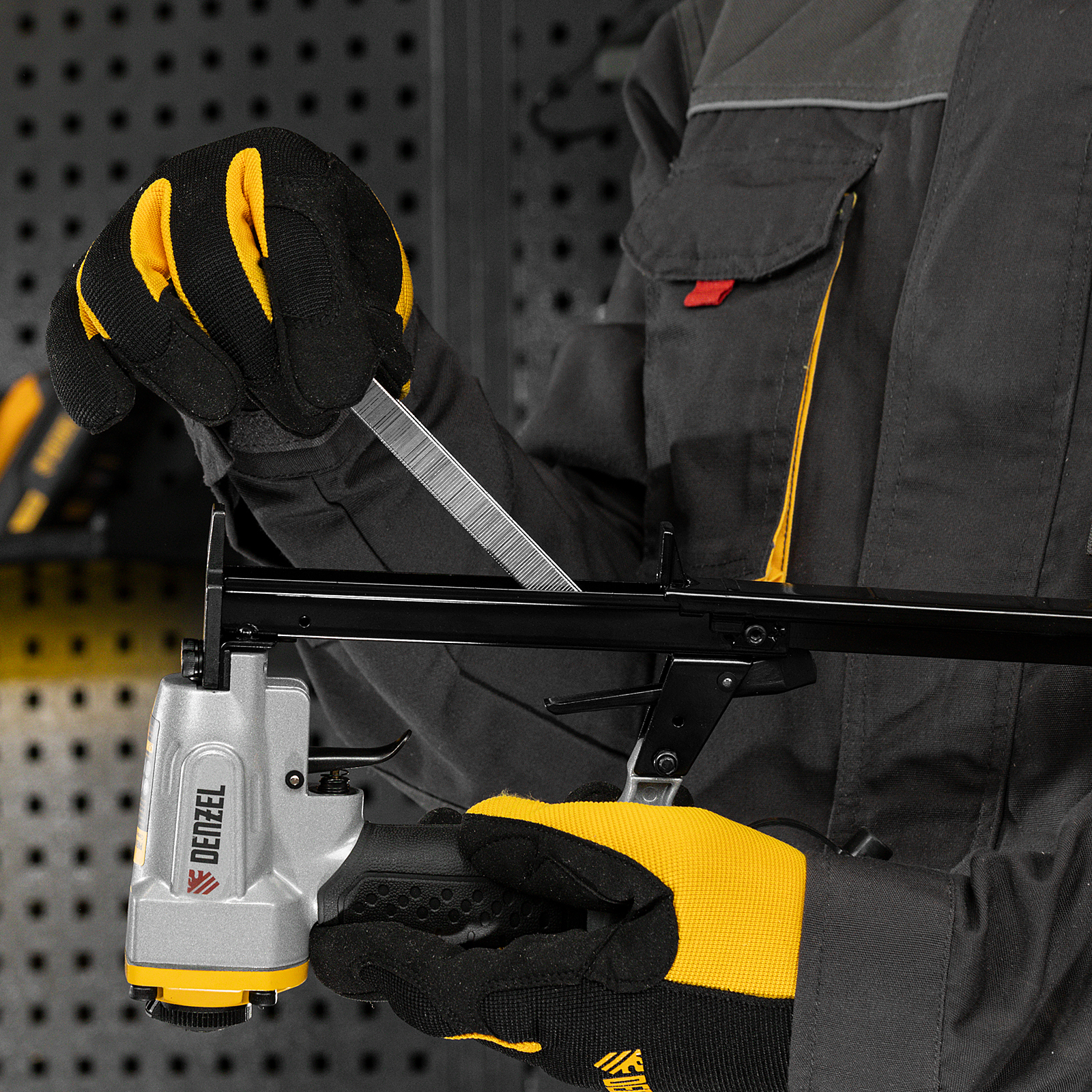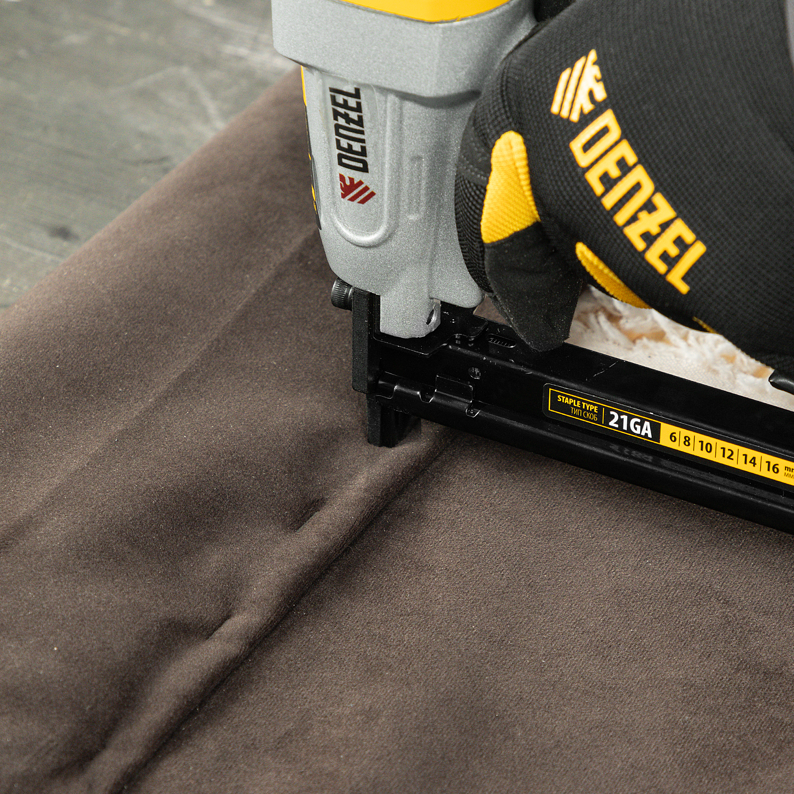 Скобы 21GA Denzel 57676 шириной 12,8 мм, 5000 шт. в упаковке, предназначены для пневматического степлера, совместимого с крепежом размера 12 х 0,95 х 0,6 мм. Используются для крепления листовых материалов к деревянному основанию, подходят для обивки мебели, укладки напольного покрытия, фиксации утеплителя.