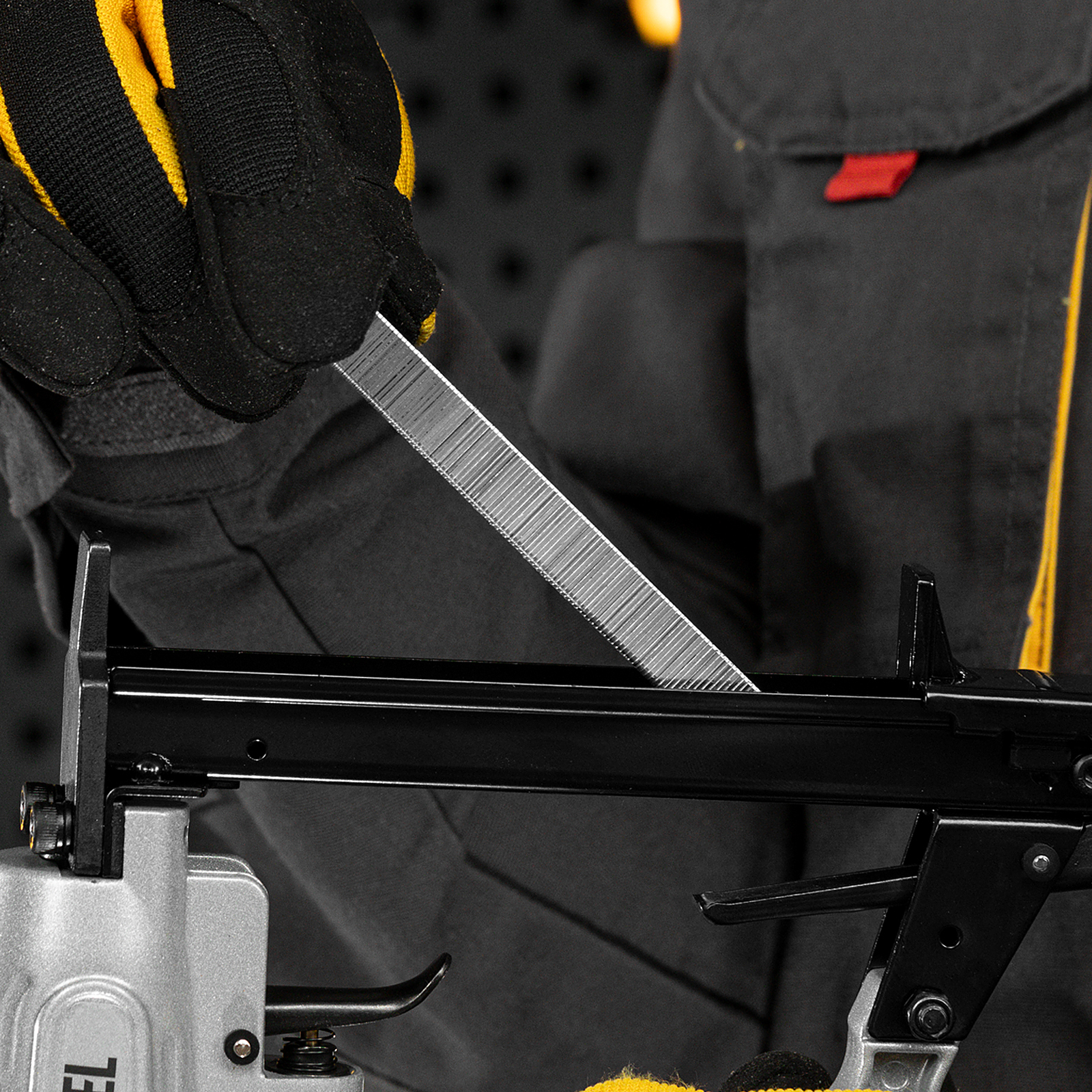 - Высокое качество проводимых работ — скобы образуют надежное и долговечное крепление.