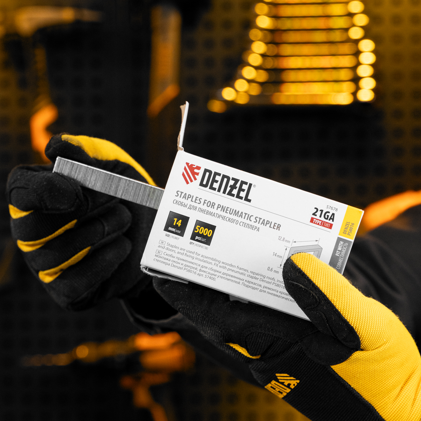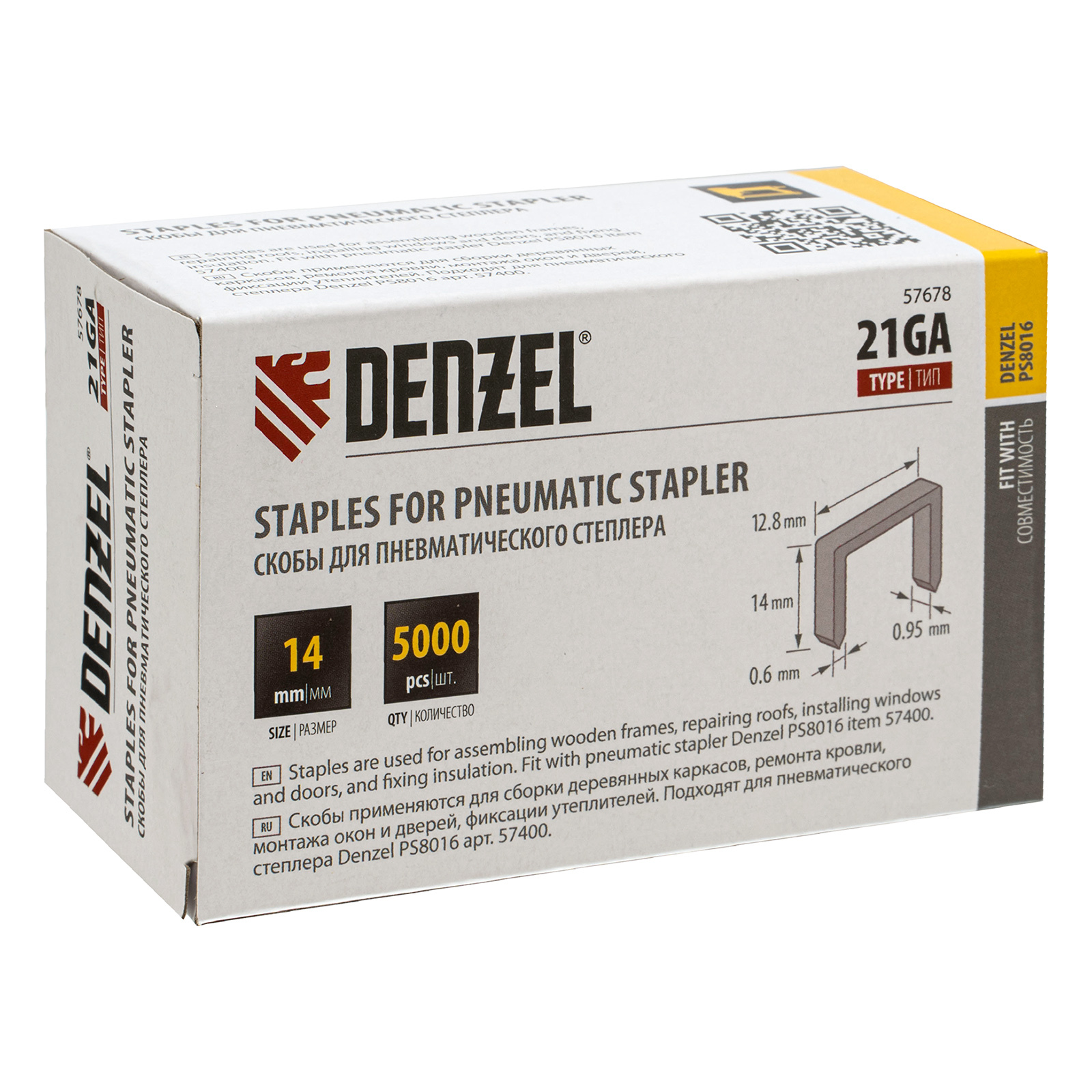 Скобы 21GA Denzel 57678 шириной 12,8 мм, 5000 шт. в упаковке, предназначены для пневматического степлера, совместимого с крепежом размера 14 х 0,95 х 0,6 мм. Используются для крепления листовых материалов к деревянному основанию, подходят для обивки мебели, укладки напольного покрытия, фиксации утеплителя.
