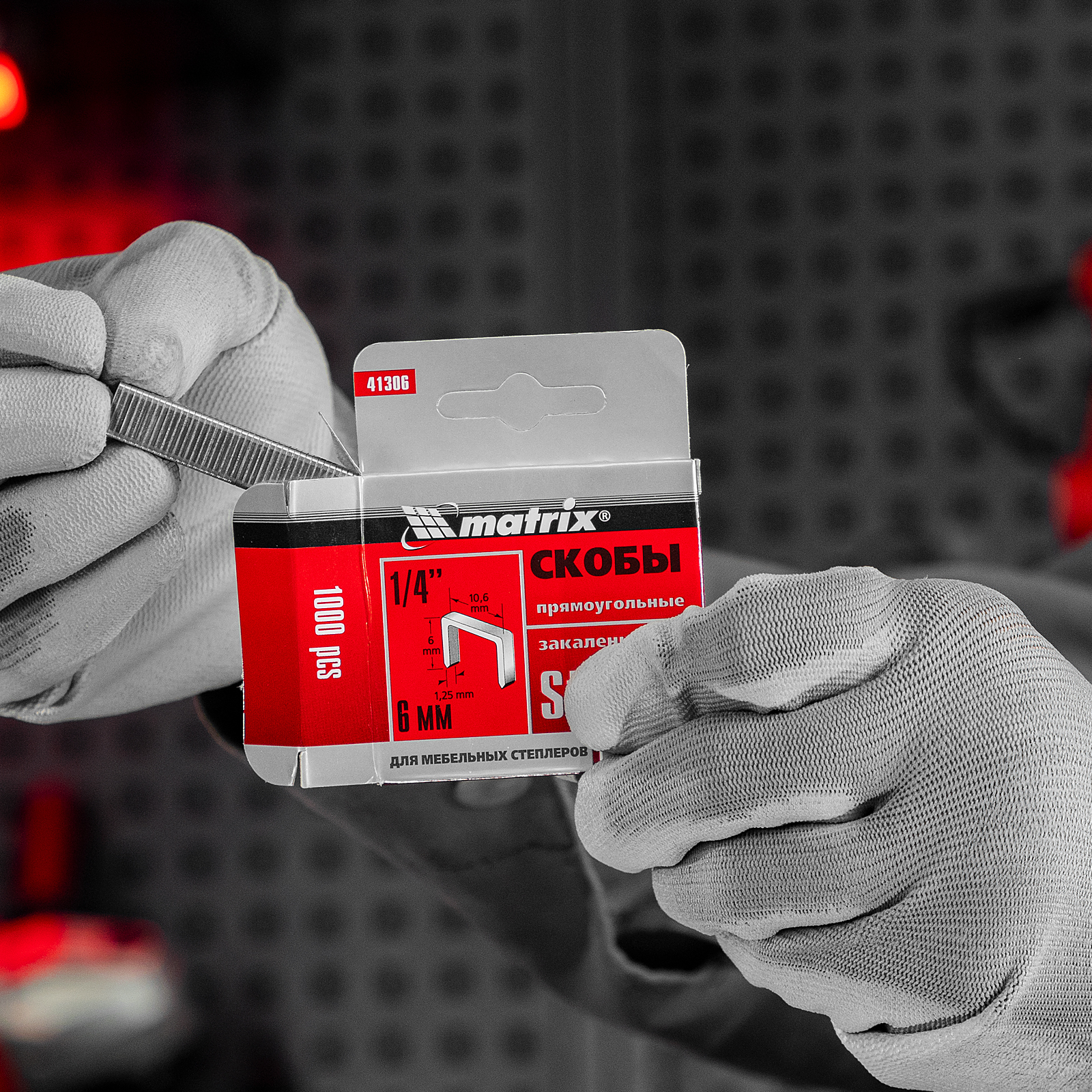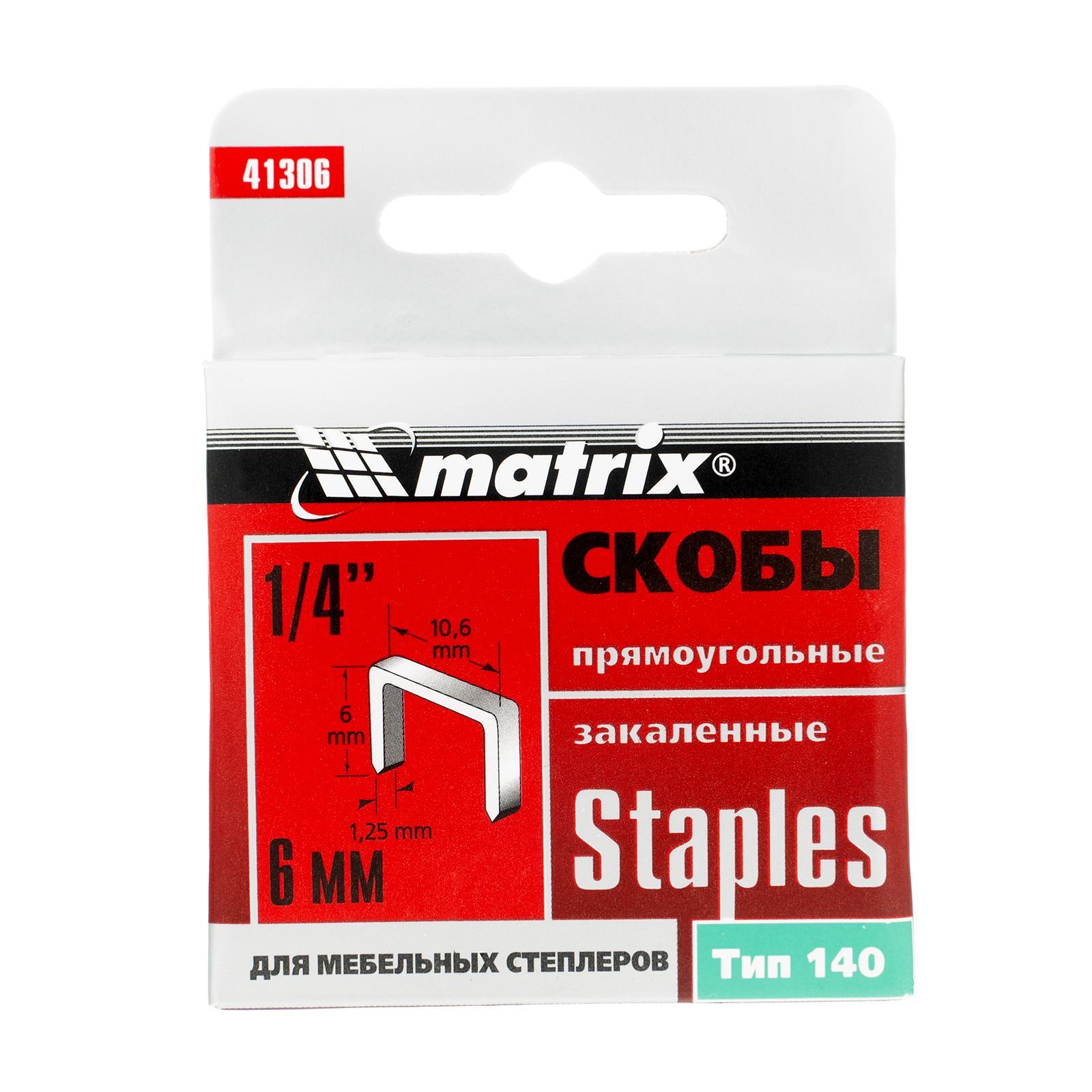 Закаленные скобы Matrix 41306 для мебельного степлера, тип 140, размером 6 х 10,6 х 1,25 мм, 1000 шт. в коробке, помогут обить мебель, зафиксировать утеплитель, а также выполнить другие отделочные и ремонтные работы. Скобы крепко соединяют различные материалы: древесину, фанеру, картон, ДСП.