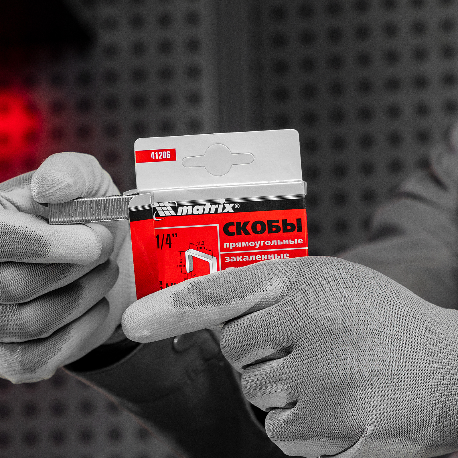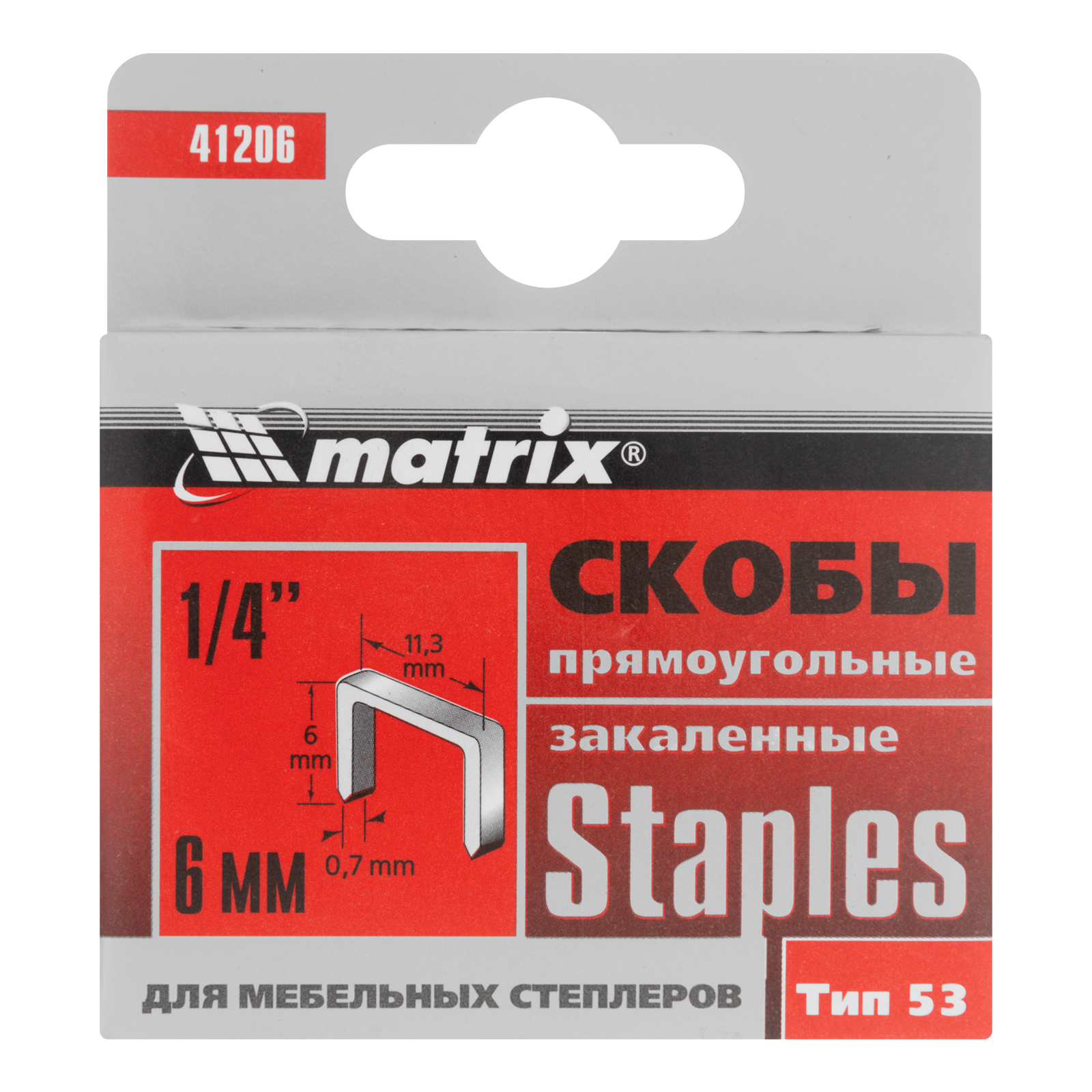 Закаленные скобы Matrix 41206 для мебельного степлера, тип 53, размером 6 х 11,3 х 0,7 мм, 1000 шт. в коробке, помогут обить мебель, зафиксировать утеплитель, а также выполнить другие отделочные и ремонтные работы. Скобы крепко соединяют различные материалы: древесину, фанеру, картон, ДСП.