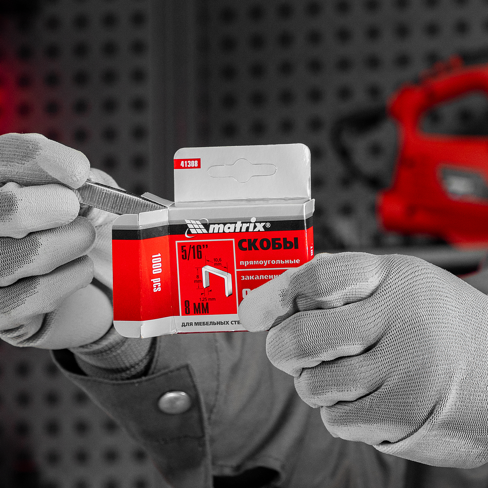 Закаленные скобы Matrix 41308 для мебельного степлера, тип 140, размером 8 х 10,6 х 1,25 мм, 1000 шт. в коробке, помогут обить мебель, зафиксировать утеплитель, а также выполнить другие отделочные и ремонтные работы. Скобы крепко соединяют различные материалы: древесину, фанеру, картон, ДСП.