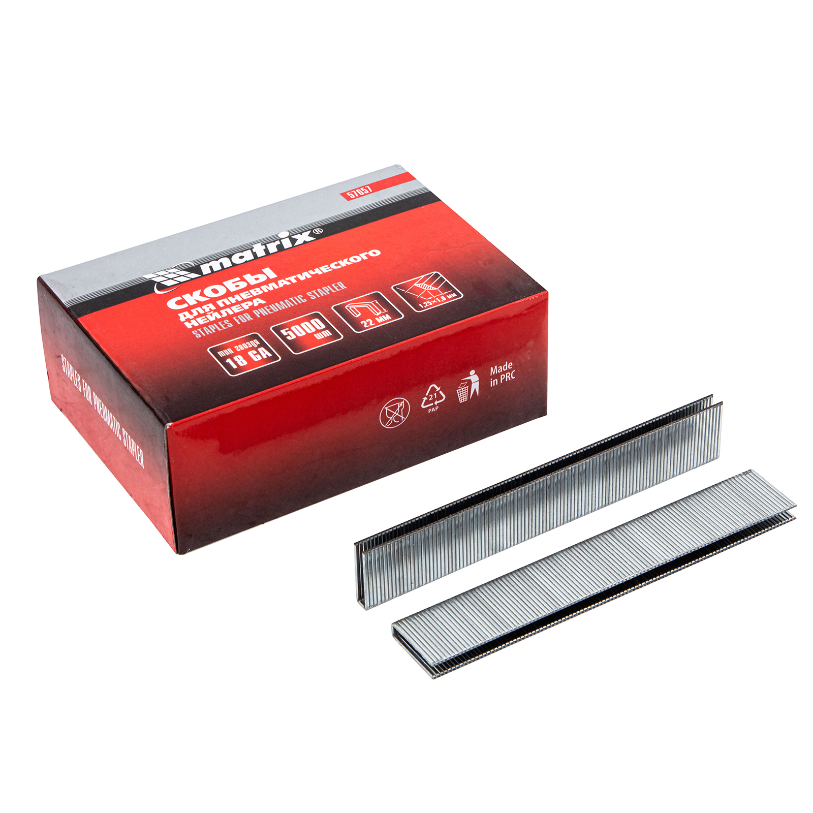 Скобы Matrix 57657 типа 18GA, сечением 1,25 х 1,0 мм, длиной 22 и шириной 5,7 мм, 5000 шт. в упаковке, — крепежные элементы для пневматических степлеров, использующиеся во время ремонтных и отделочных работ. С их помощью можно поменять мебельную обивку, скрепить деревянные каркасы, обшить и утеплить стены.