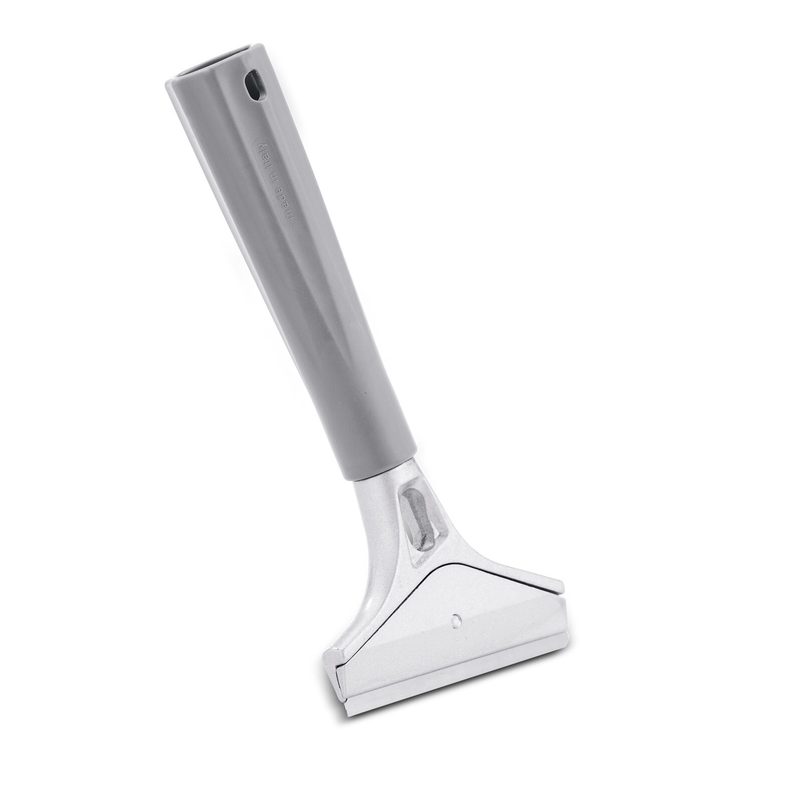 Небольшой металлический скребок Karcher с лезвием, защитным чехлом и короткой ручкой. Рабочая ширина 10 см. Можно использовать с алюминиевой телескопической ручкой. Подходит для удаления жевательной резинки, следов краски и прочих стойких загрязнений с гладких поверхностей.