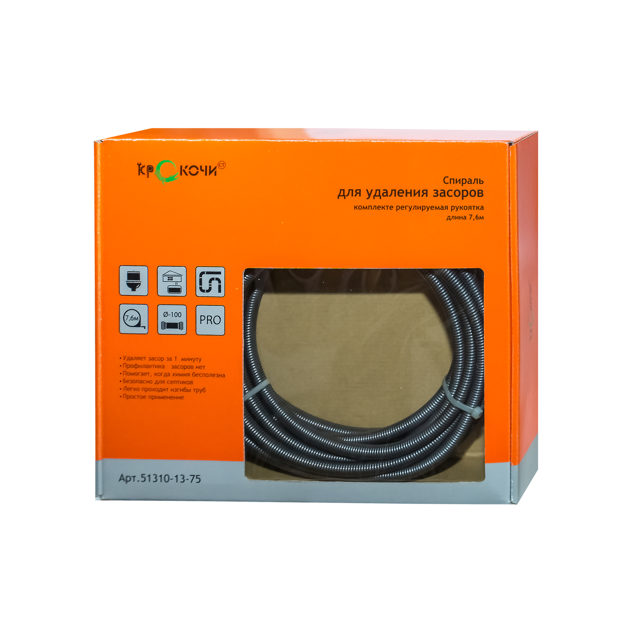 Спираль сантехника Крокочист для удаления засоров поставляется с универсальной насадкой, позволяющая устранить до 80% всех засоров. Вместе со спиралью в комплекте идет плавающая рукоятка, которая позволяет максимально удобно использовать спираль по всей его длине одному оператору и при этом находиться рядом с трубой. Спираль сантехника отлично справляется с такими засорами как закупорка труб органикой, предметами гигиены, палочками, волосами, мыльным камнем, илом, ватой, пищевыми отходами. Спирали сантехника Крокочист, в отличие от традиционных некачественных сантехнических тросов, не перекручиваются в трубе, не сворачиваются в узел и не застревают в трубе. Сделаны из высококачественной высокоуглеродистой пружинной проволоки.