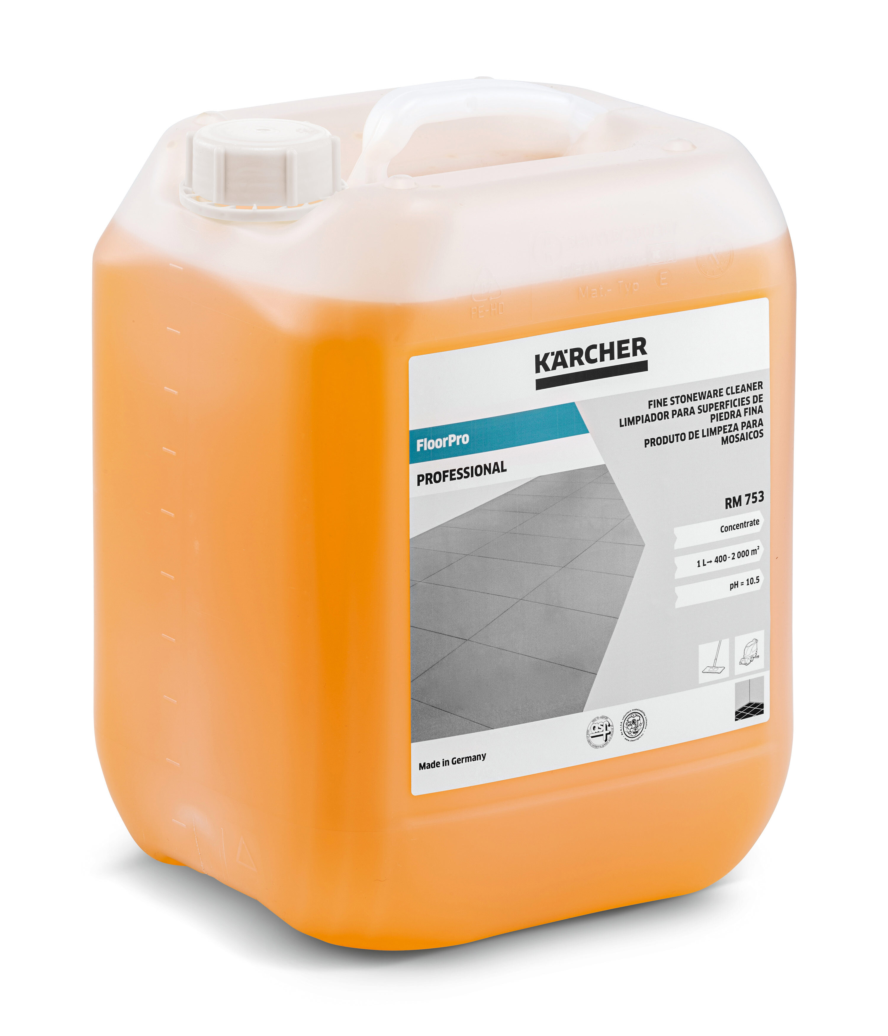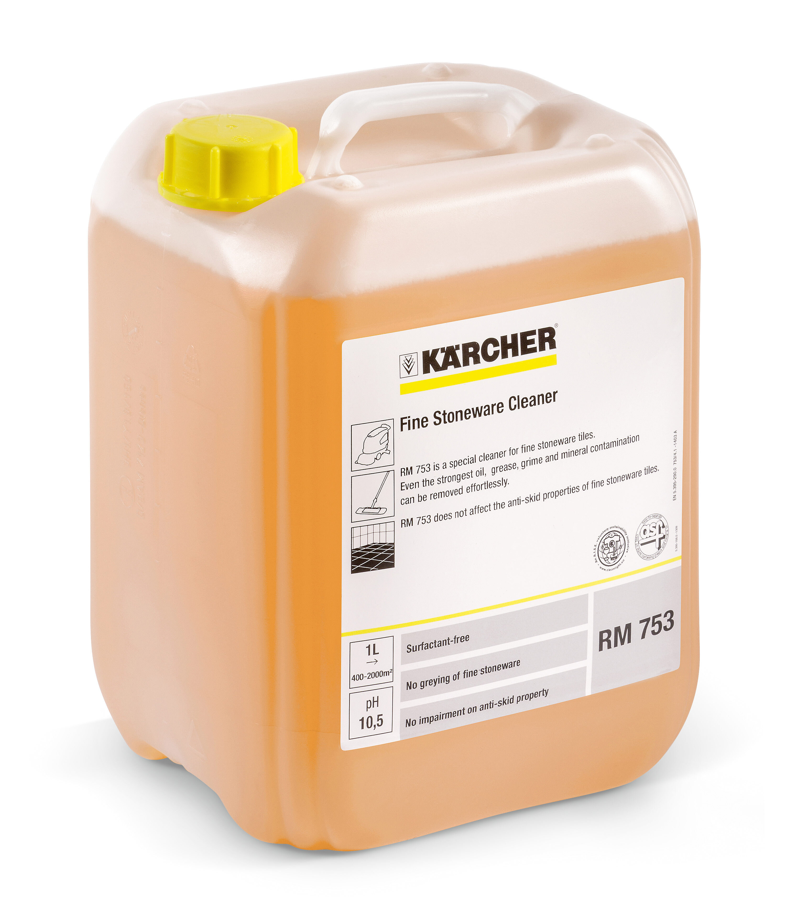 RM 753 — мощный очиститель для сильнозагрязненных каменных полов. Щелочное средство удаляет масляные, жировые и минеральные загрязнения с керамогранита и любых других каменных плиток. Не нарушает противоскользящих свойств каменной керамики. Применяется вручную или в поломойных машинах. Обеспечивает быстрое отделение масел от воды в маслоотстойниках (формула ASF), не содержит NTA (нитрилотриацетат натрия). Концентрат — pH: 10,5.