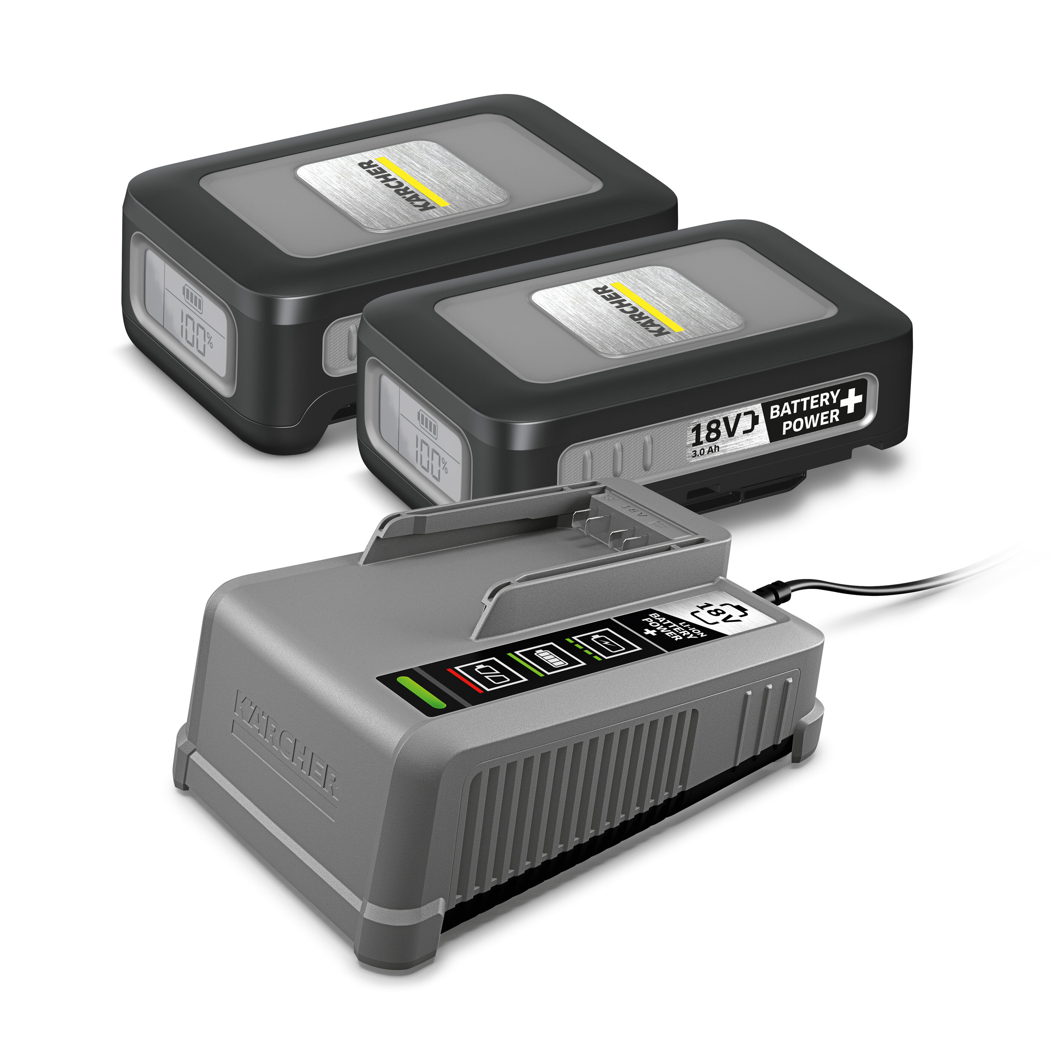 Стартовый комплект Starter Kit Battery Power+ 18/30 состоит из 2 мощных аккумуляторов 18 В/3 Ач с инновационной технологией Real Time и оптимально сочетающегося с ними быстрозарядного устройства 18 В/6 А. Обеспечивает непрерывную работу с различной аккумуляторной техникой Karcher. Время заряда быстрозарядным устройством до 80 % - 39 мин, до 100 % - 1 час.