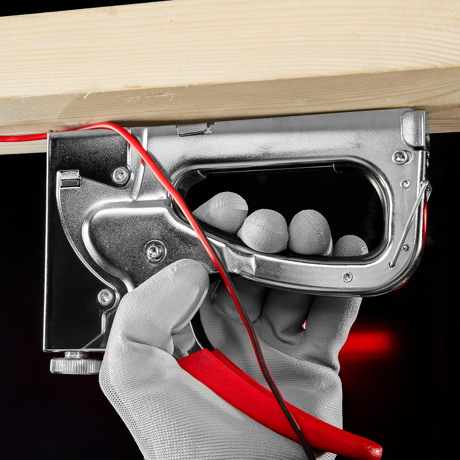 - Эффективность — плавная регулировка силы удара позволяет контролировать глубину забивания скоб, а запас мощности облегчает работу с материалами из древесины твердых пород.