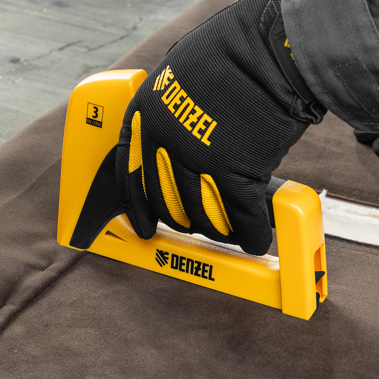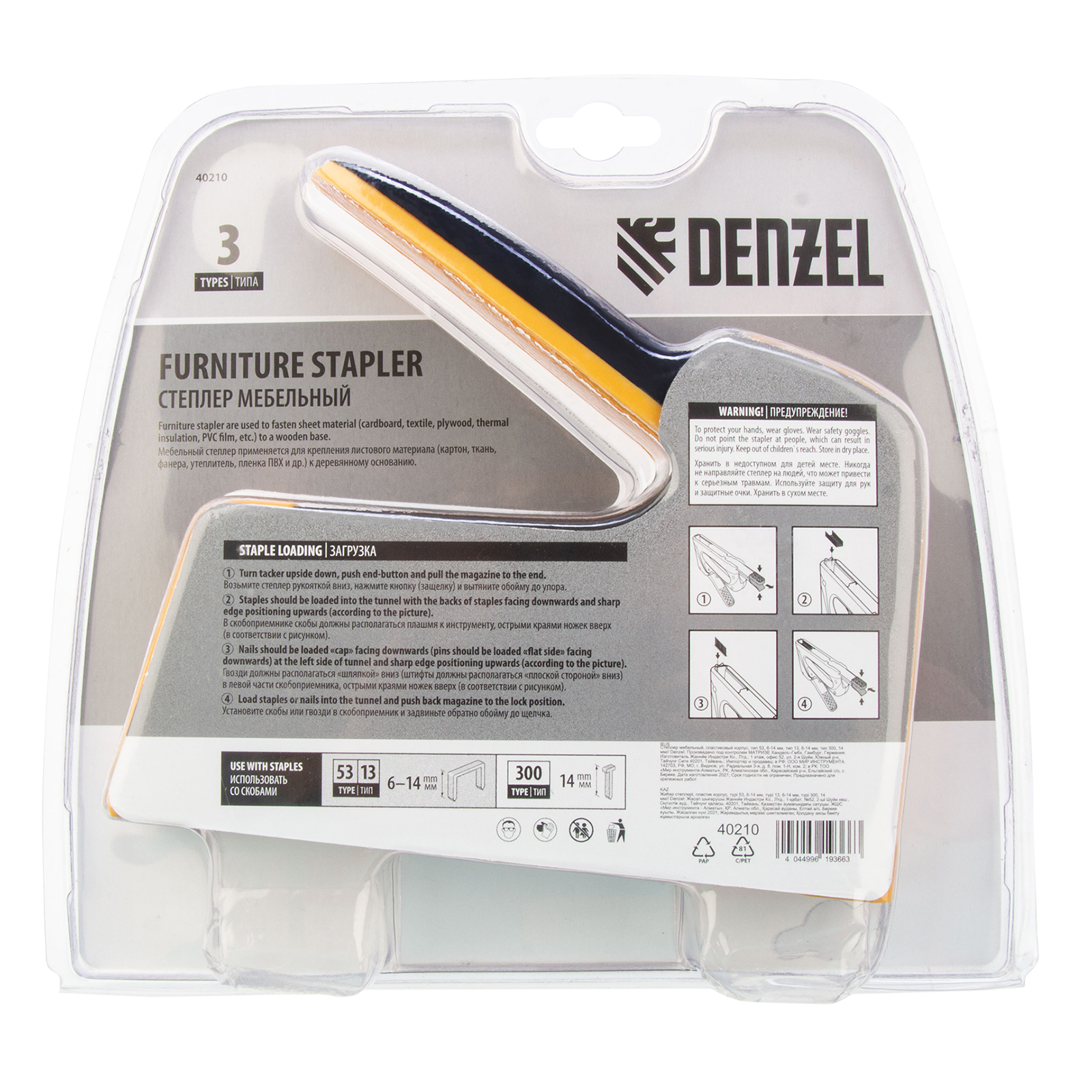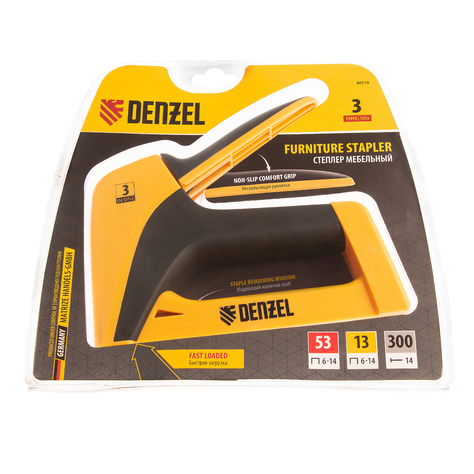 Мебельный степлер Denzel 40210 в пластиковом корпусе совместим со скобами типа 53, 13 размером 6-14 мм и типа 300 (14 мм), и позволяет быстро скреплять с деревянным основанием листовой материал — фанеру, ткань, пленку ПВХ, утеплитель, картон. Инструмент весит 400 г и удобен для длительного использования. Будет полезен при сборке и обивке мебели, укладке напольных покрытий, а также во время выполнения ремонтных и багетных работ.