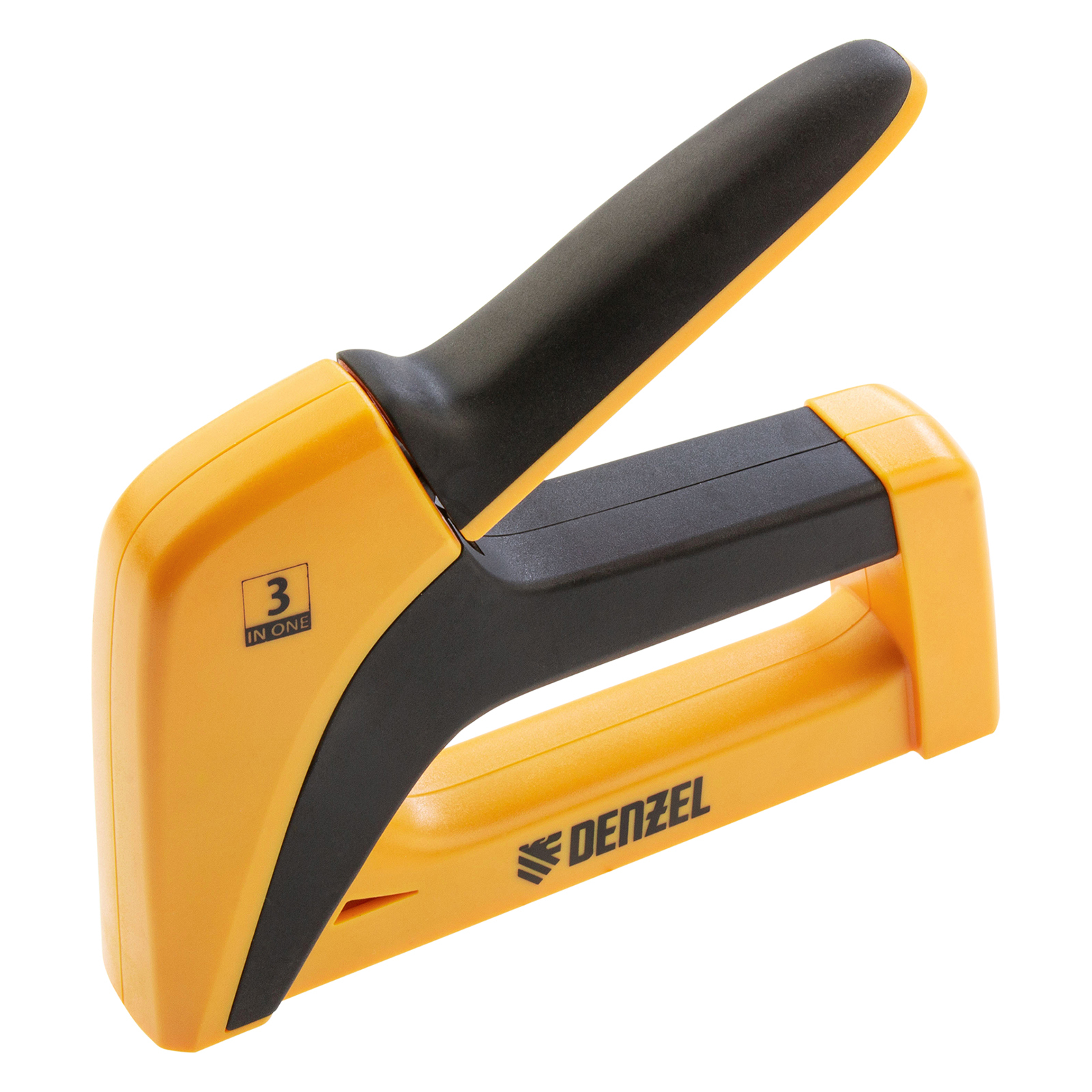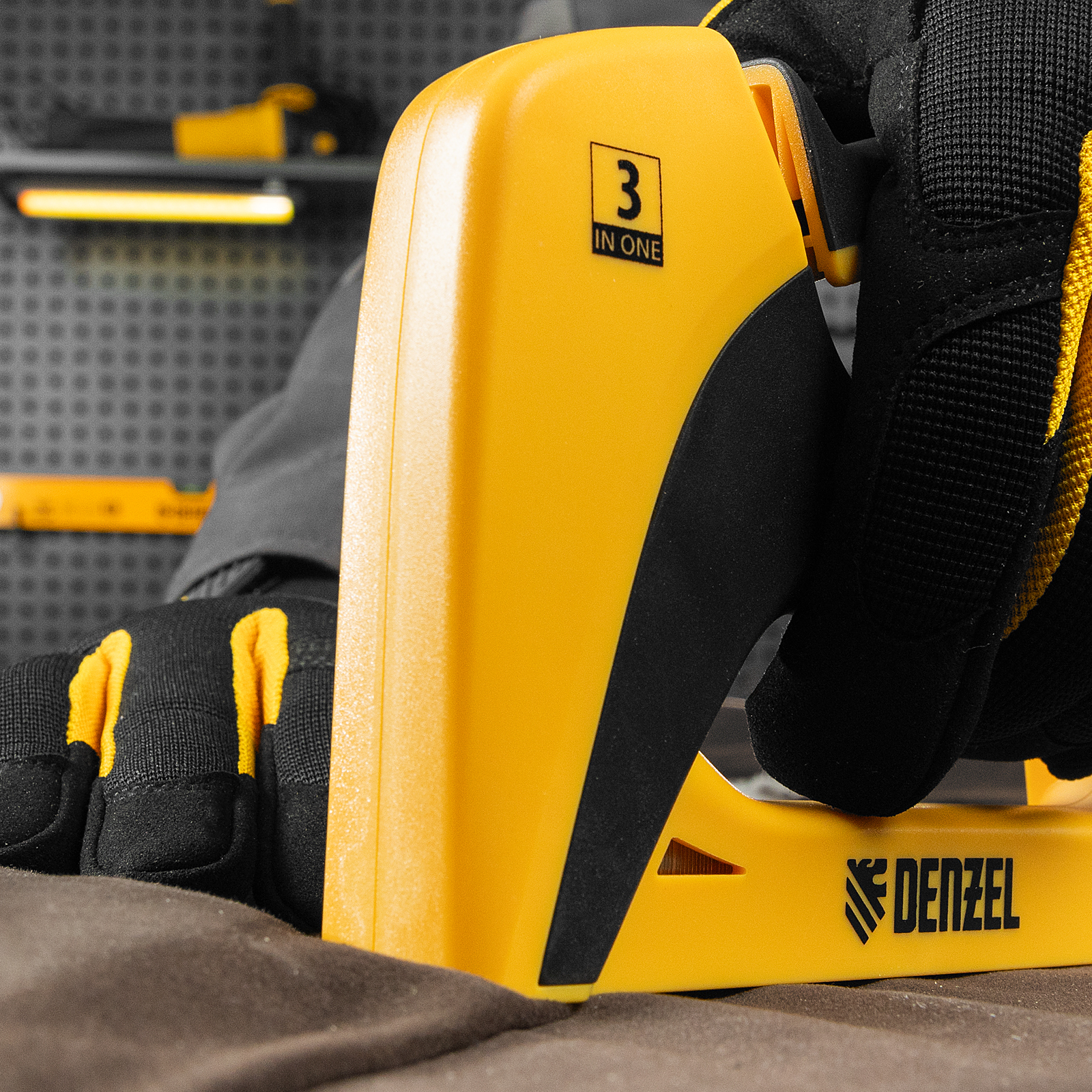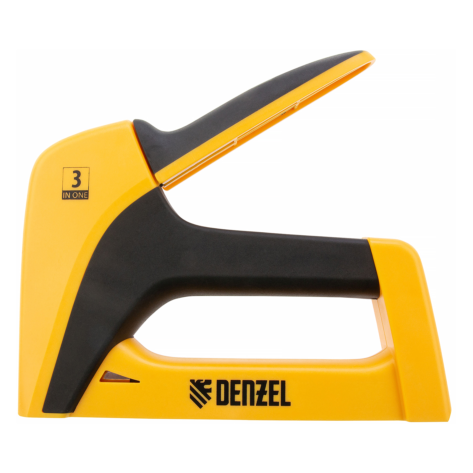 Мебельный степлер Denzel 40210 в пластиковом корпусе совместим со скобами типа 53, 13 размером 6-14 мм и типа 300 (14 мм), и позволяет быстро скреплять с деревянным основанием листовой материал — фанеру, ткань, пленку ПВХ, утеплитель, картон. Инструмент весит 400 г и удобен для длительного использования. Будет полезен при сборке и обивке мебели, укладке напольных покрытий, а также во время выполнения ремонтных и багетных работ.