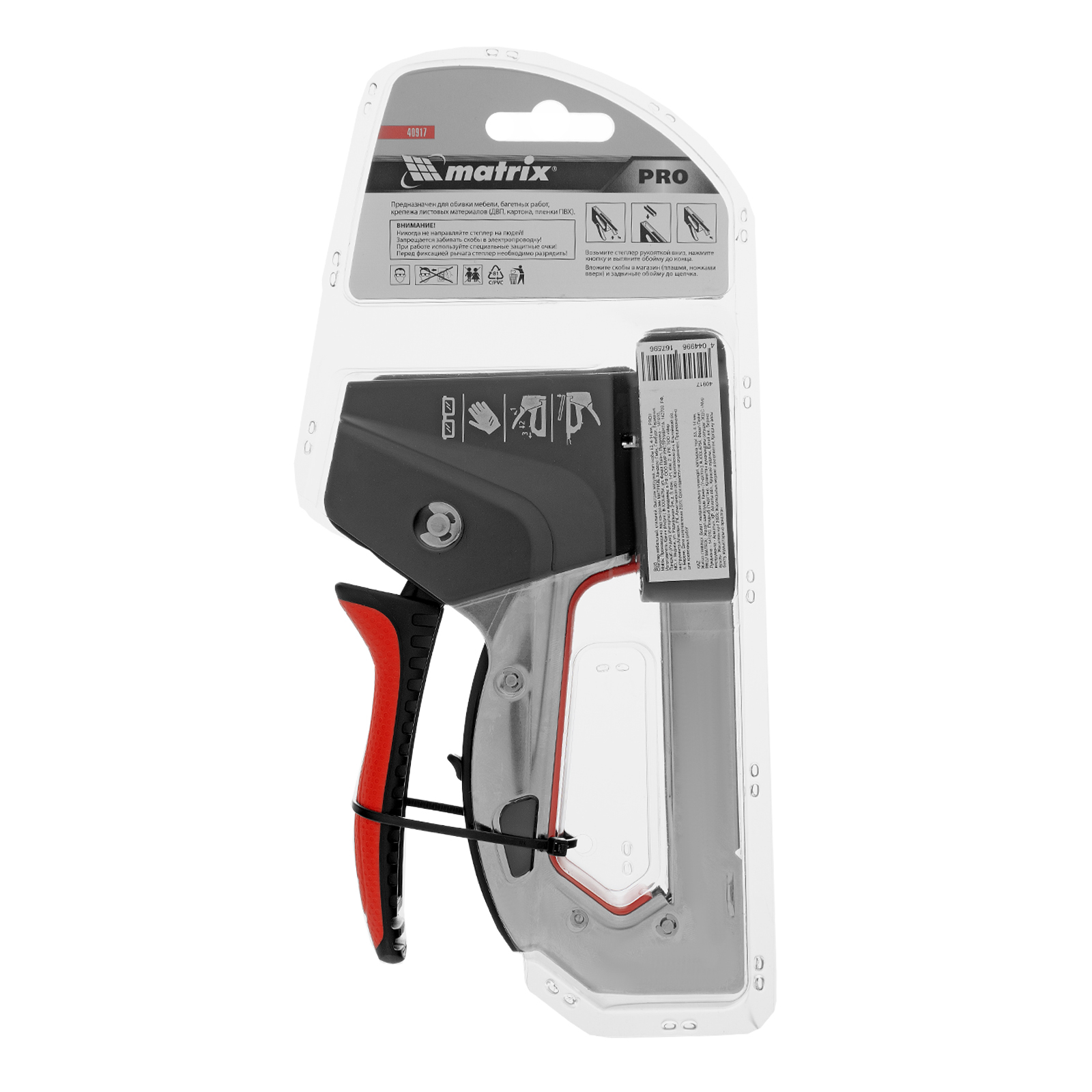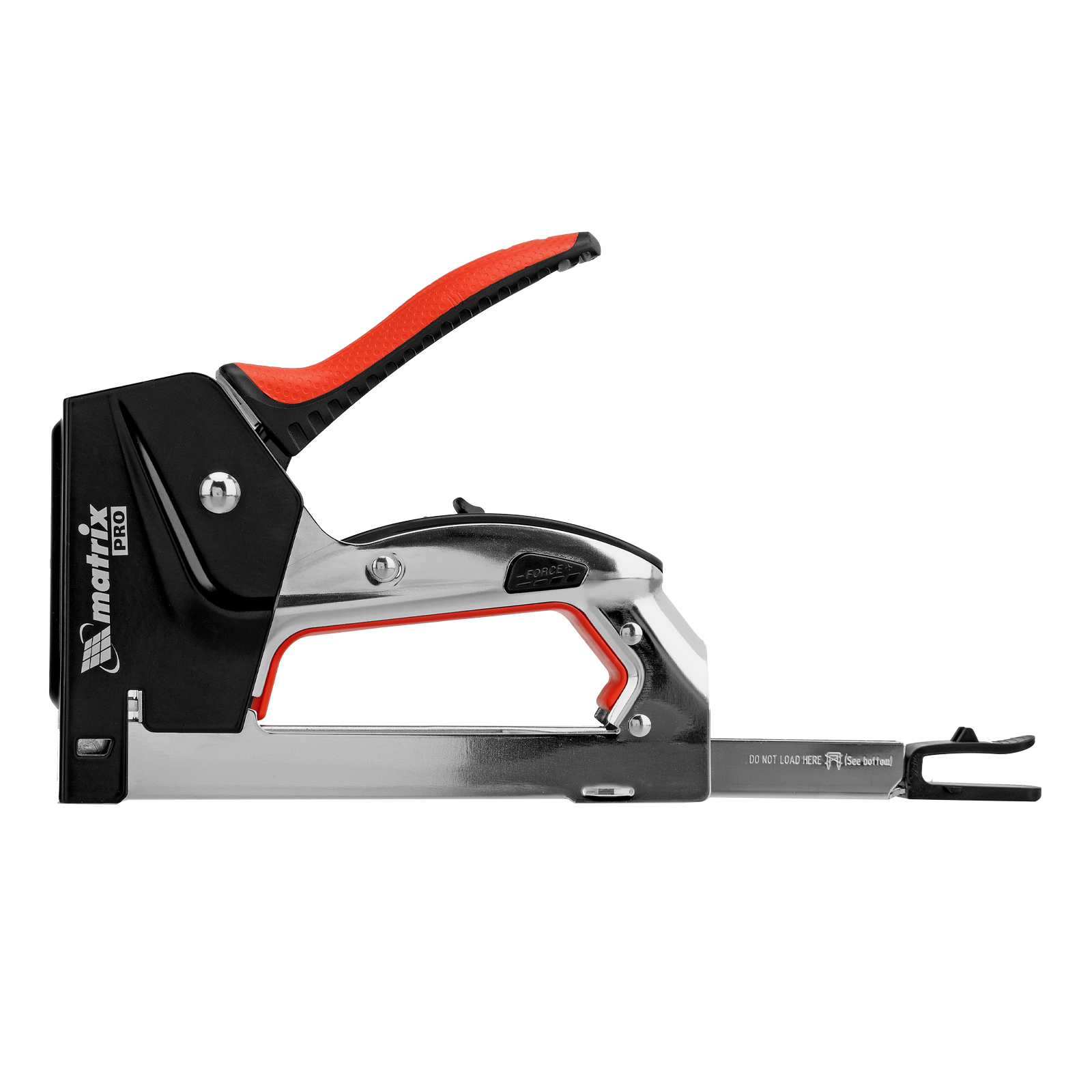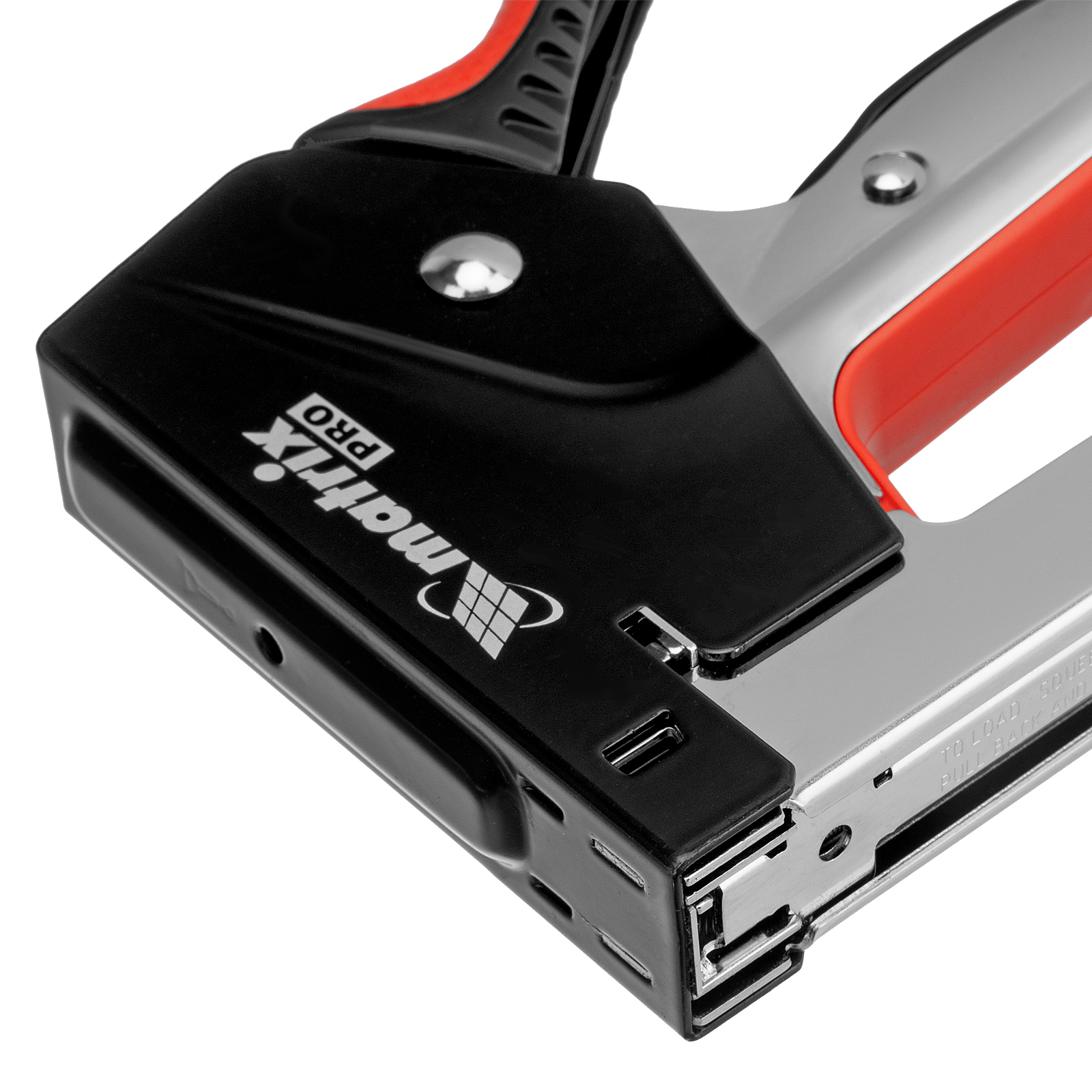 Стальной мебельный степлер Matrix PRO 40917 с механизмом быстрой загрузки скоб помогает быстро закрепить на деревянном основании фанеру, оргалит, ДВП, ДСП, ПВХ-пленку или теплоизоляционный материал с помощью скоб 53 размером 4-14 мм. Двухпозиционный регулятор силы удара позволяет устанавливать глубину забивания скобы в зависимости от твердости скрепляемых материалов. Инструмент подходит для сборки или обивки мебели, укладки ковровых покрытий, проведения ремонтных и отделочных работ.