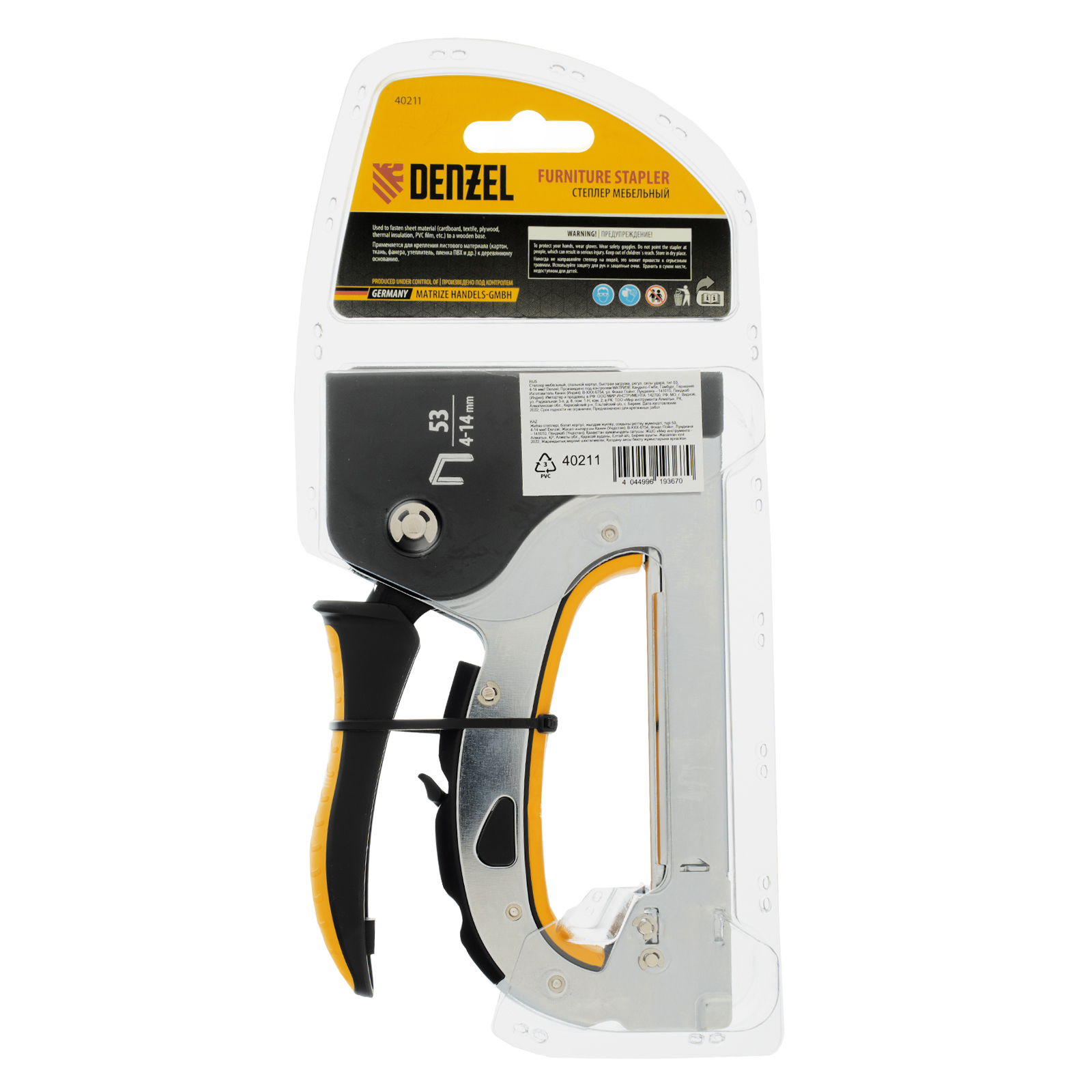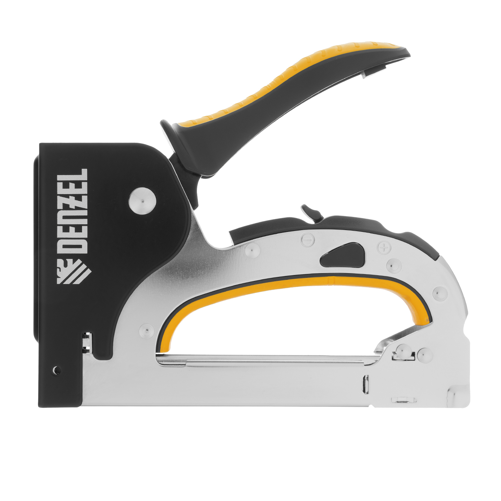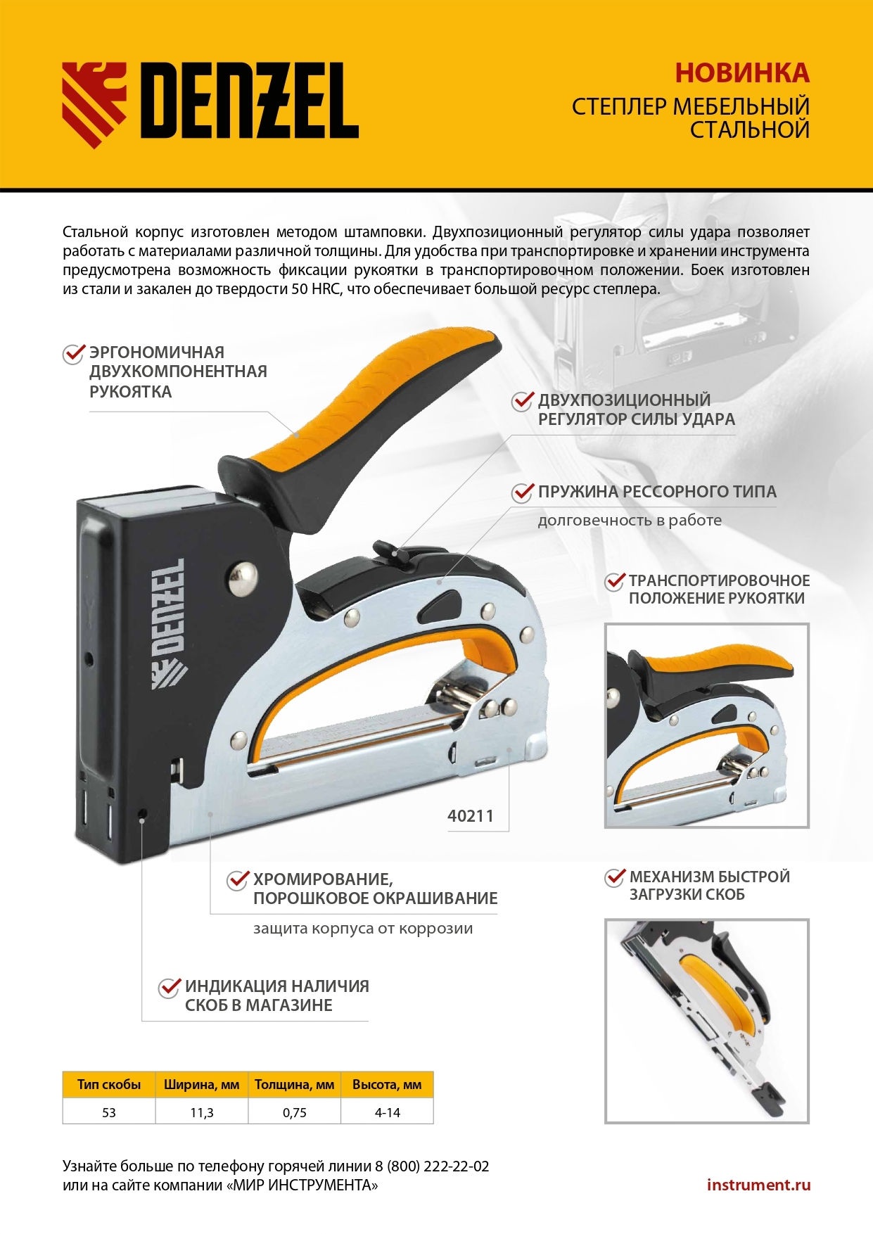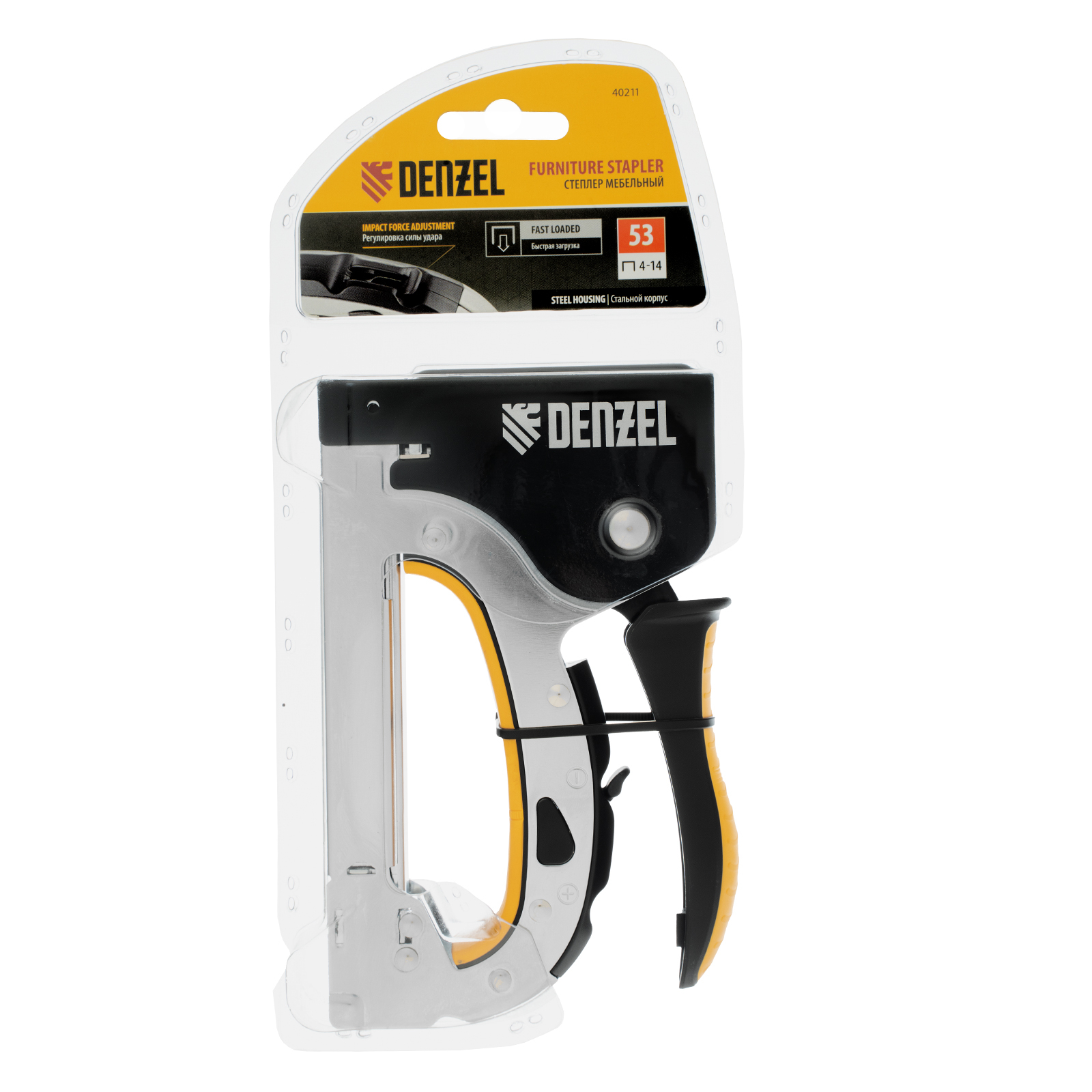 Мебельный степлер Denzel 40211 со стальным корпусом, регулировкой силы удара и функцией быстрой загрузки работает со скобами типа 53 размером 4-14 мм. Используется для фиксации на деревянном основании фанеры, ДВП, оргалита, ткани, утеплителя. Силу удара можно регулировать в зависимости от толщины материала, что обеспечивает высокое качество работ. Степлер будет полезен для обивки мебели, пригодится во время ремонта.