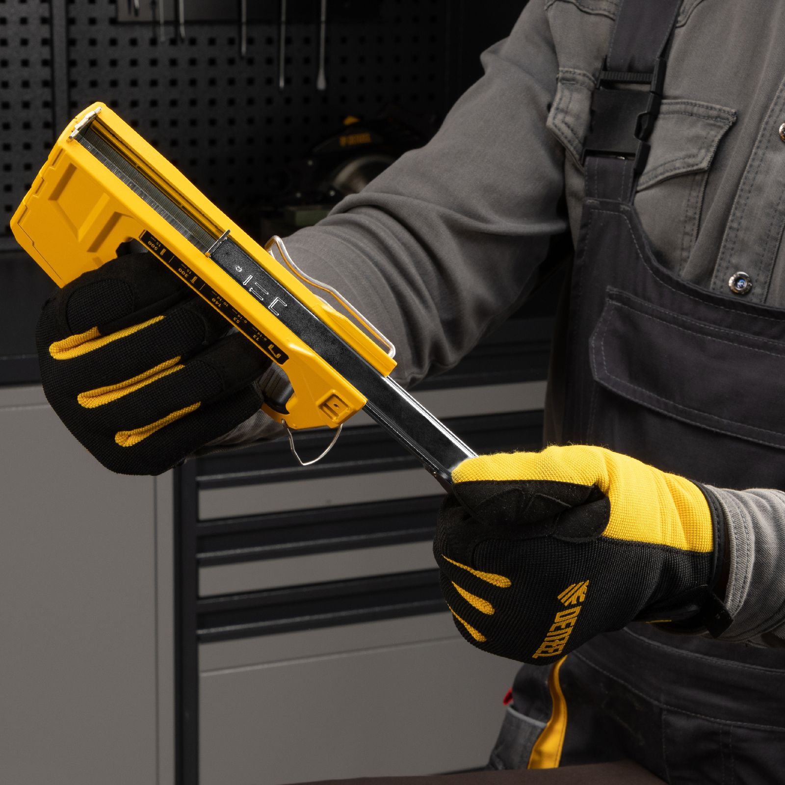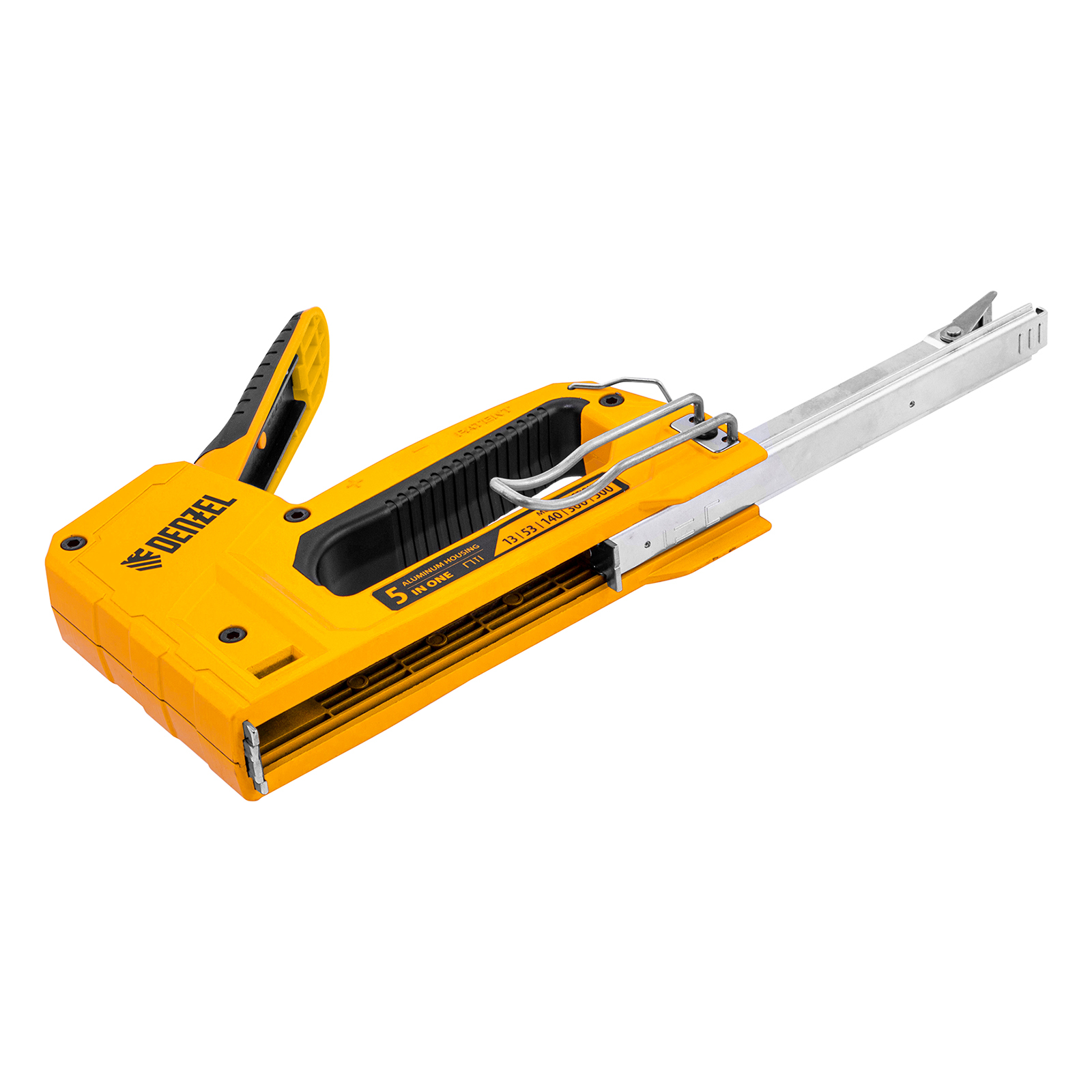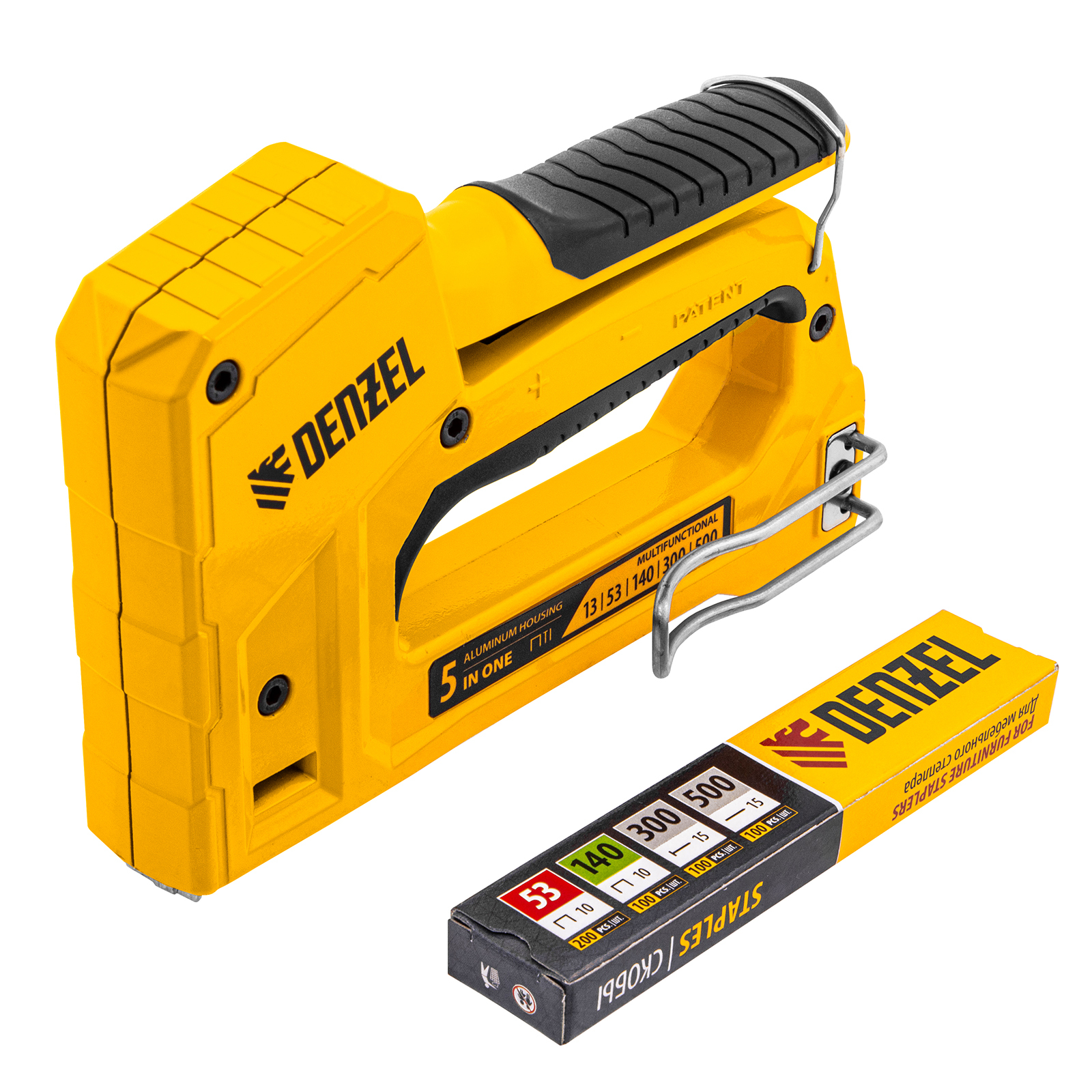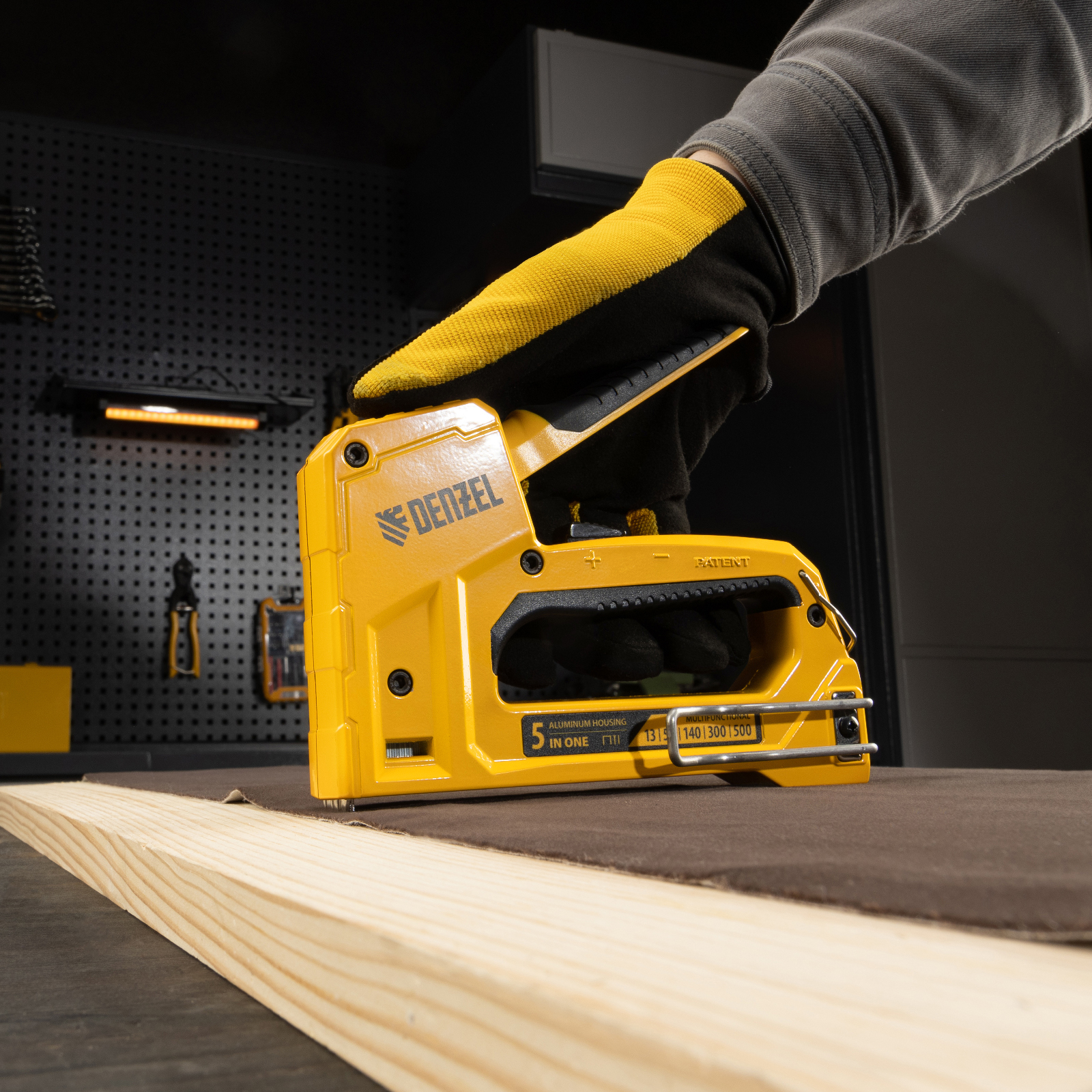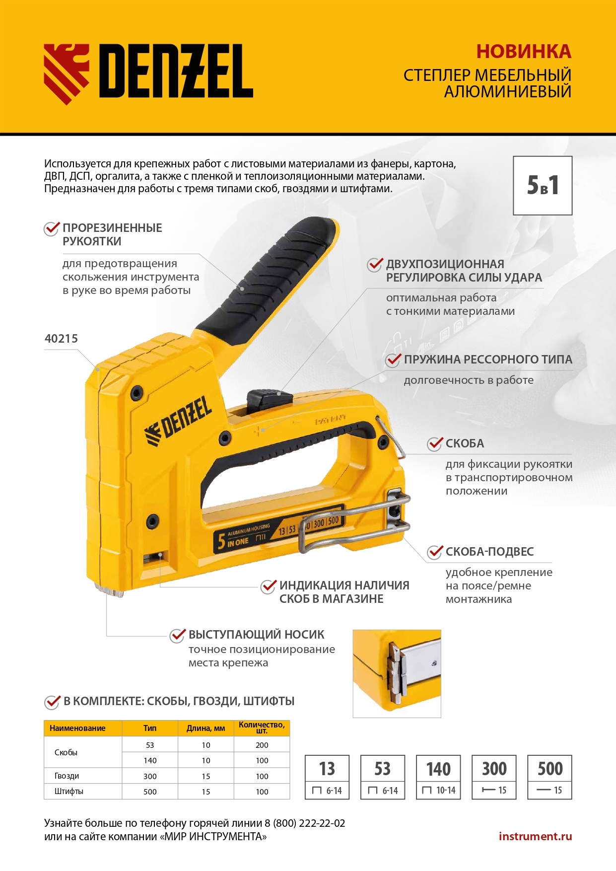 Мебельный степлер Denzel 40215 совместим со скобами типа 53 и 13 размером 6-14 мм, типа 140 размером 10-14 мм, а также с гвоздями типа 300 размером 15 мм и штифтами типа 500 размером 15 мм. Предназначен для фиксации листовых материалов на деревянном основании. Используется для крепления фанеры, ДСП, ДВП, картона, оргалита, изоляционного материала, а также для укладки напольных покрытий, обивки мебели и выполнения багетных работ.