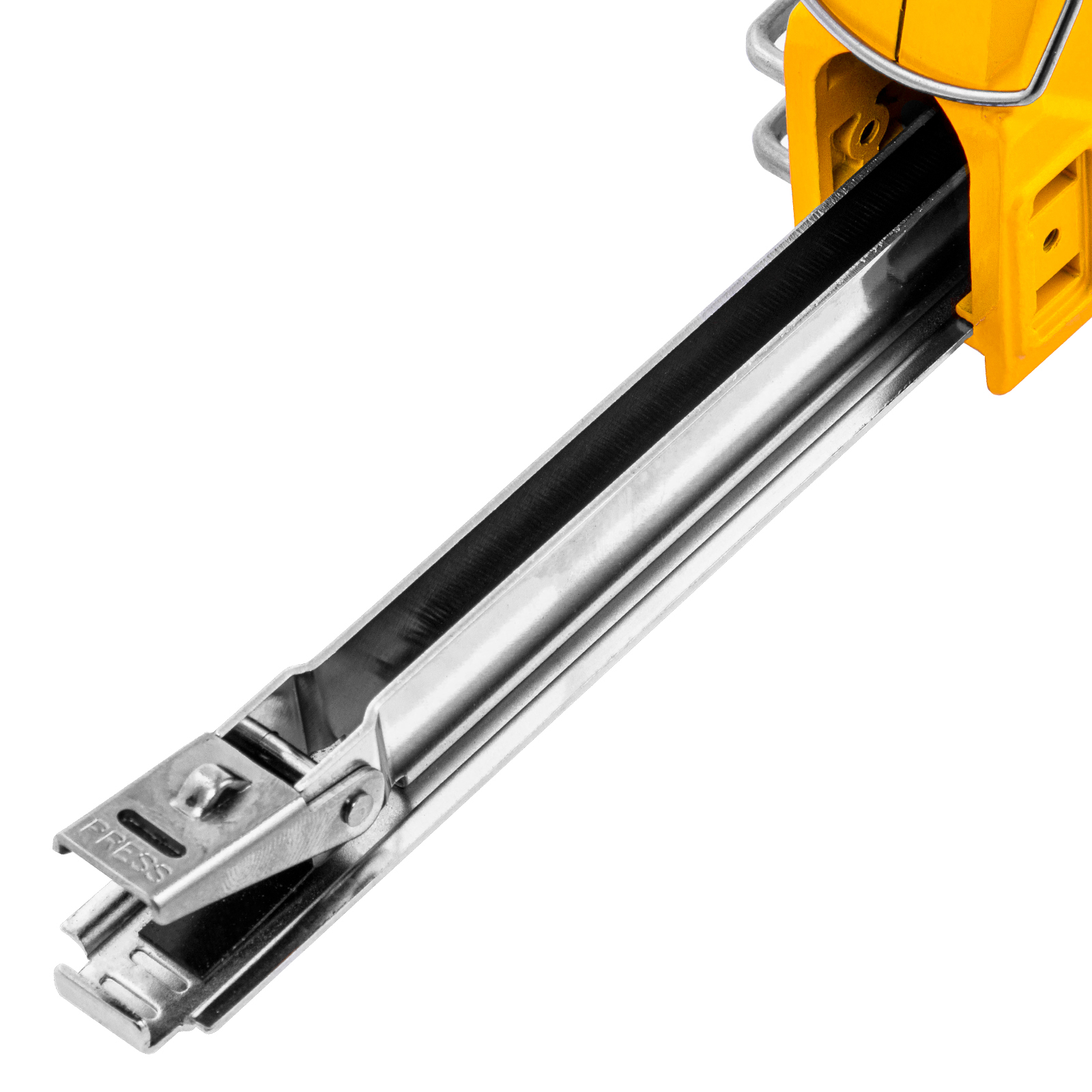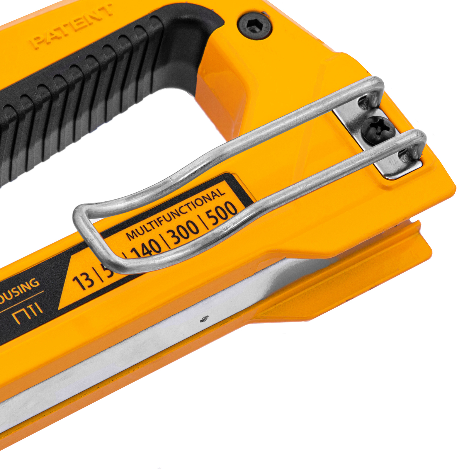 - Эргономичность — прорезиненная рукоятка не скользит в руке, а специальная скоба-подвес позволяет закрепить степлер на ремне или поясе монтажника.