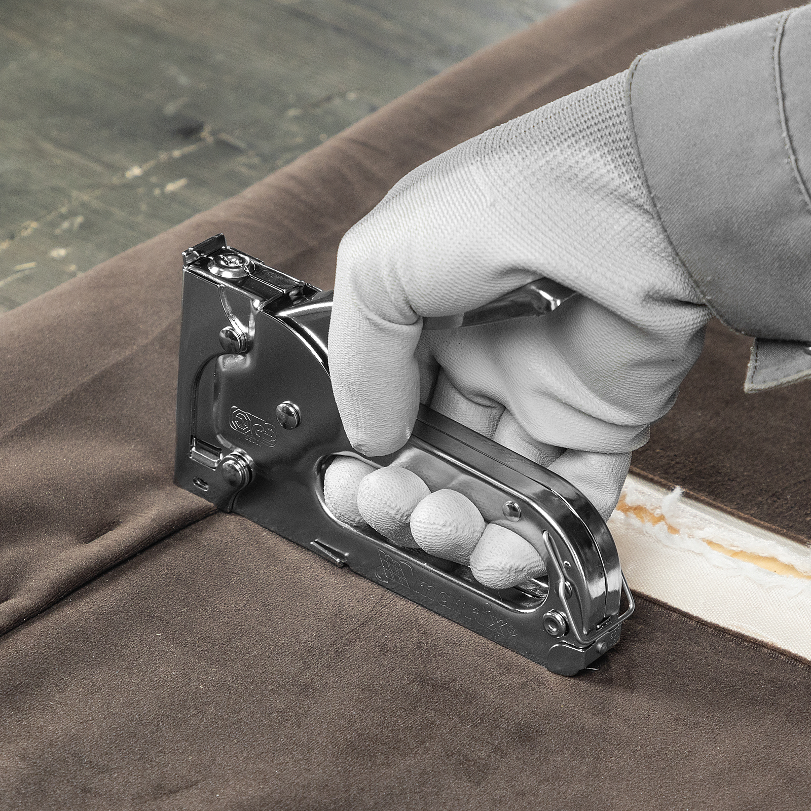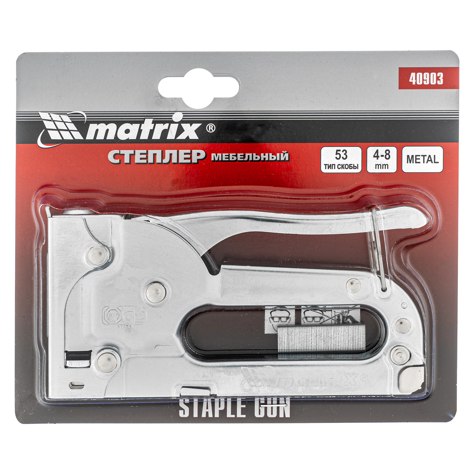 Мебельный степлер Matrix 40903 работает со скобами типа 53 размером 4-8 мм и предназначен для фиксации на деревянном основании тонких листовых материалов — оргалита, ДВП, ДСП, фанеры, пленки или утеплителя. Будет полезен в быту для перетяжки мебели или сборки шкафов. Степлер поставляется со скобами в количестве 50 штук.