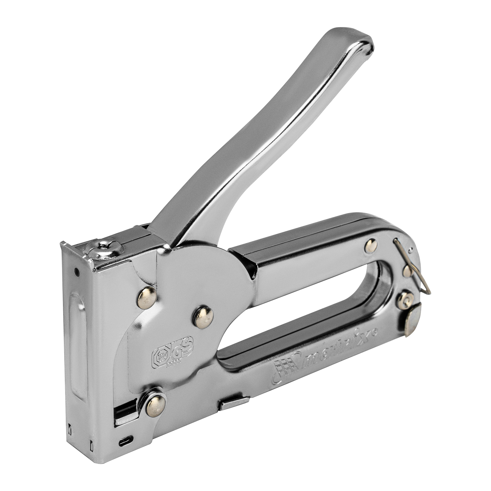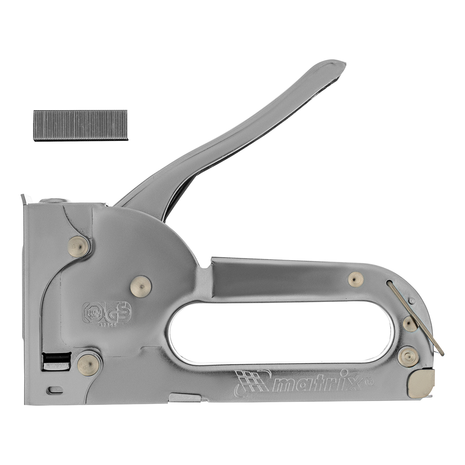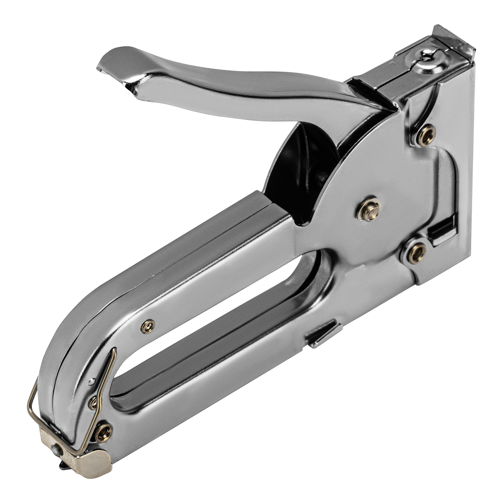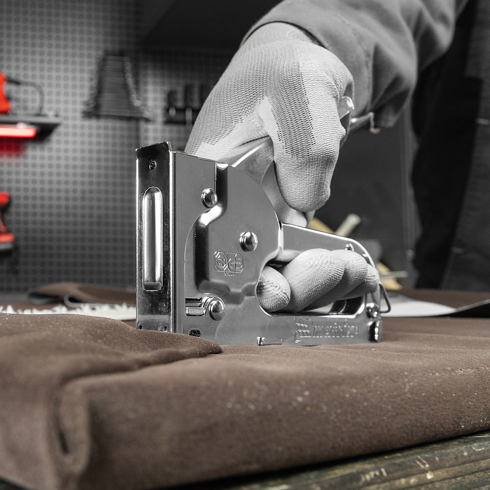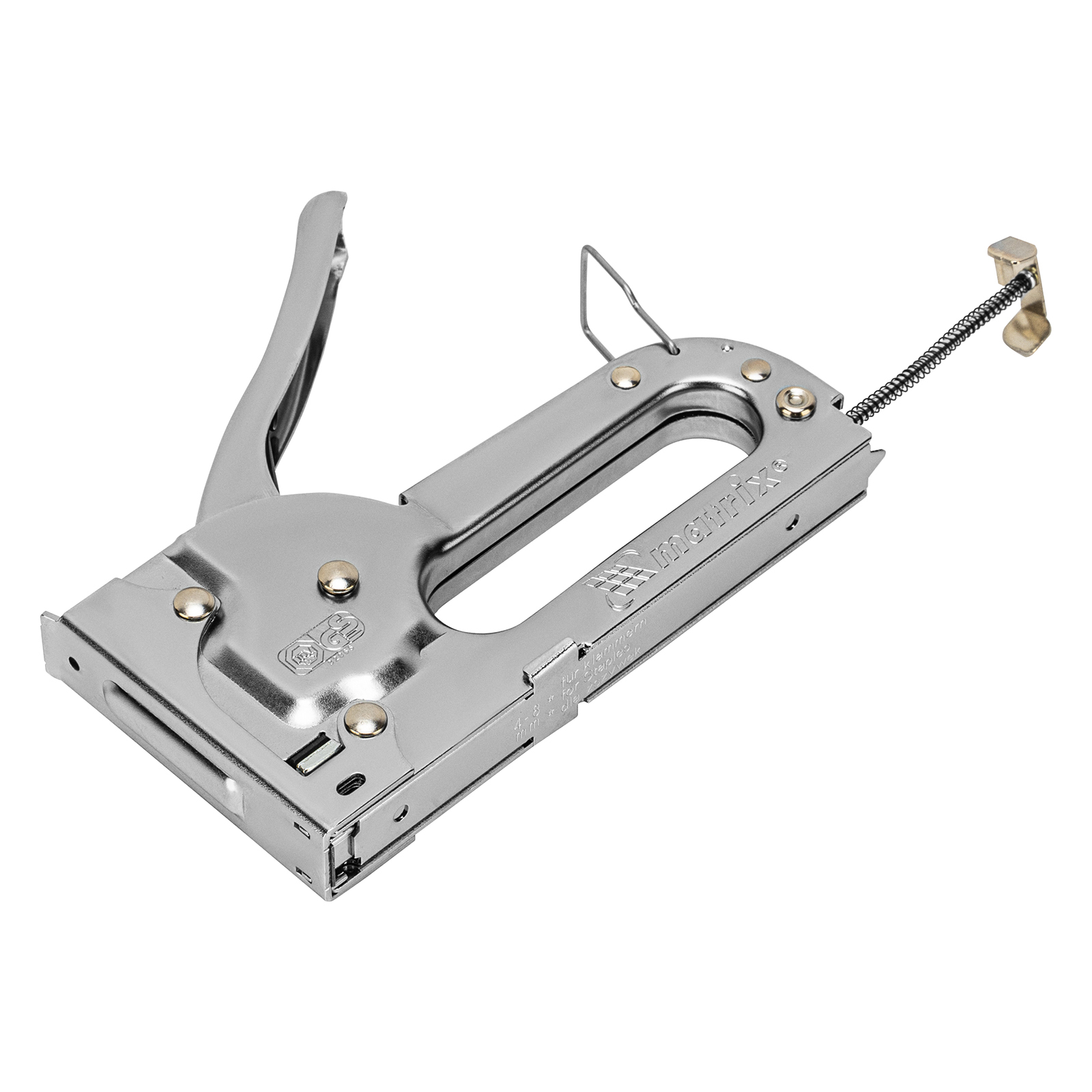 - Безопасное хранение и транспортировка — накидная скоба фиксирует рукоятку, предотвращая случайное срабатывание степлера.
