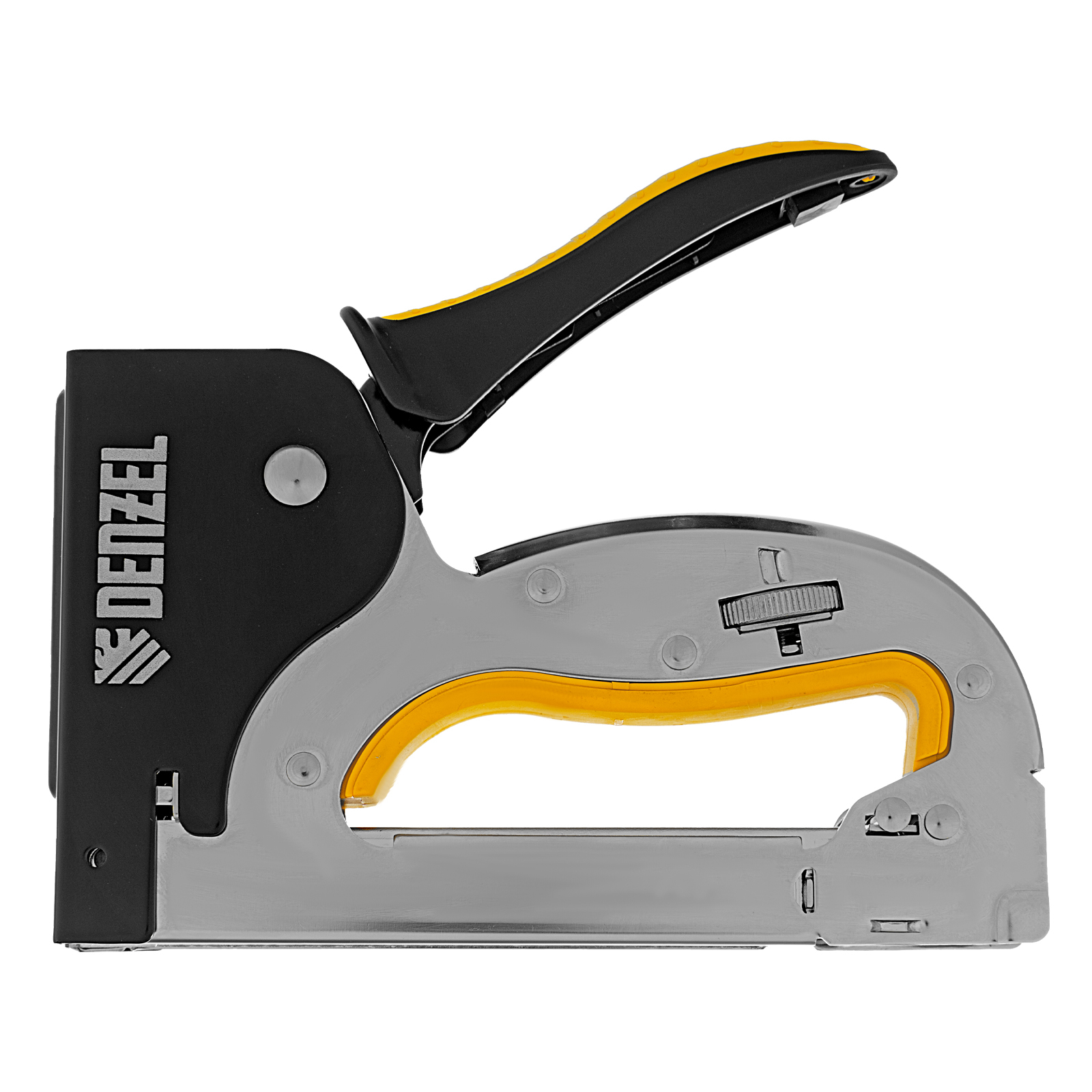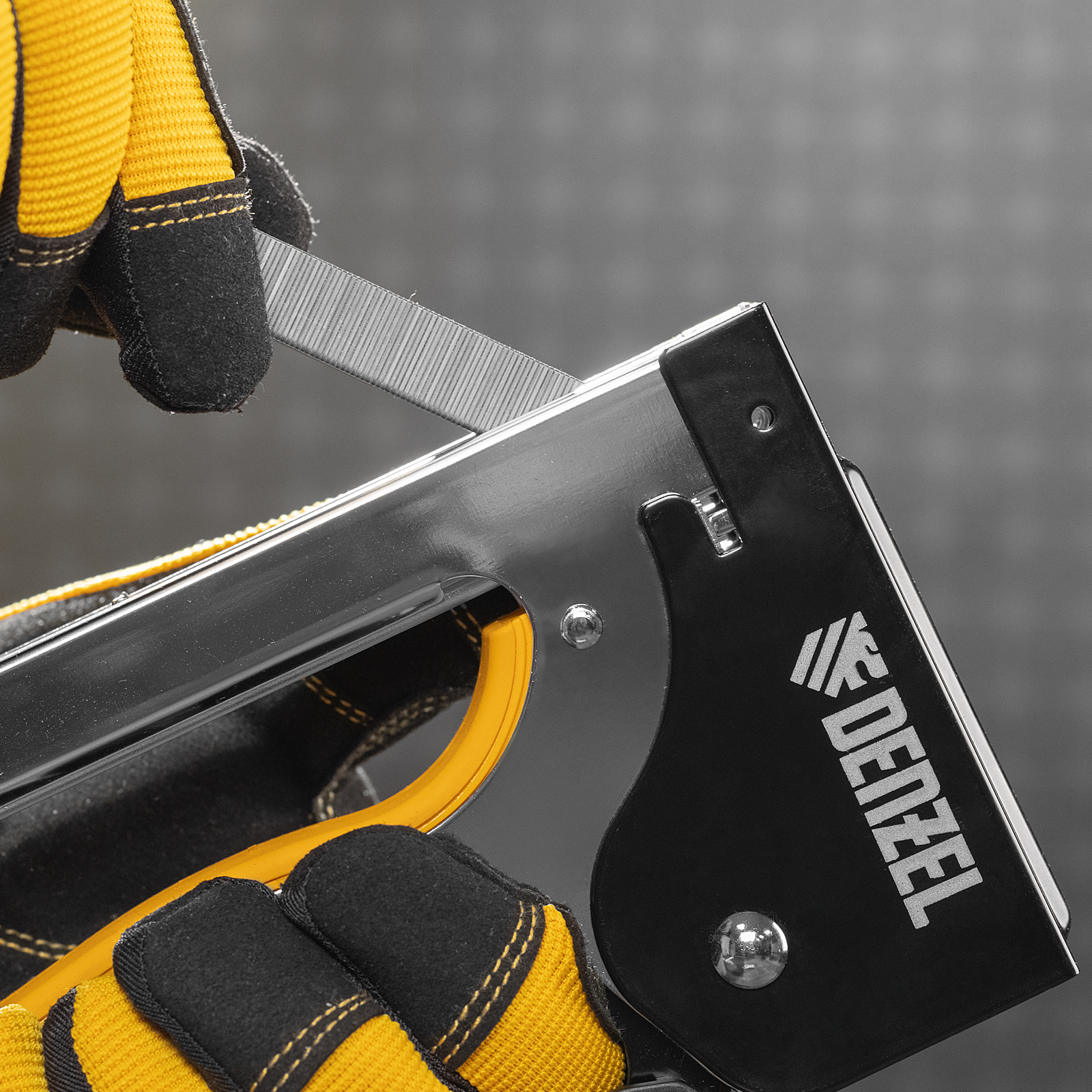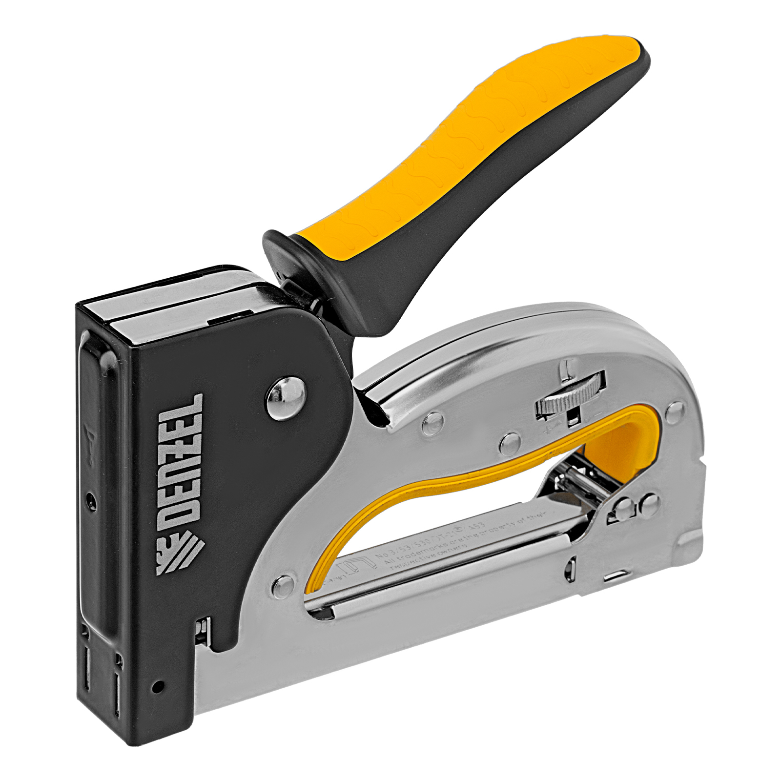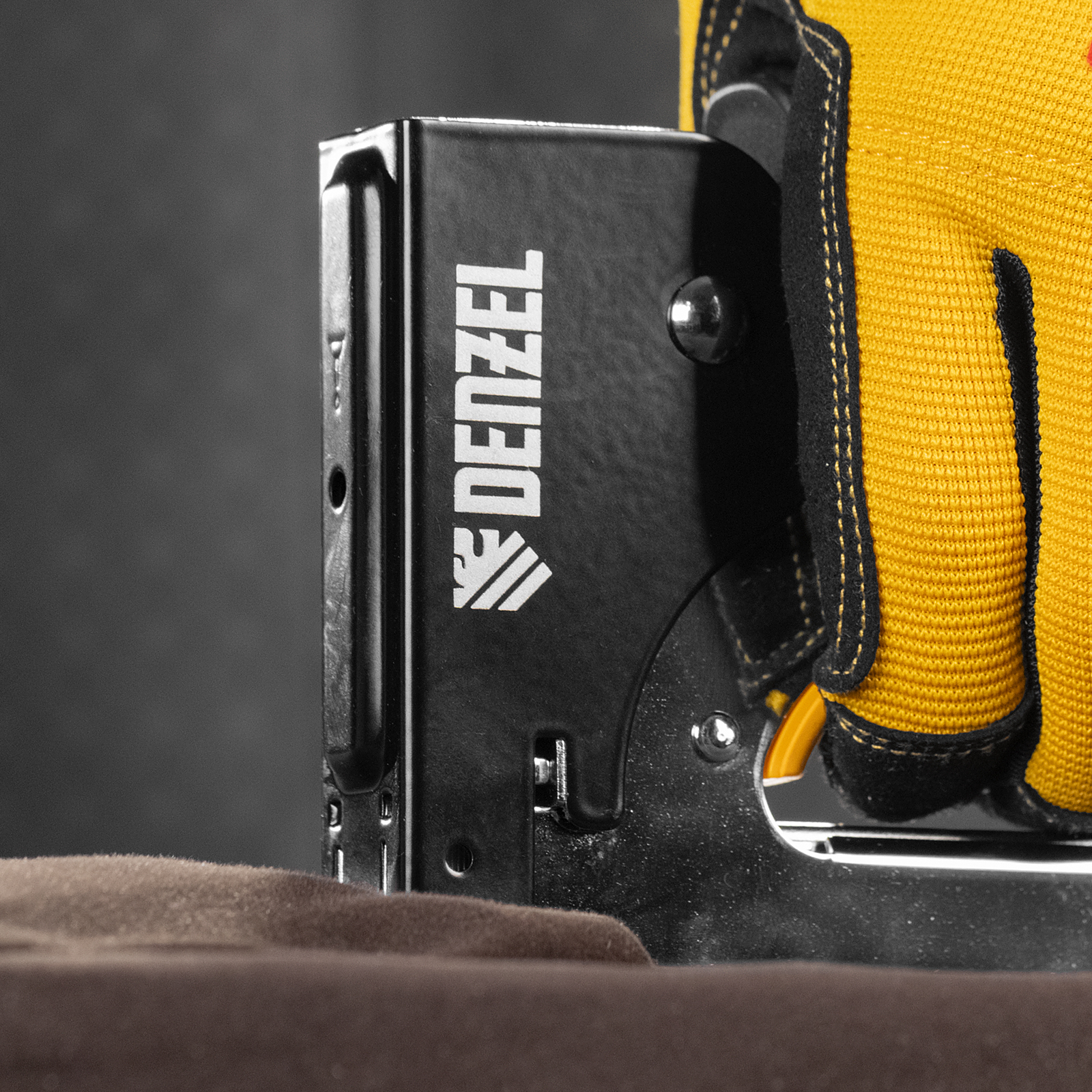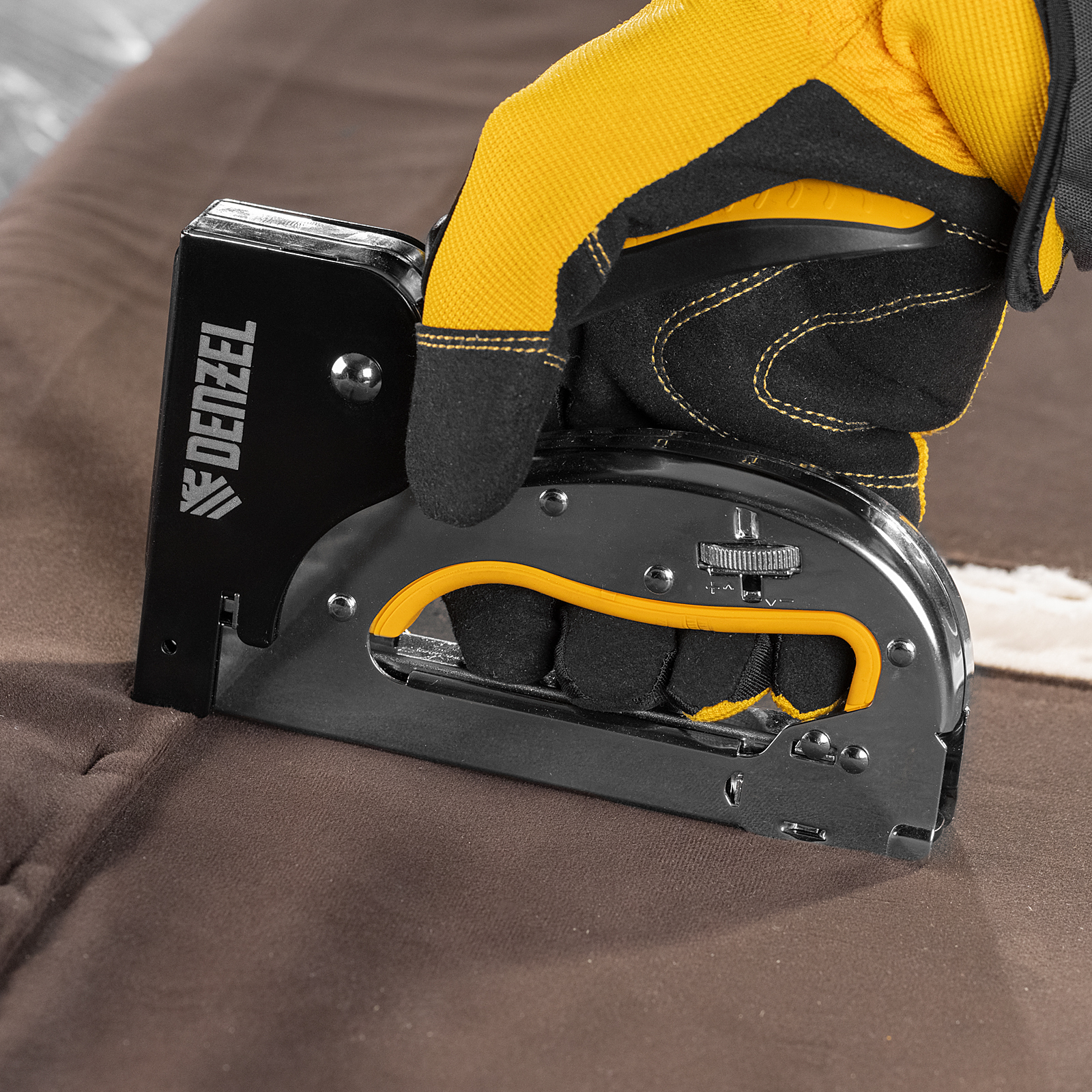 Металлический степлер Denzel 40223 с функцией плавной регулировки удара и двухкомпонентной рукояткой применяется для быстрого скрепления с деревянными основаниями листов фанеры, оргалита, ДСП, ДВП, картона или изоляционных материалов с помощью скоб типа 53 размером 4-14 мм. Инструмент подходит для частого использования, т. к. ударный механизм рессорного типа снижает усталость при длительной эксплуатации. Степлер пригодится во время сборки и обивки мебели, а также для проведения ремонтных работ.